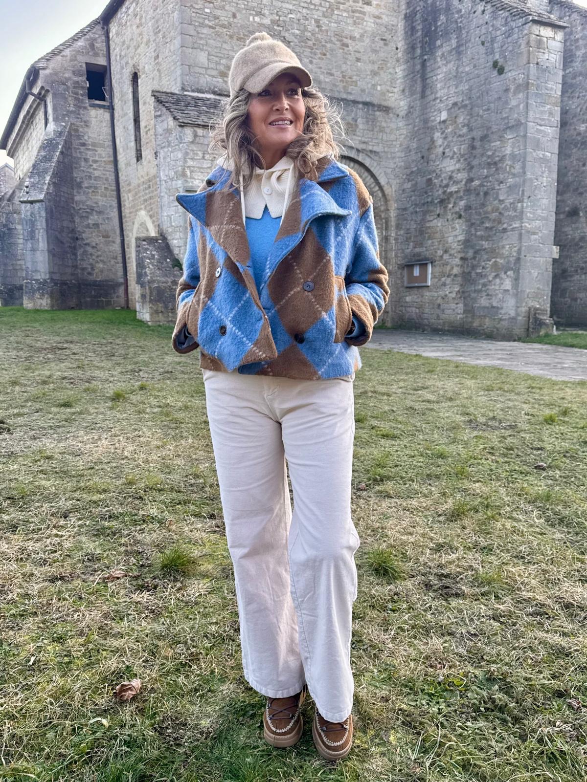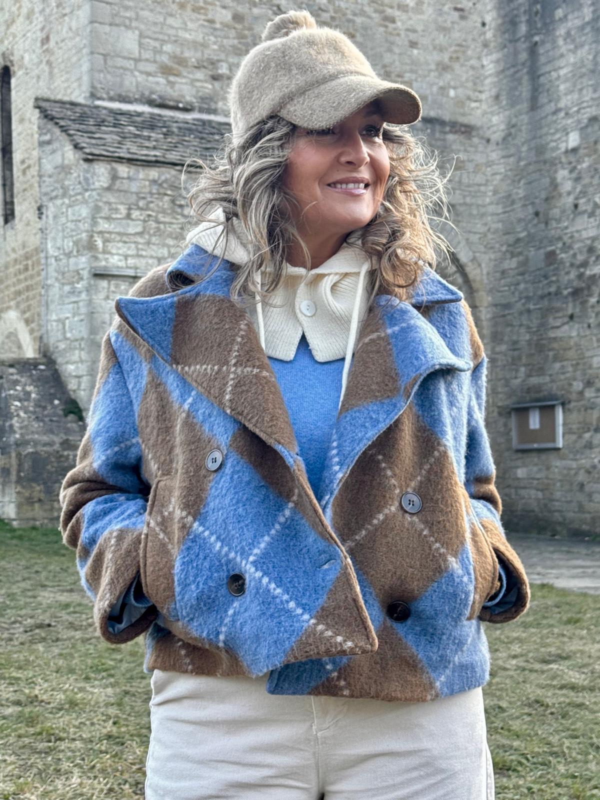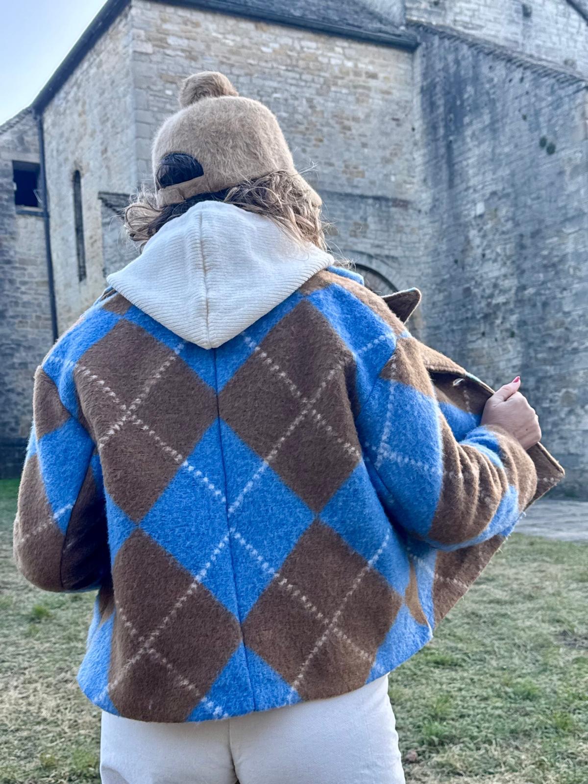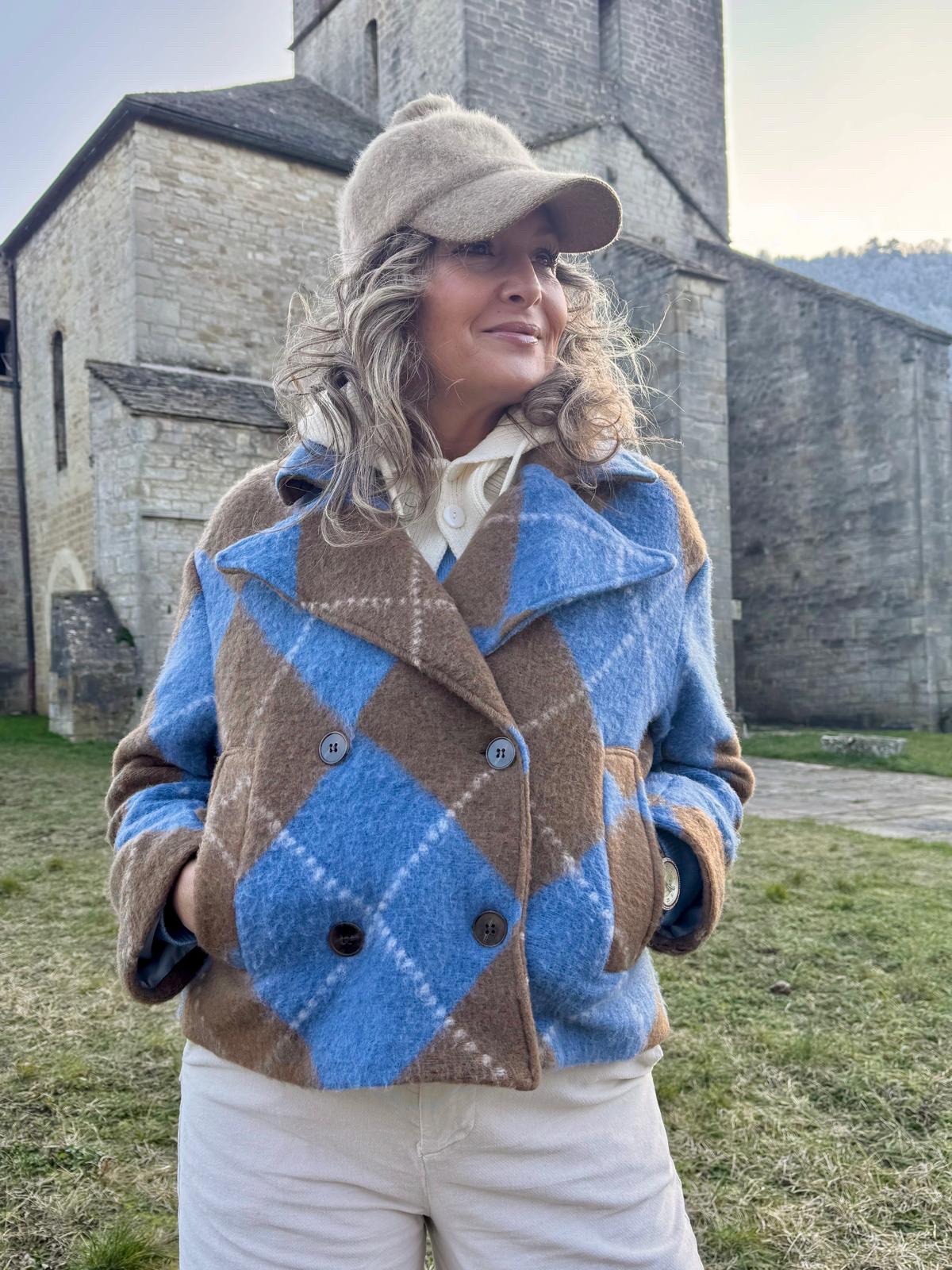 Este abrigo corto de paño es una prenda especial que destaca por su estampado de rombos en tonos camel, celeste y crudo, una combinación elegante y muy fácil de llevar. Su diseño aporta personalidad sin renunciar a la versatilidad, convirtiéndolo en un aliado perfecto para el día a día.