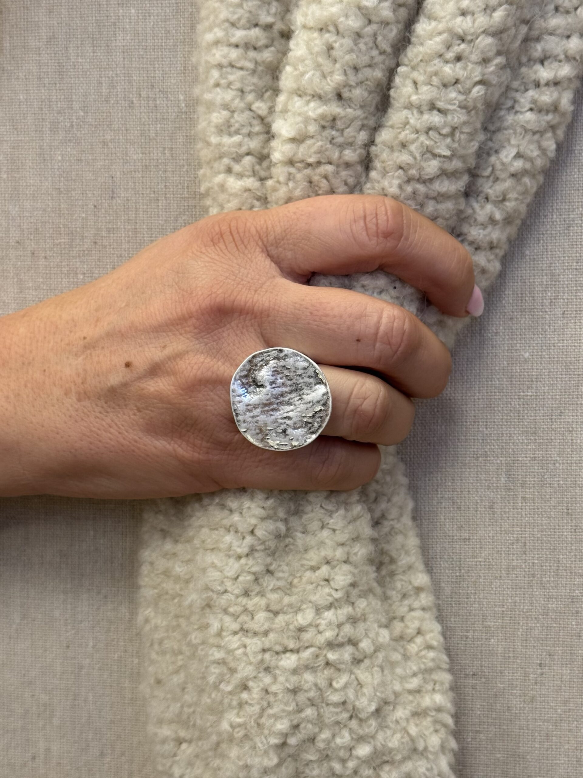 Este anillo plateado de diseño orgánico destaca por su estética contemporánea y su carácter artesanal. La pieza presenta un frente redondo con textura irregular, trabajado en metal pulido para crear un atractivo juego de relieves y reflejos que aportan profundidad y personalidad.
