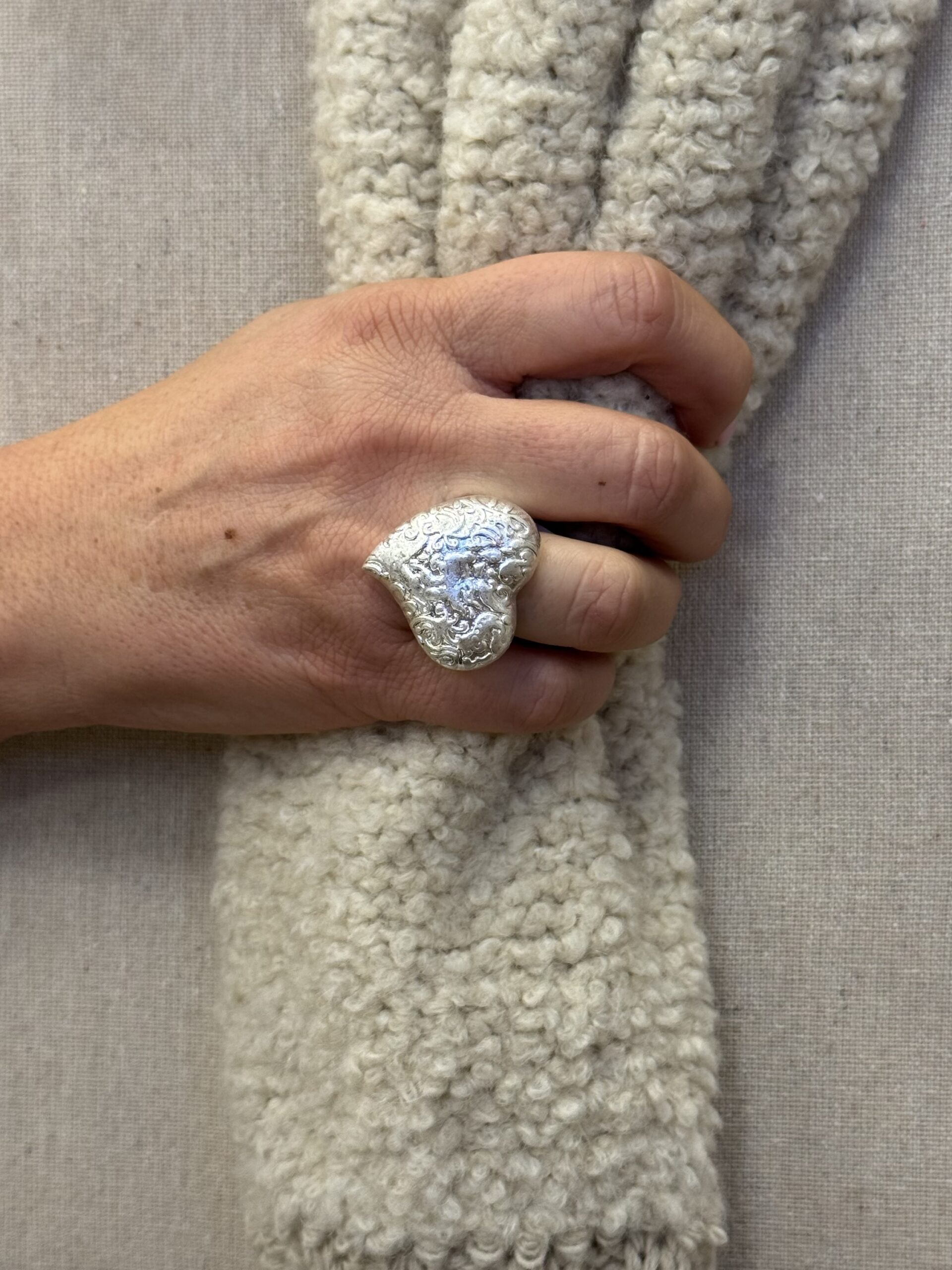 Este anillo plateado de gran presencia destaca por su delicada forma de corazón, reinterpretada desde un diseño orgánico y contemporáneo. Su superficie presenta un grabado en relieve que recorre toda la pieza, creando un rico juego de texturas y reflejos que aportan profundidad y sofisticación.