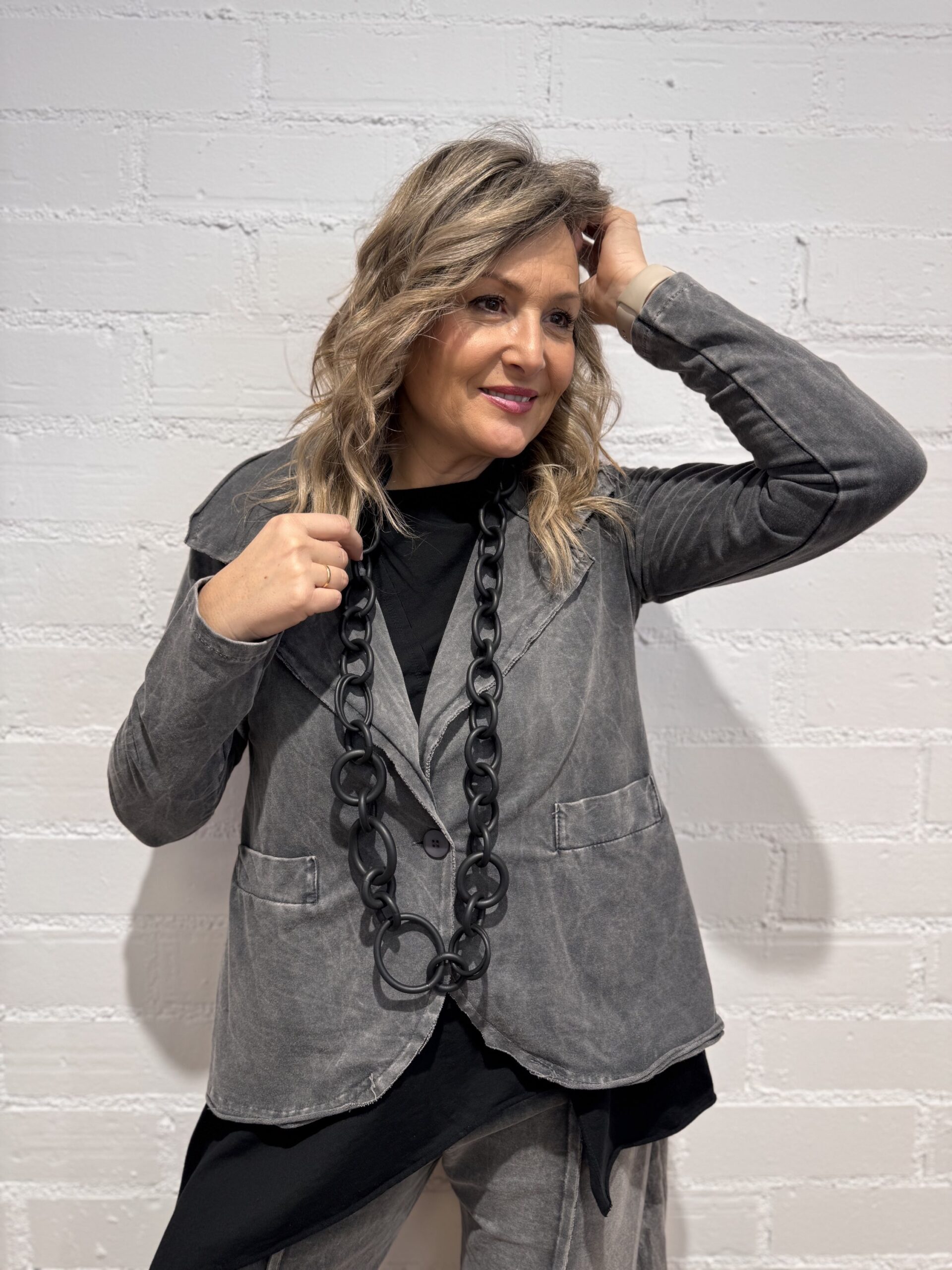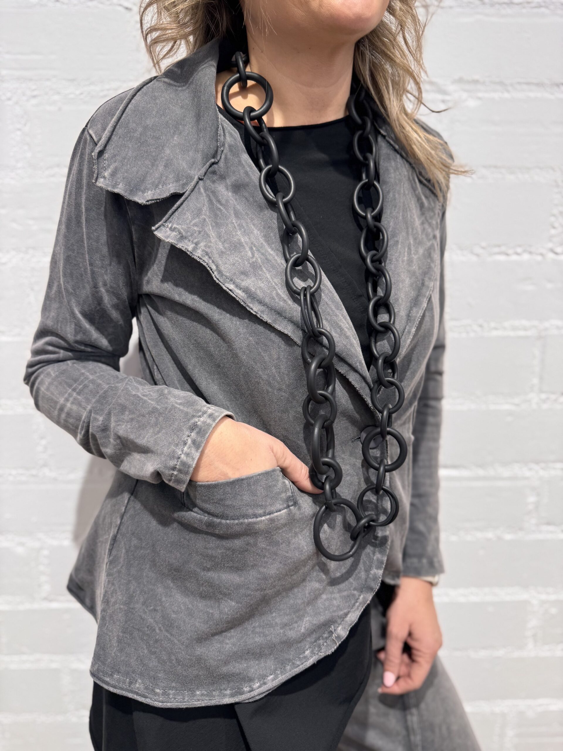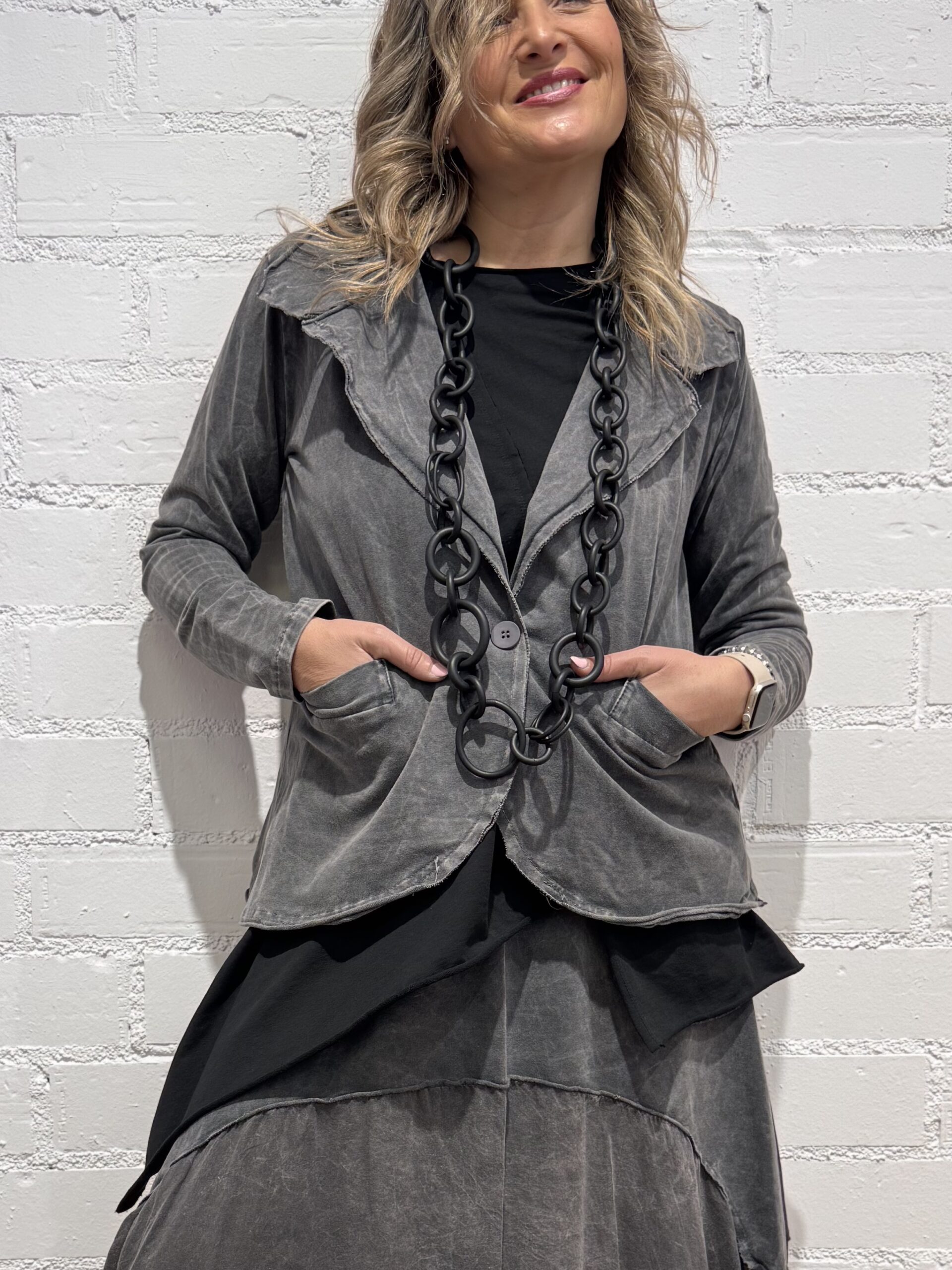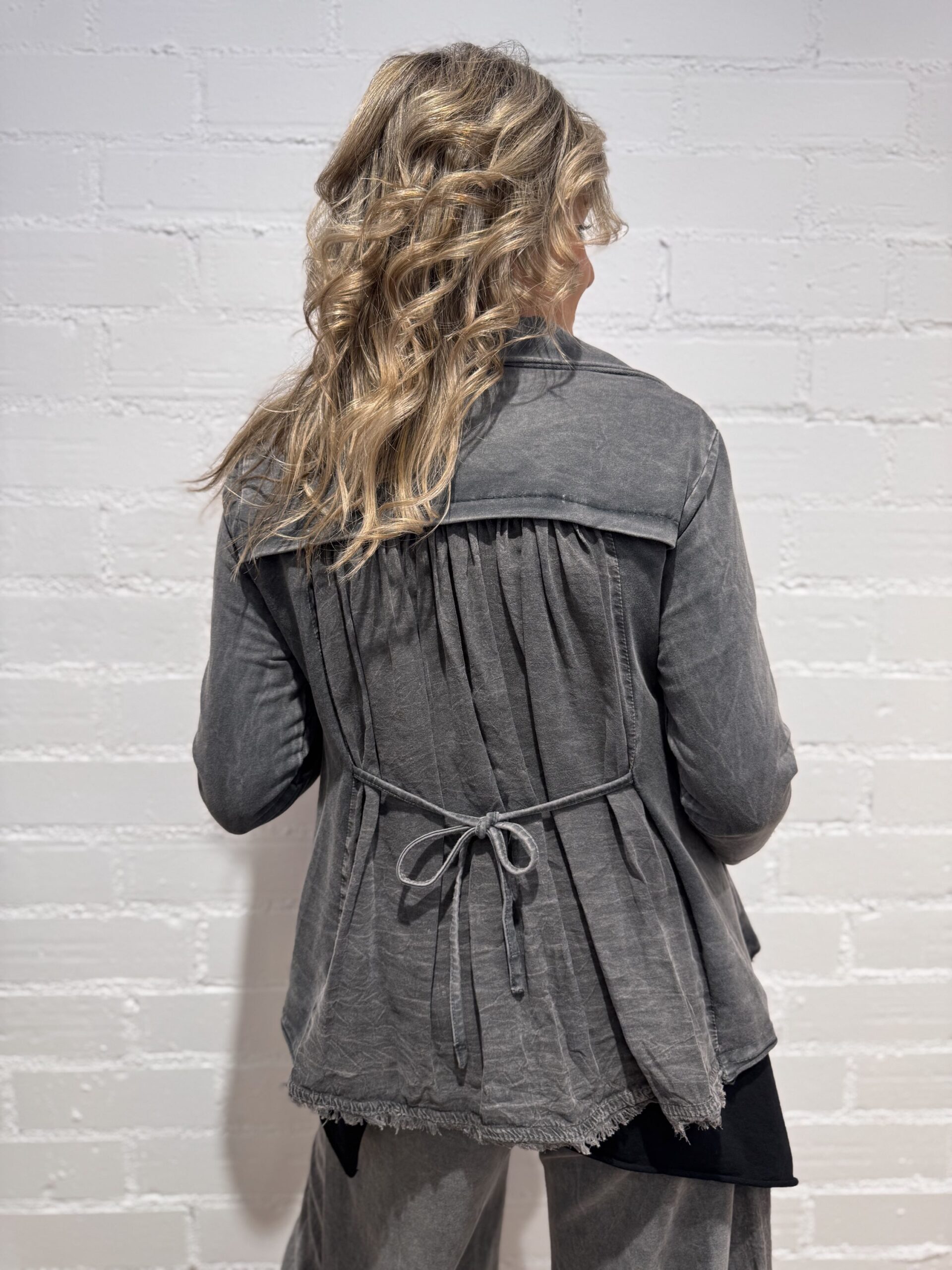 Blazer con efecto lavado, combinada en dos tejidos, ajustable por la espalda. Bolsillos.