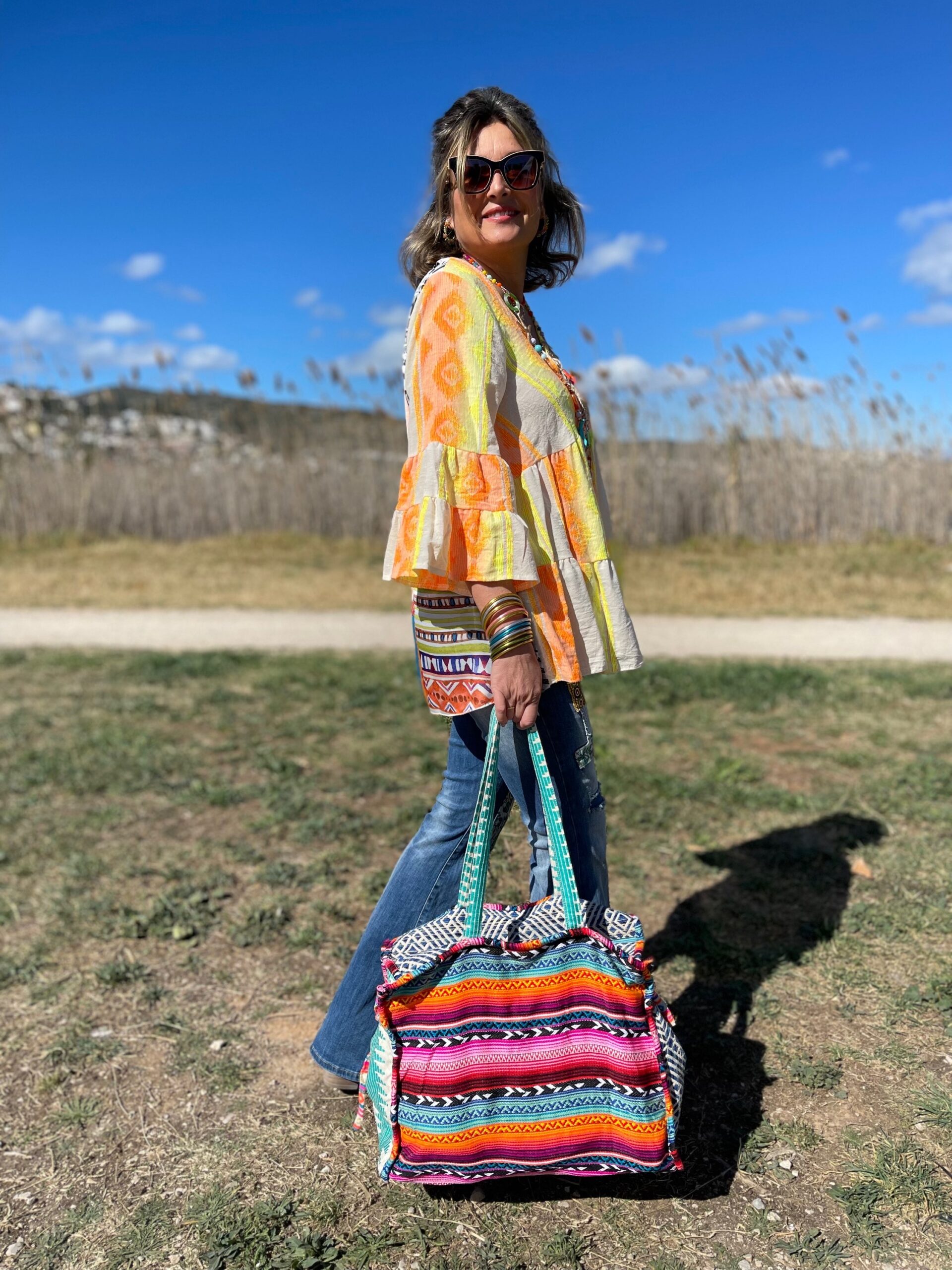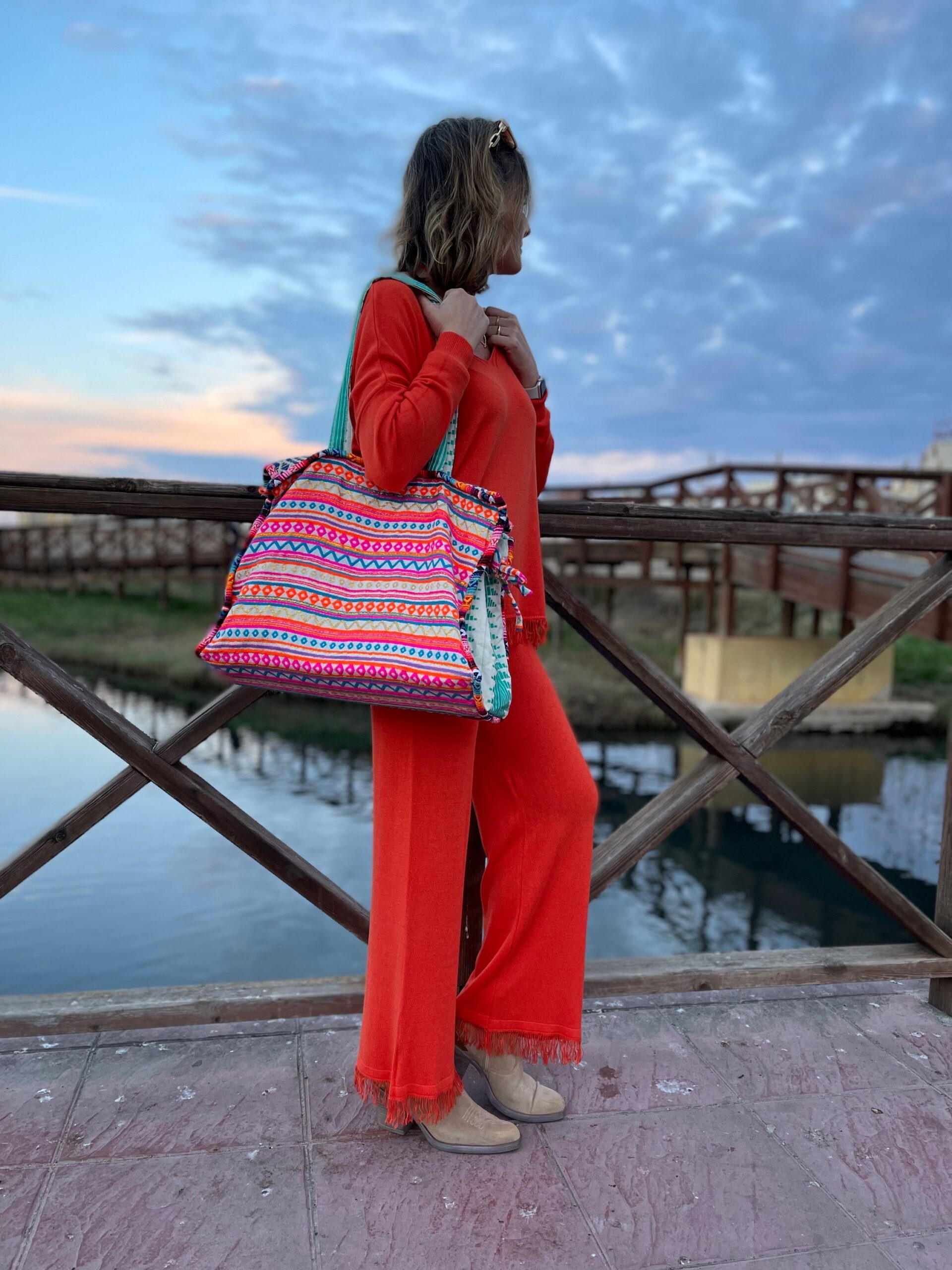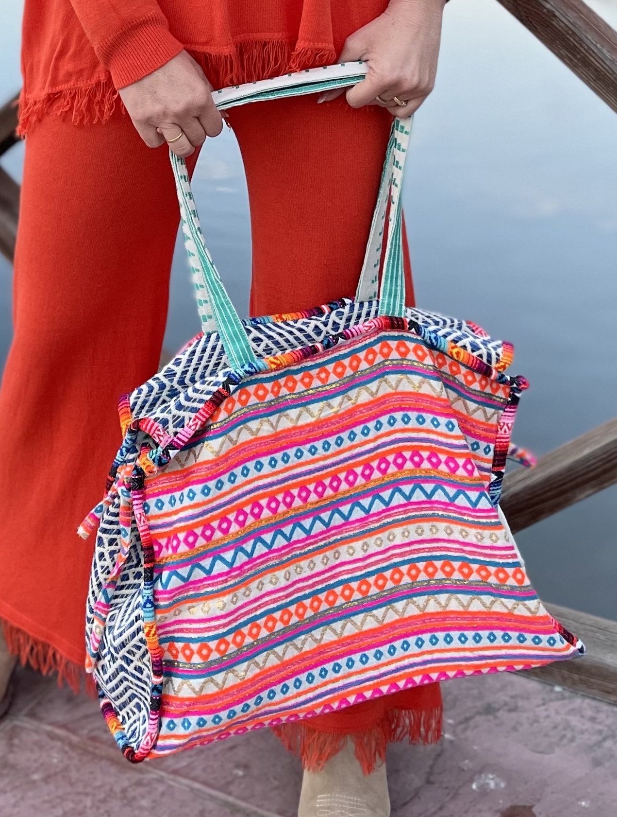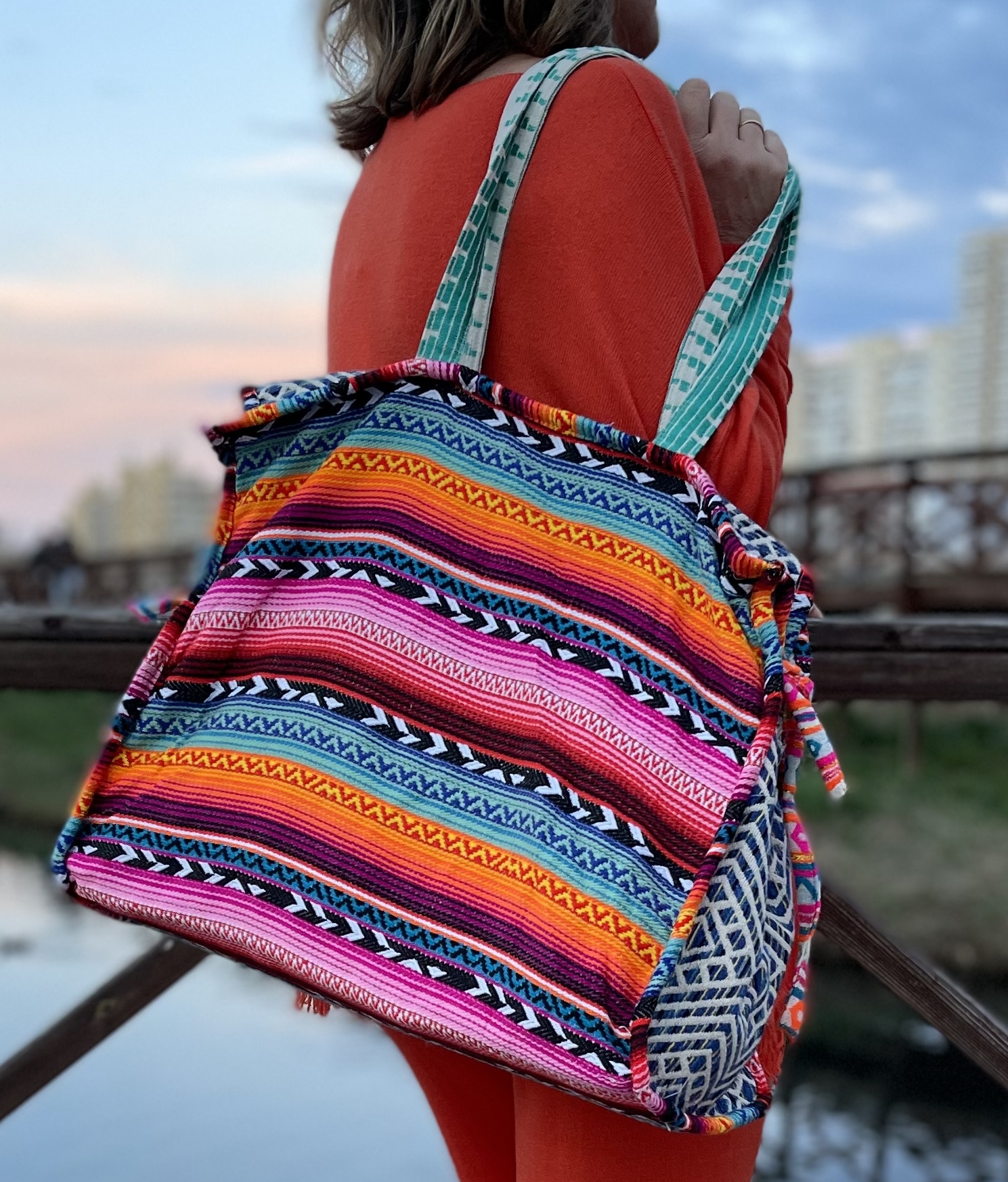 Bolso con animado colorido y dos estampados diferentes por cada lado. Cierre con cremallera.
