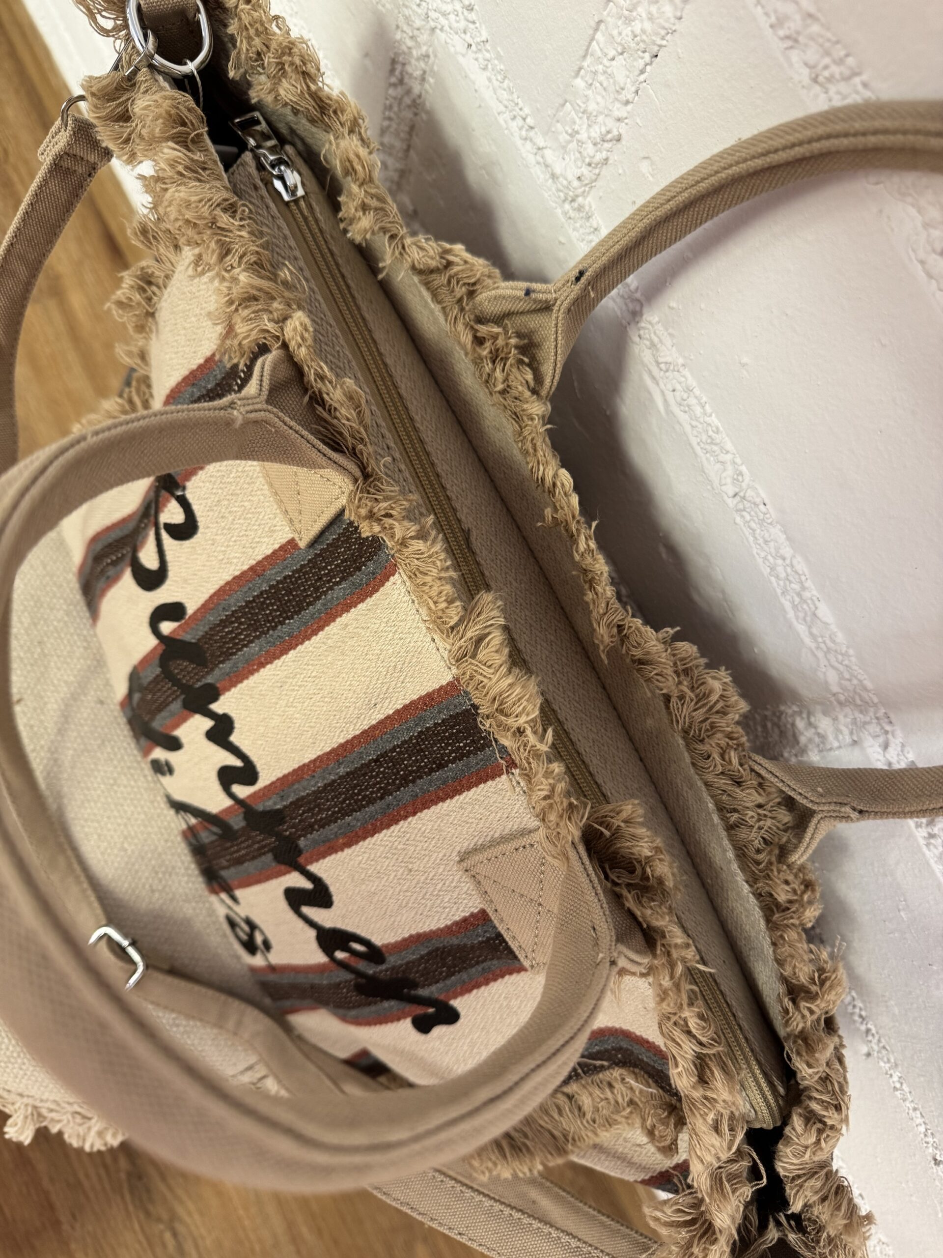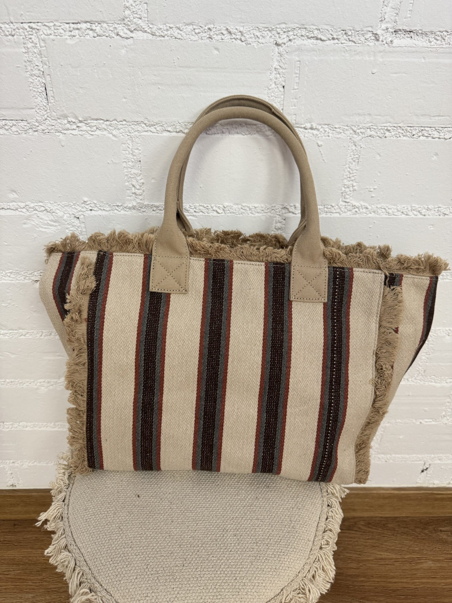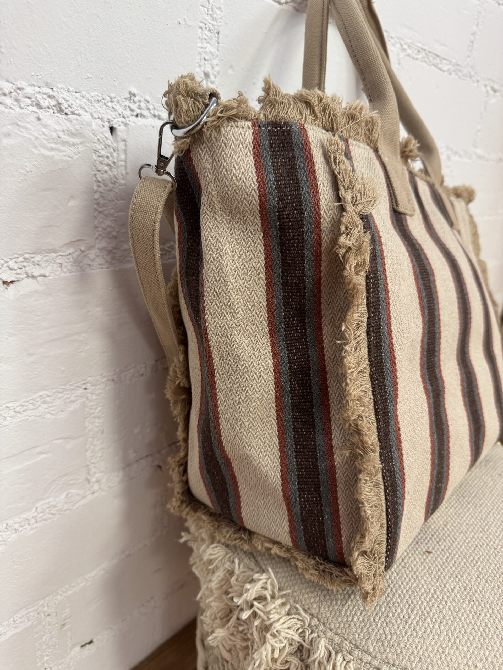 Bolso en tonos tierra de rayas y flecos muy combinable.