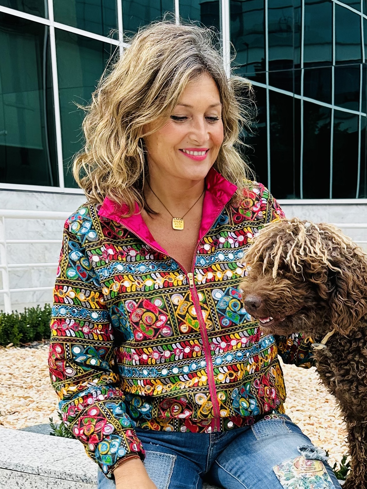 Bomber fantasía con bordados y espejos. Cierre con cremallera y forro interior