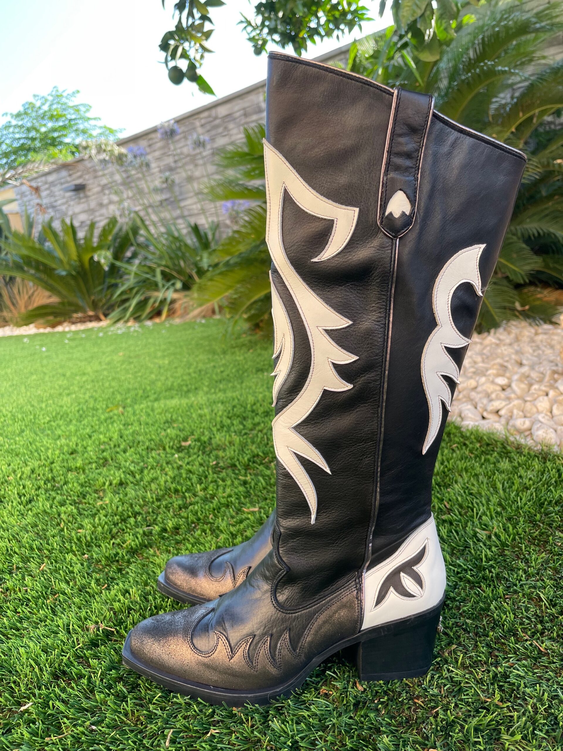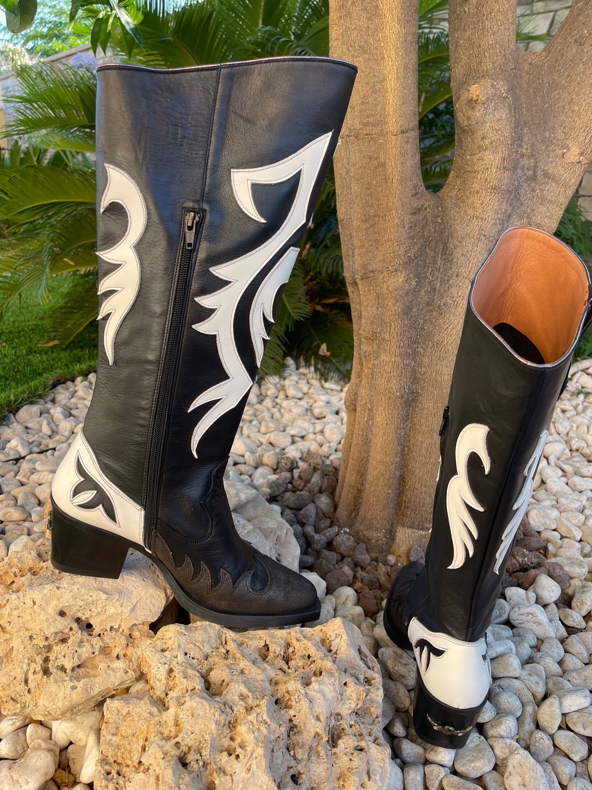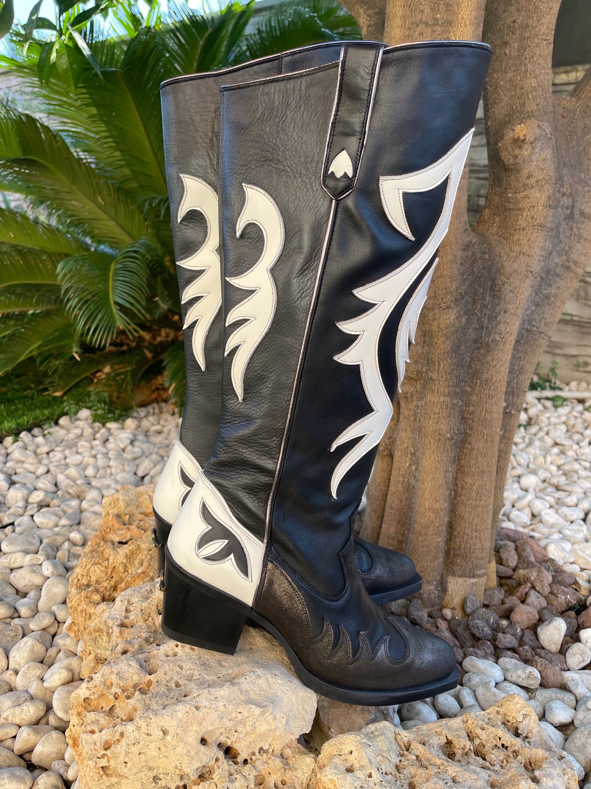 Bota de piel realizada artesanalmente en España. Combinada en diferentes colores. Cremallera en la parte interna. Tacón de 6 cm.