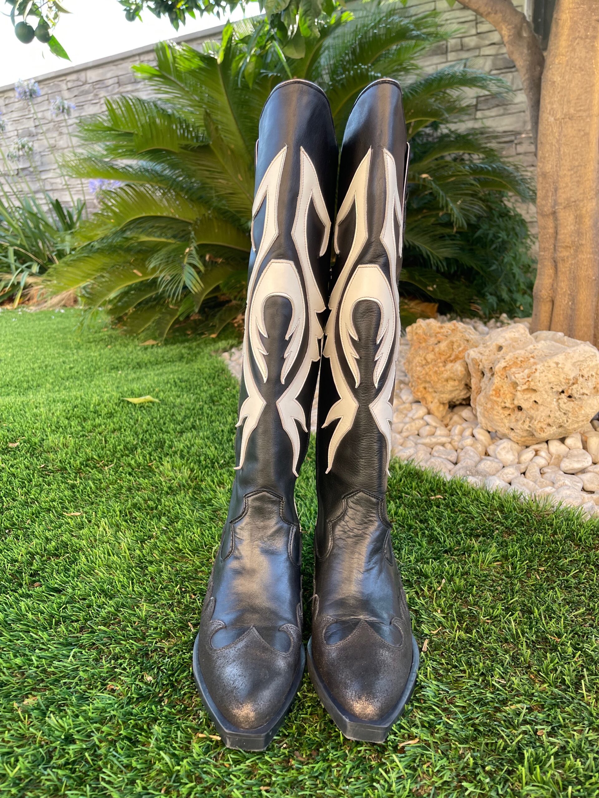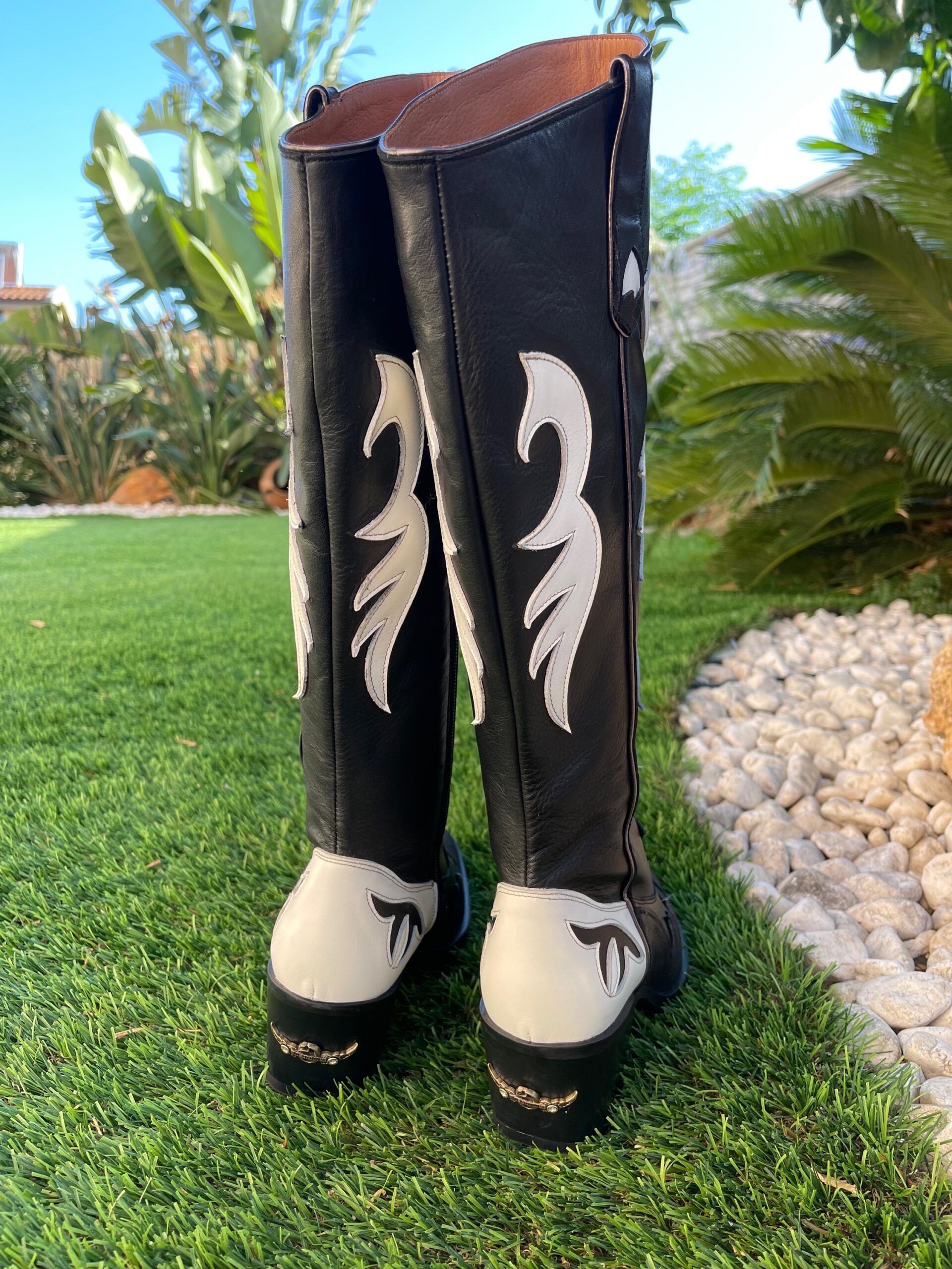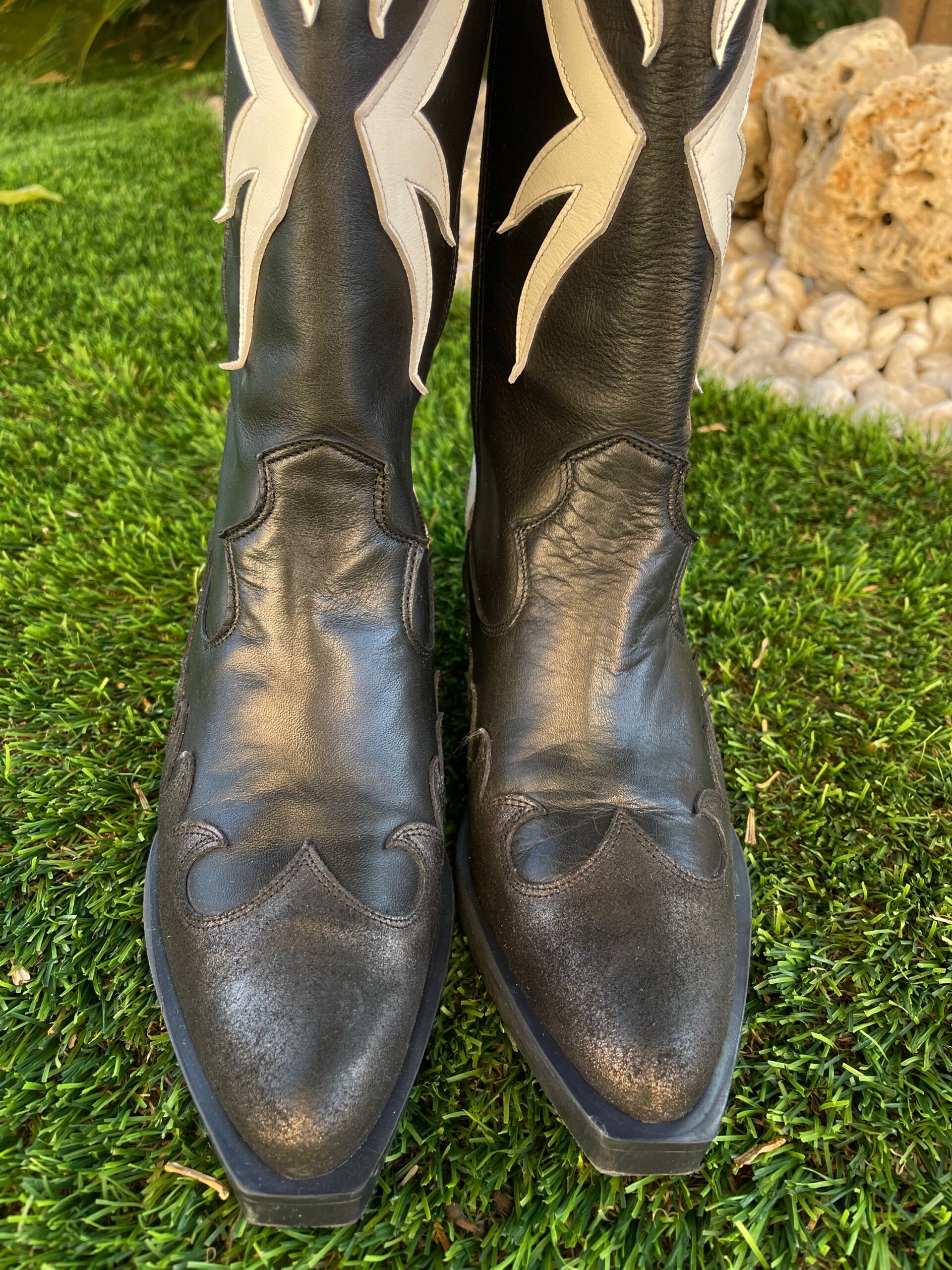Bota de piel realizada artesanalmente en España. Combinada en diferentes colores. Cremallera en la parte interna. Tacón de 6 cm.