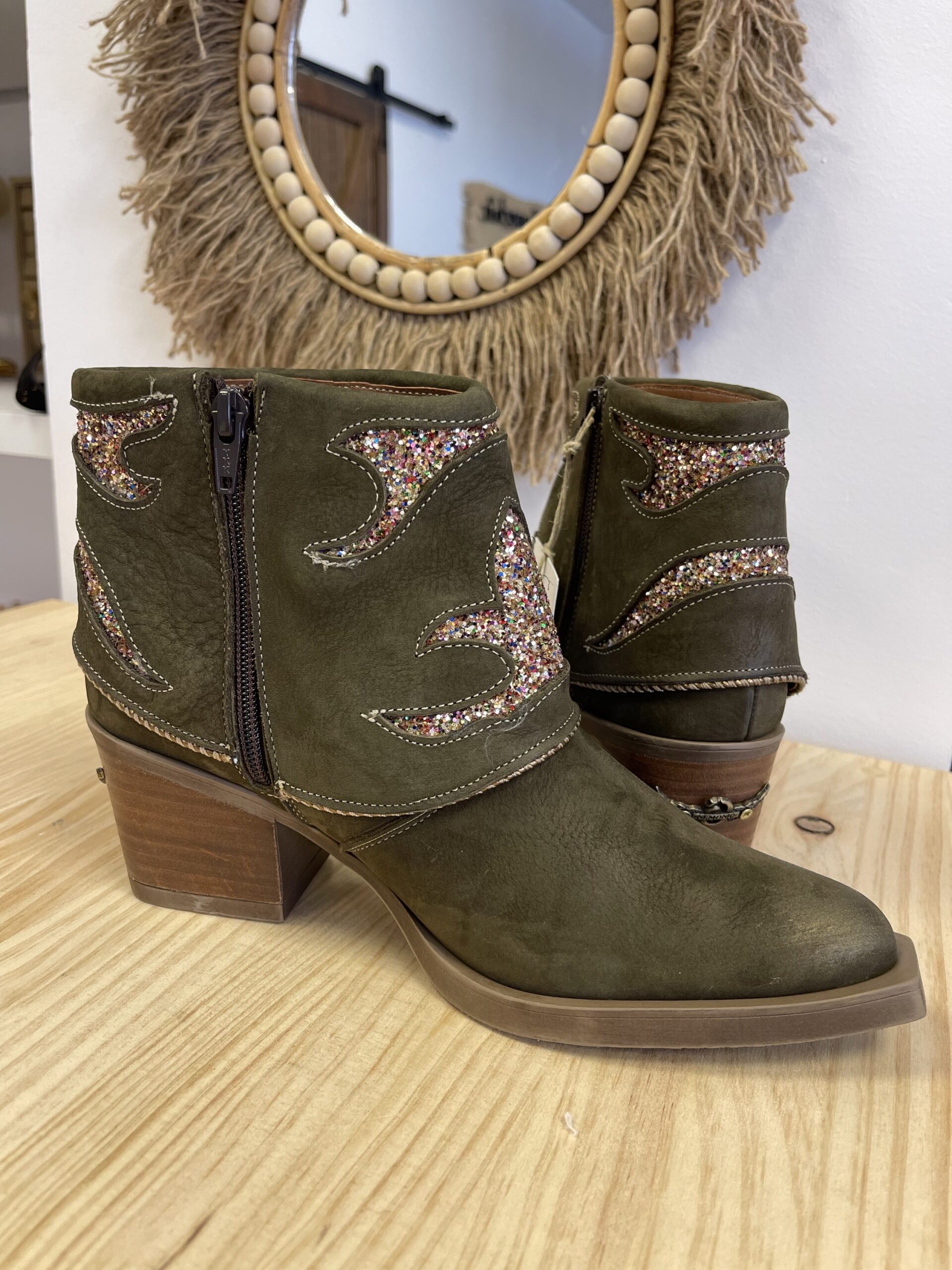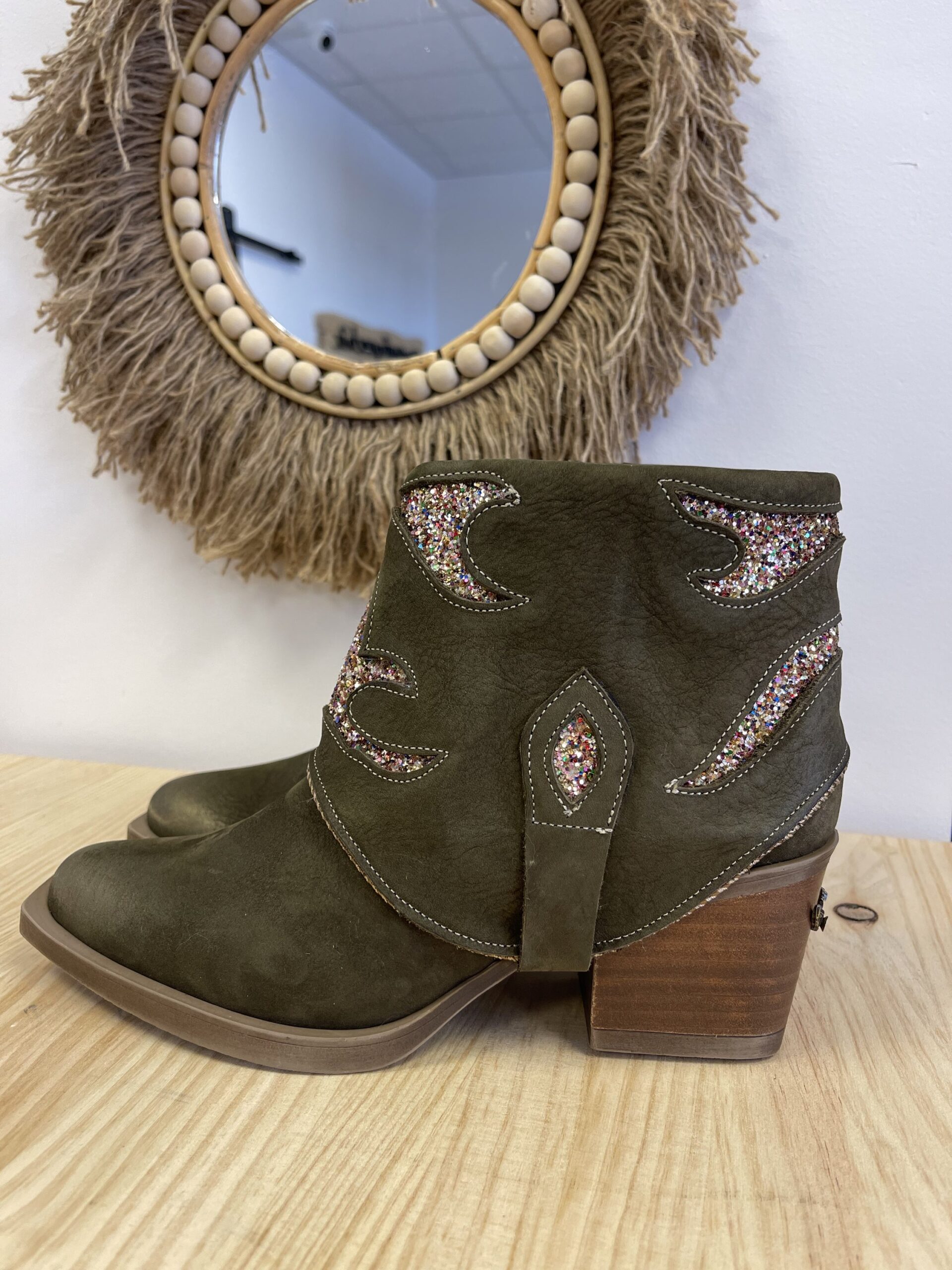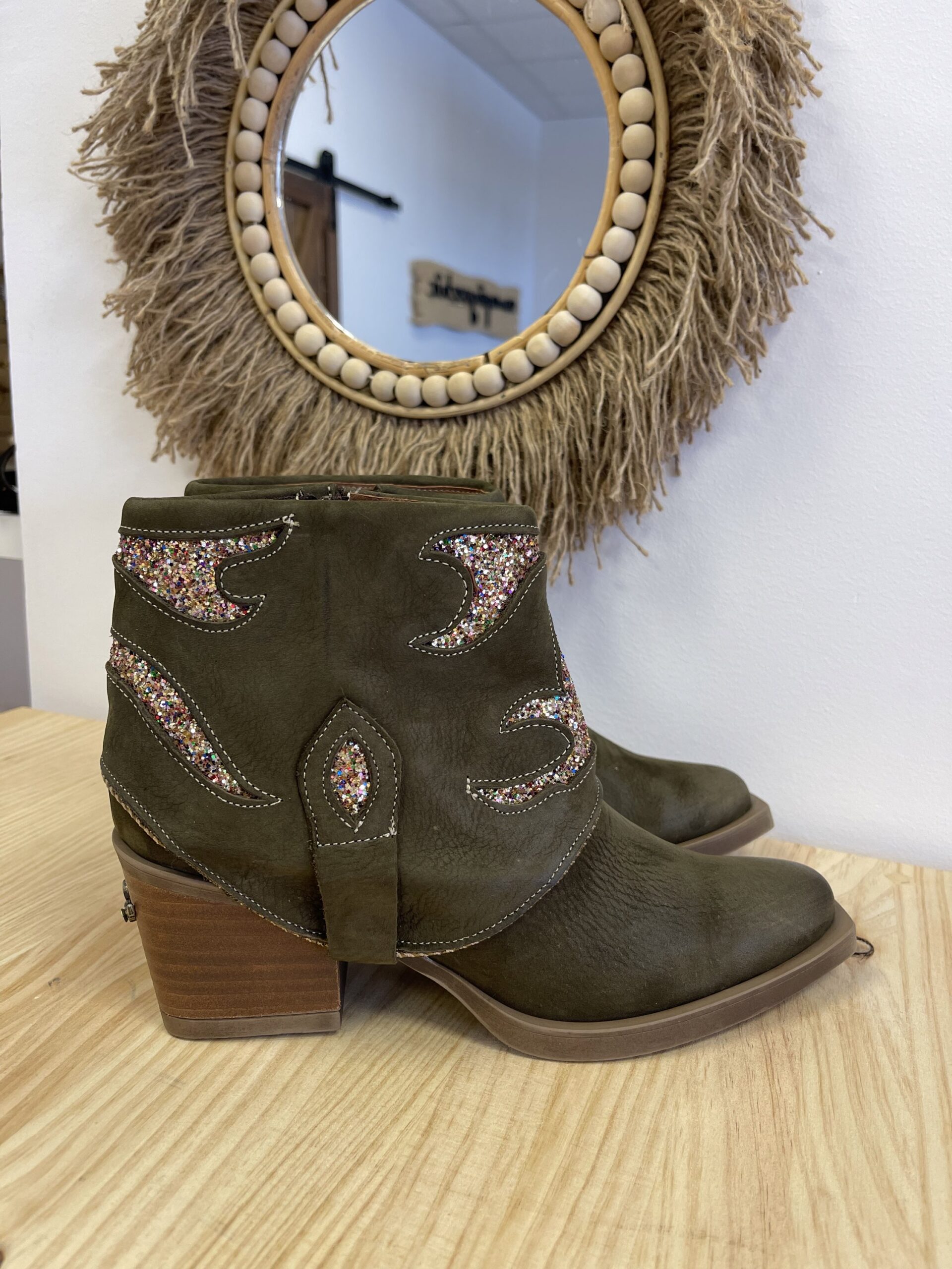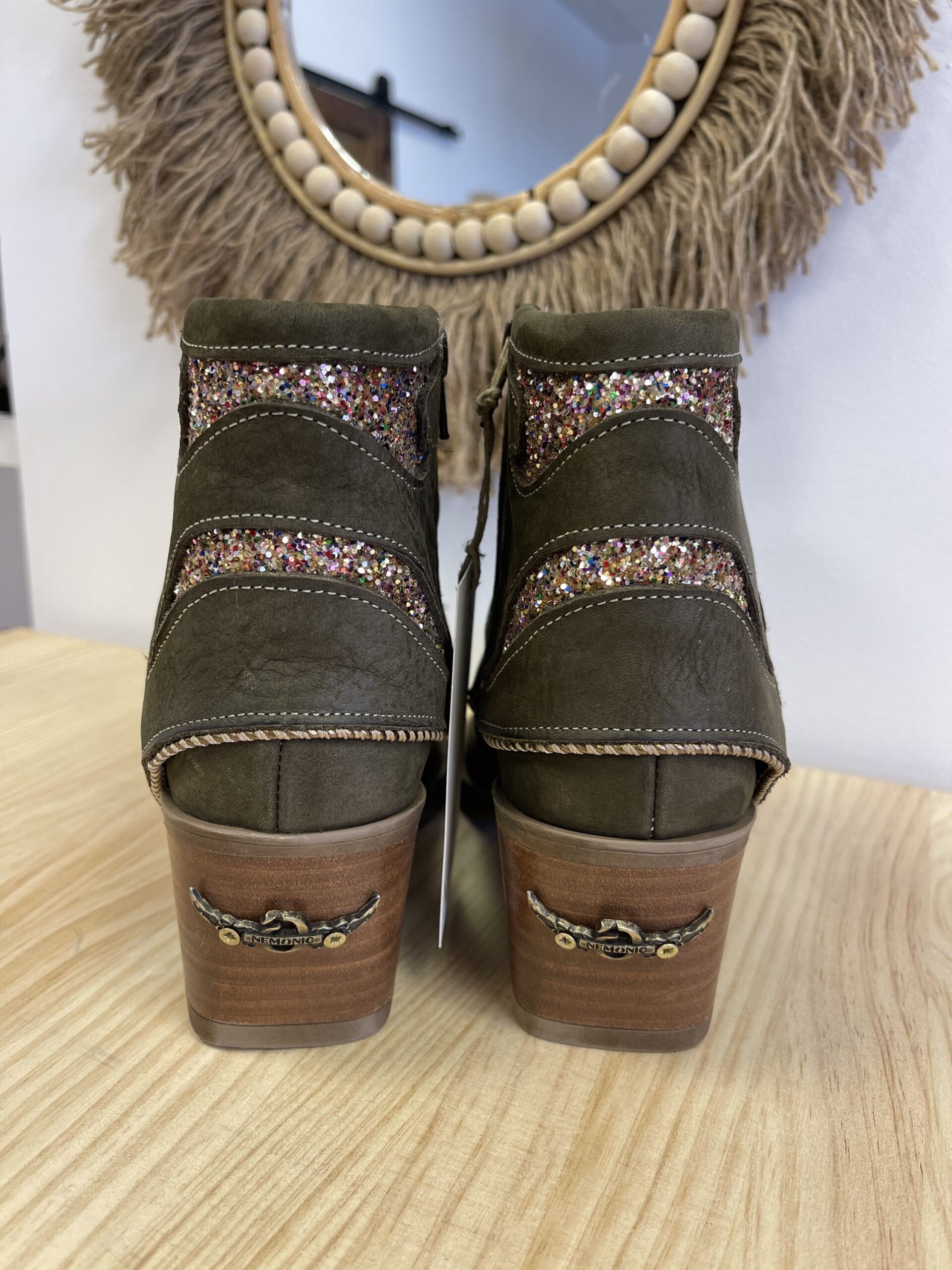 Botin Nemonic Ingras Verde. Botín de mujer de piel con color verde. Detalles con purpurina.  Aplique de chapa metálica en el tacón. Fabricación Nacional.