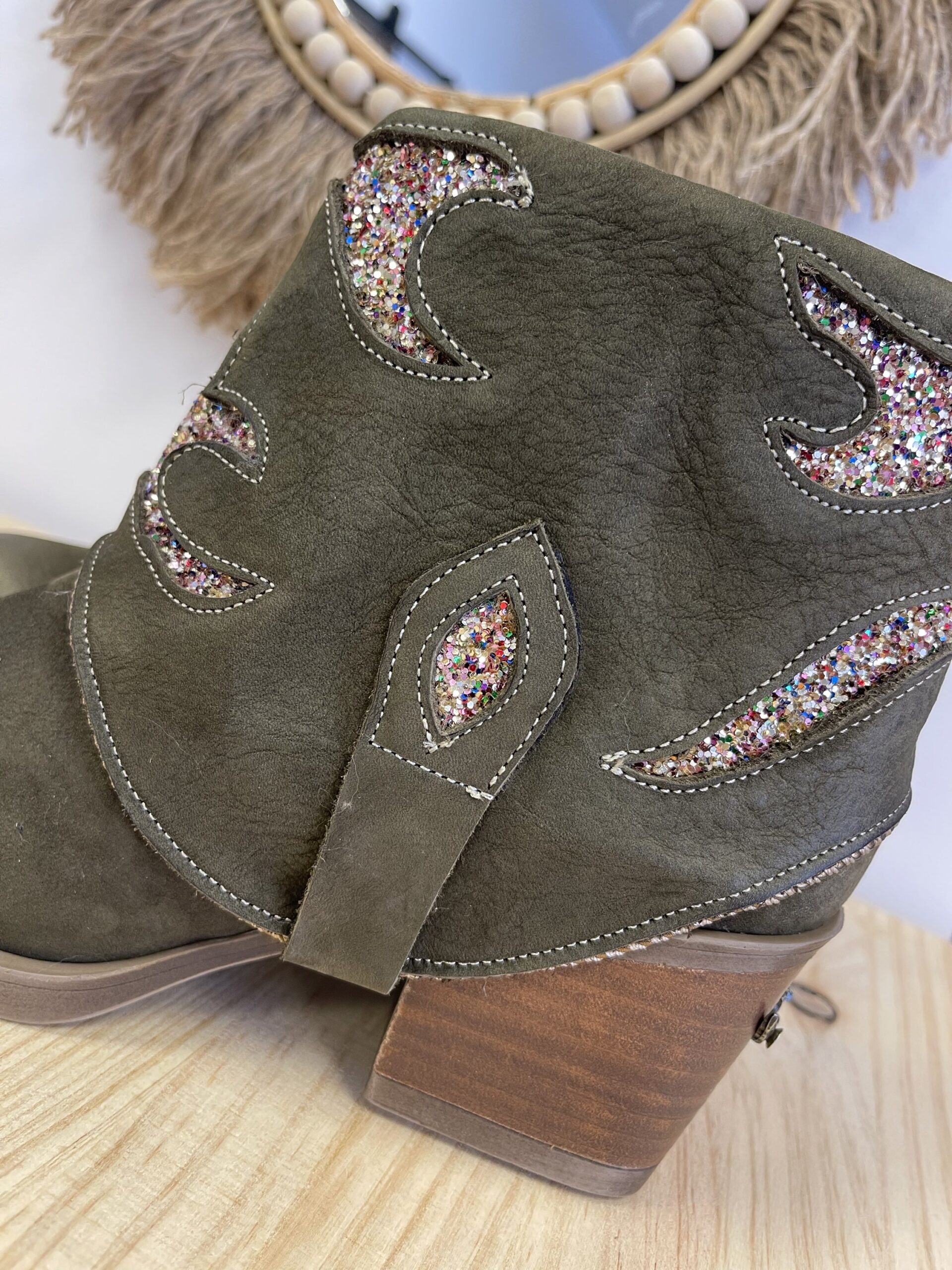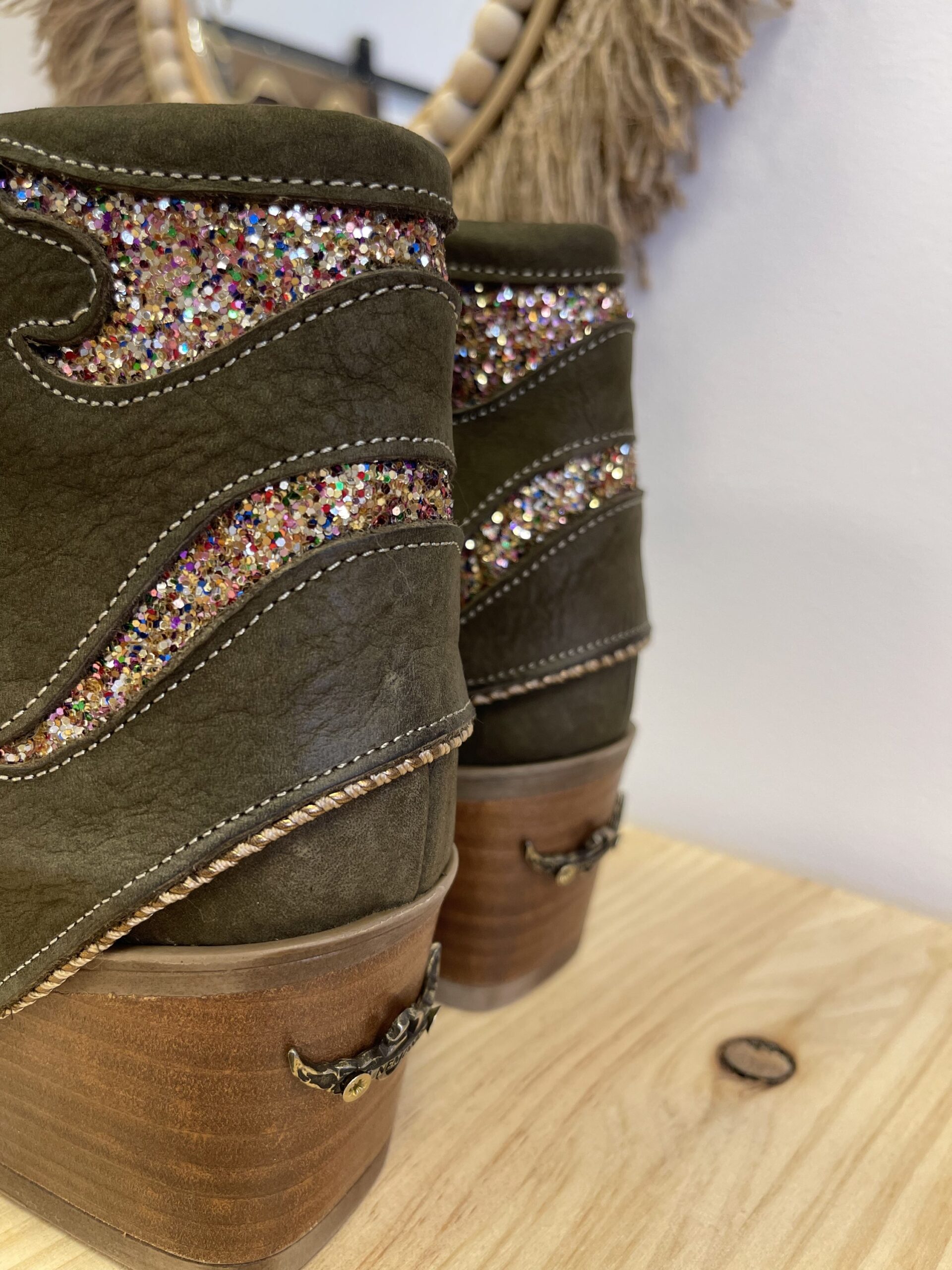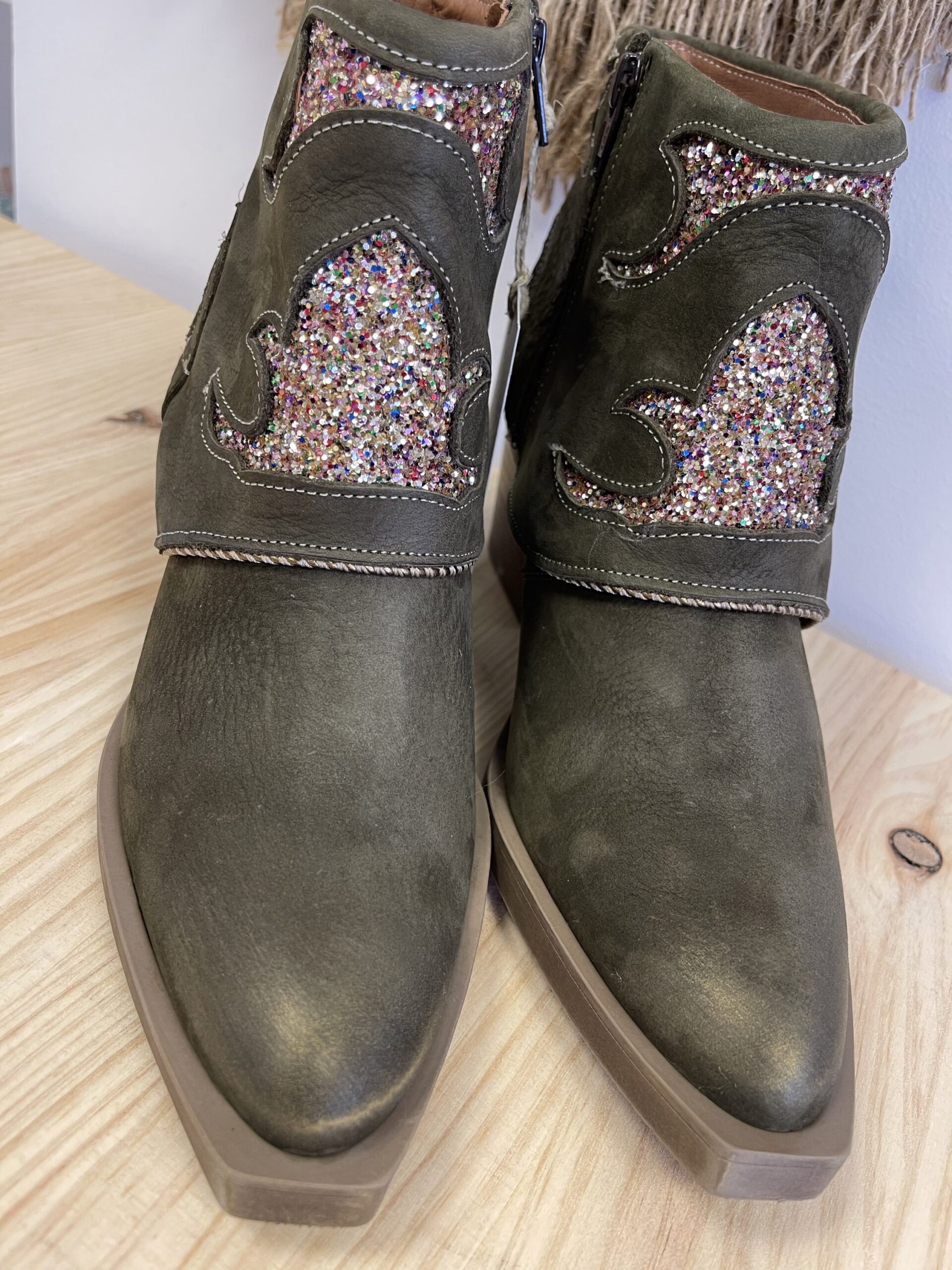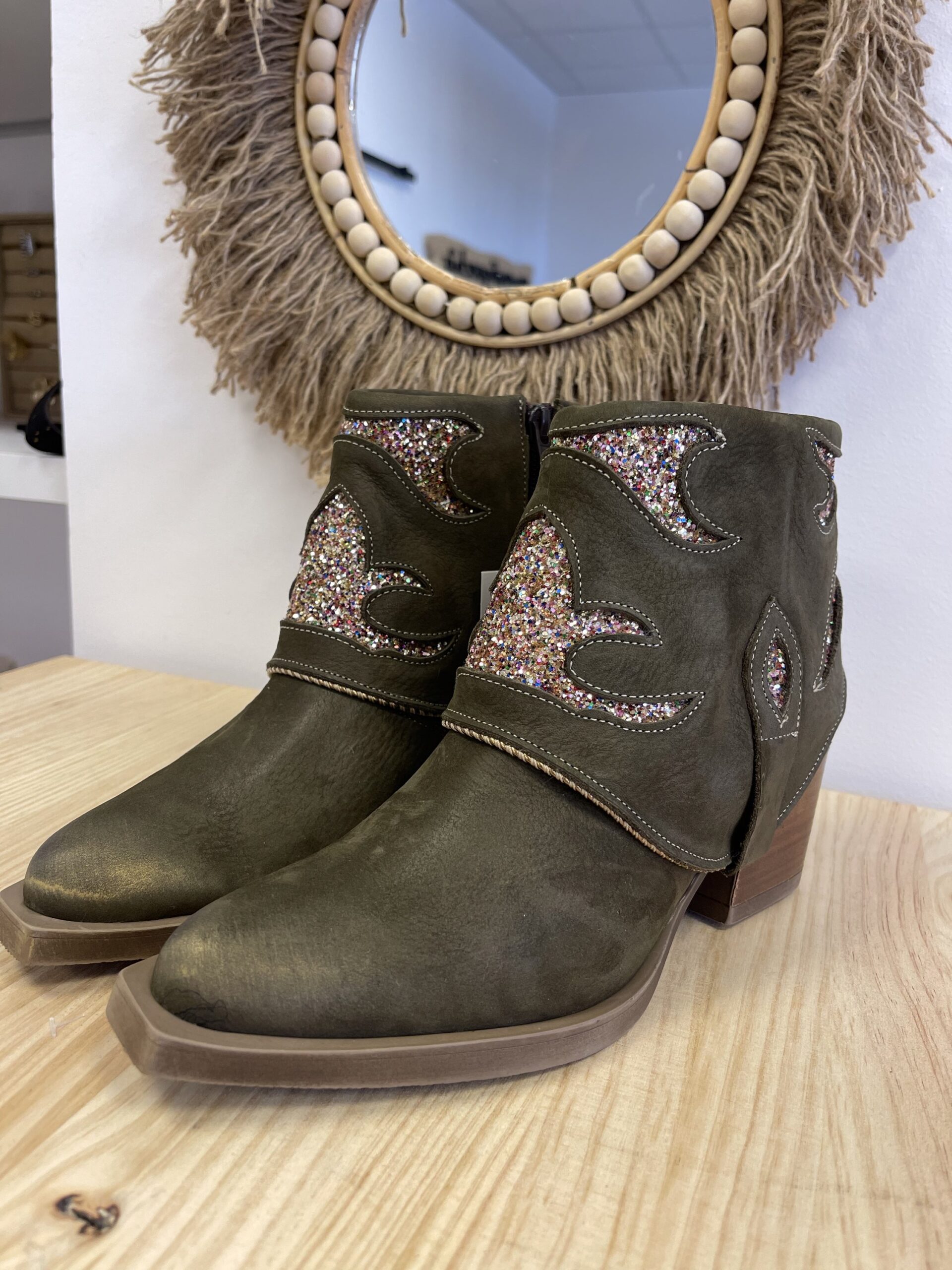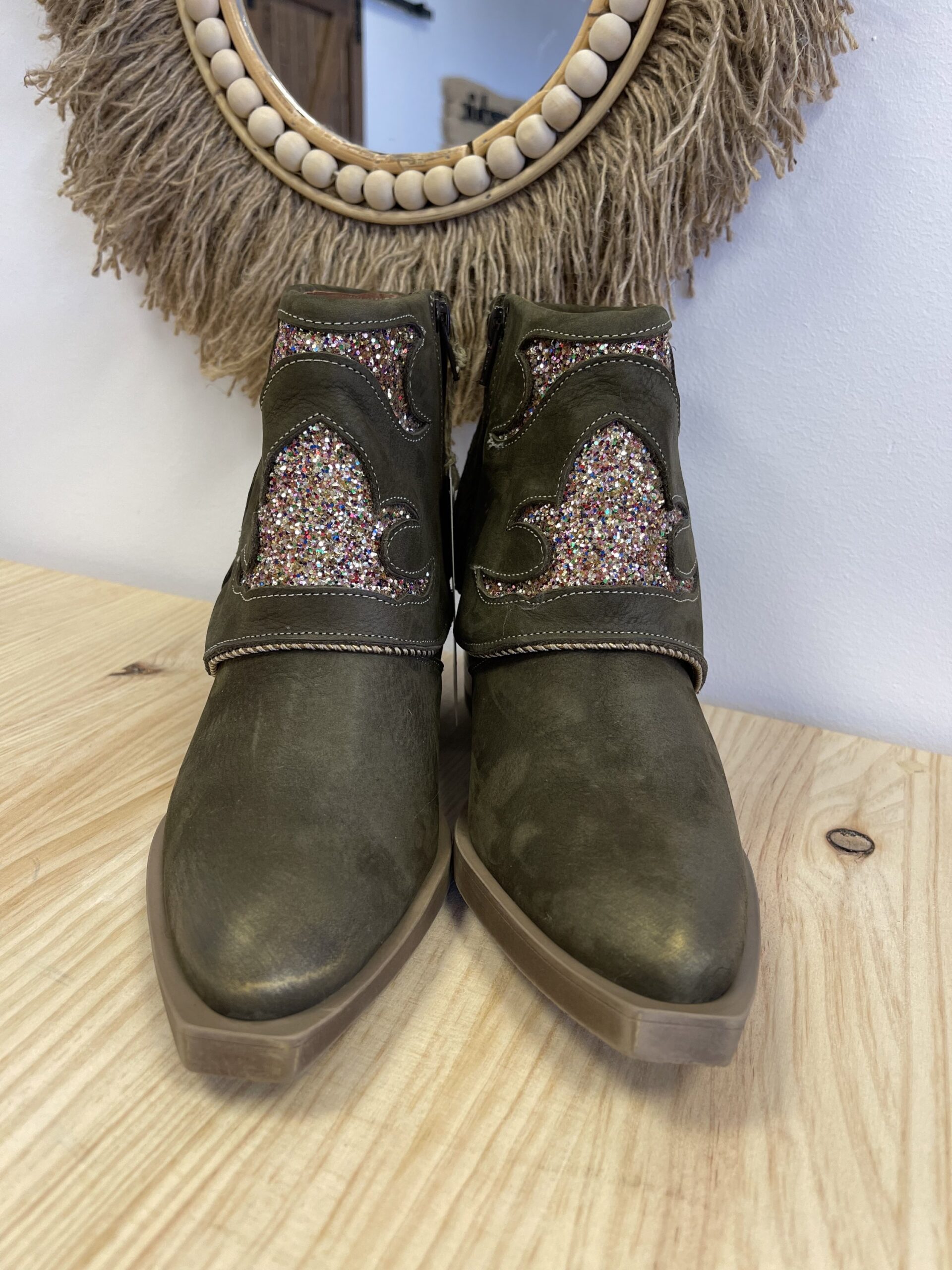 Botin Nemonic Ingras Verde. Botín de mujer de piel con color verde. Detalles con purpurina.  Aplique de chapa metálica en el tacón. Fabricación Nacional.