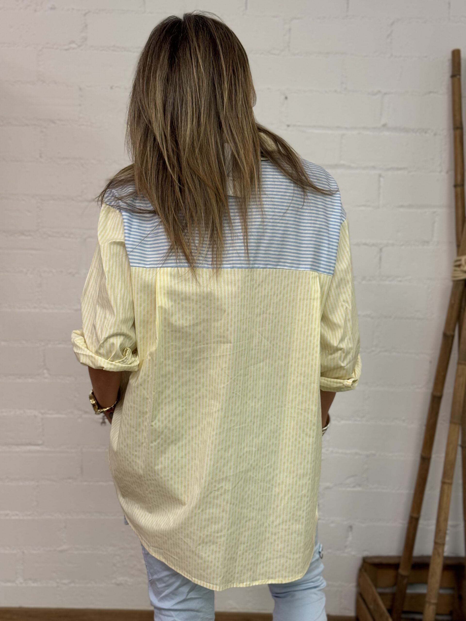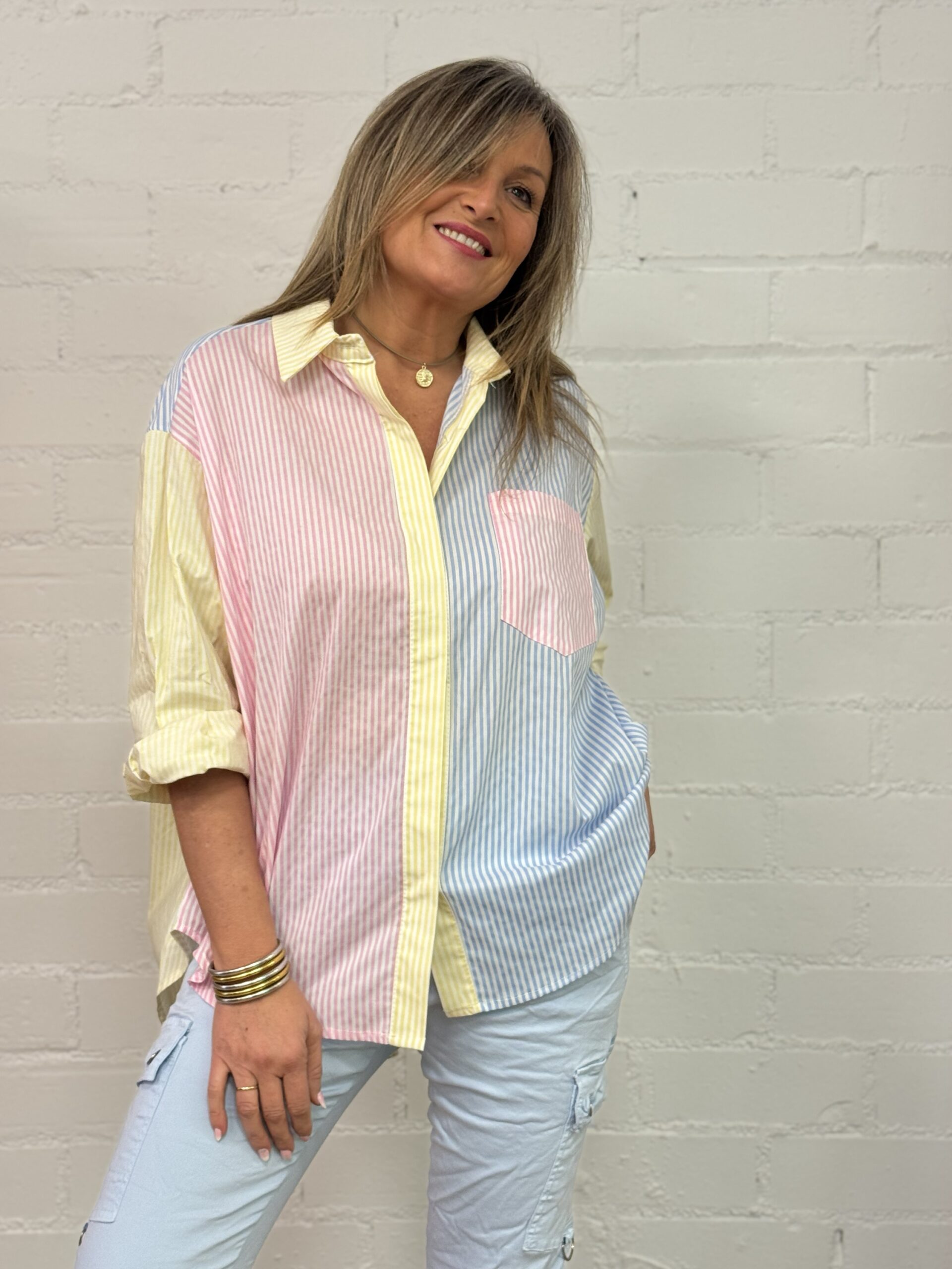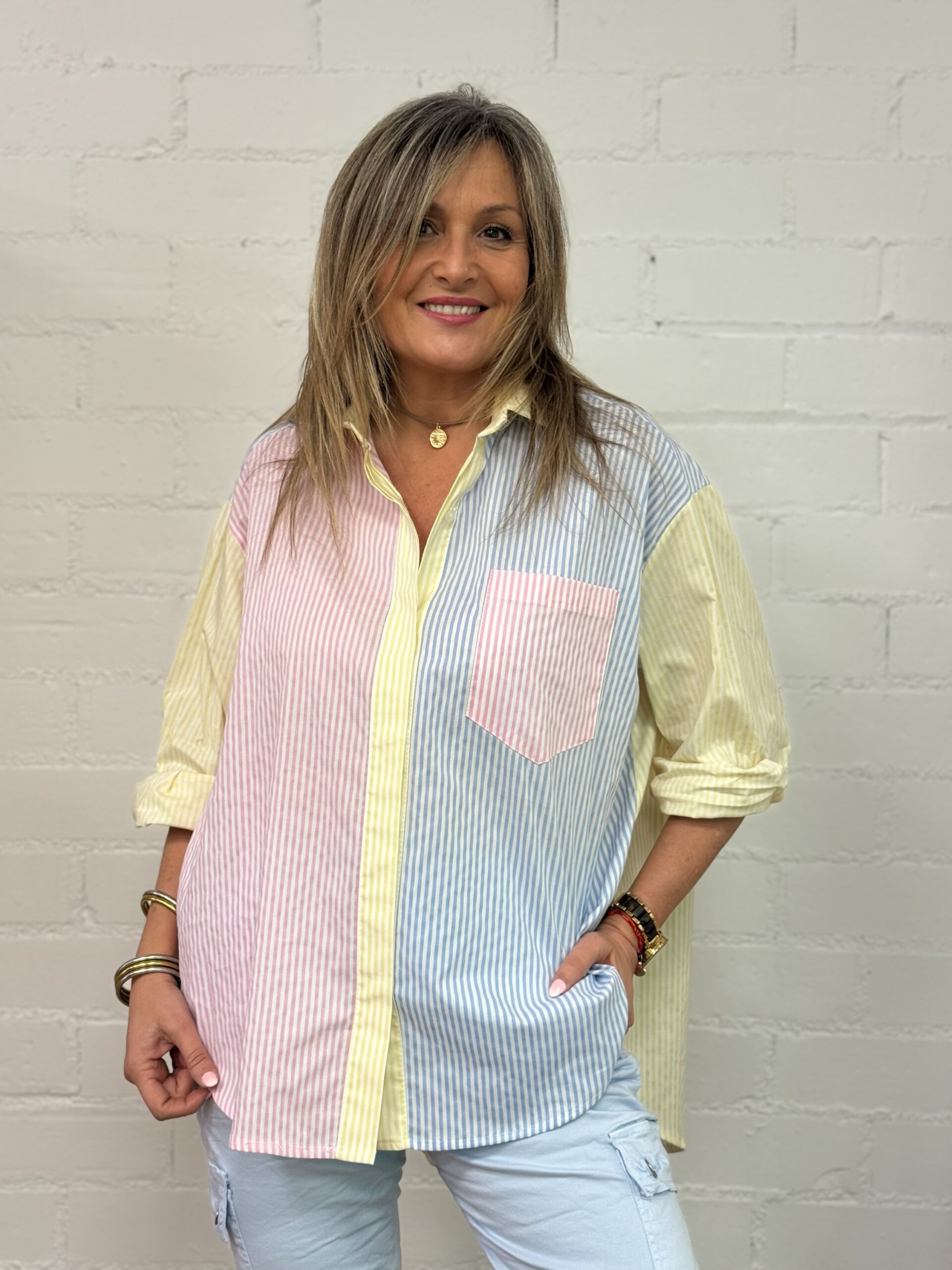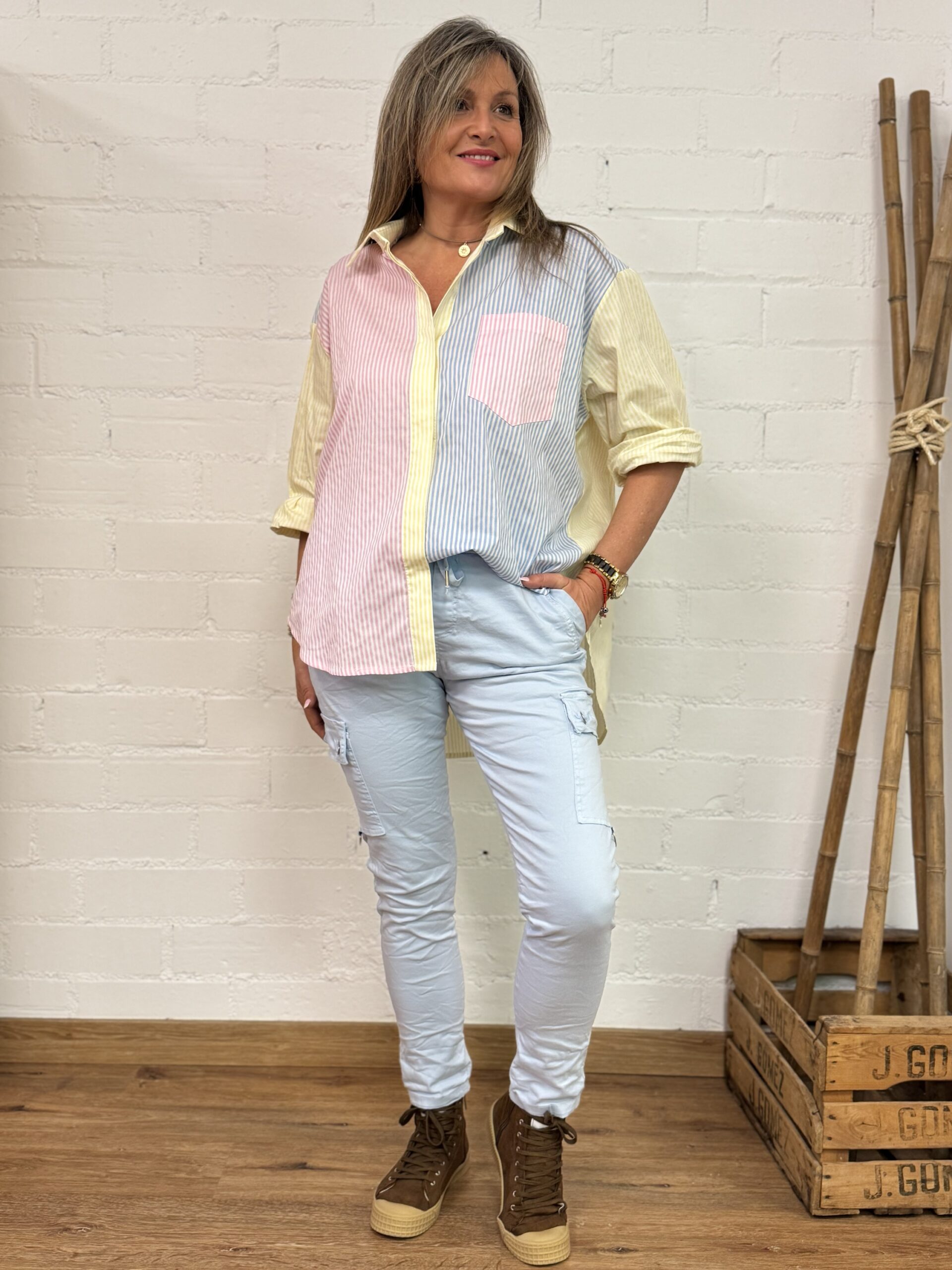 Los colores pastel primaverales iluminan el outfit y aportan suavidad, y el bolsillo en el pecho izquierdo añade un detalle práctico y casual. Ideal para llevar suelta, semi metida o como sobrecamisa, combinada con jeans, pantalones claros o faldas.