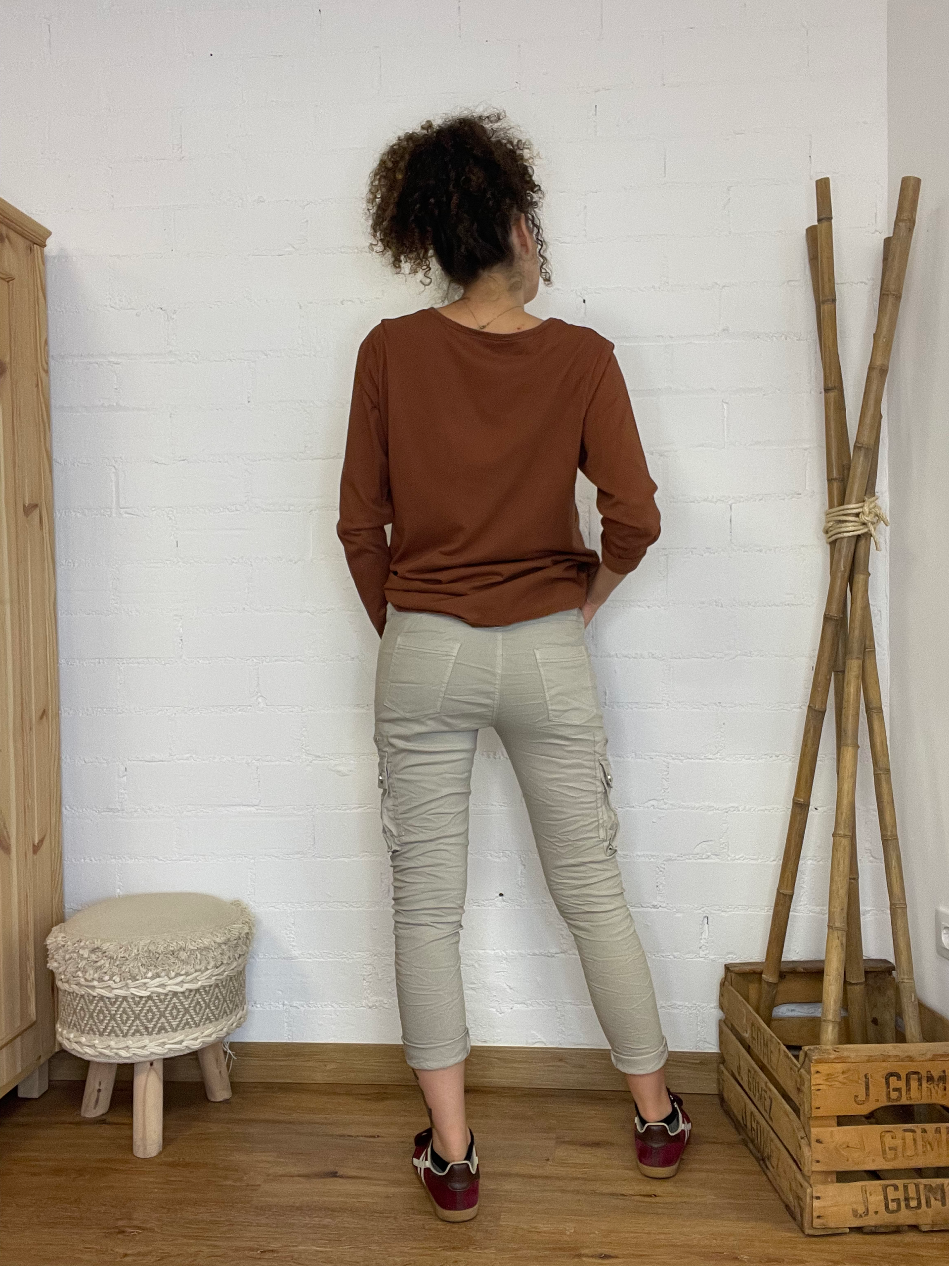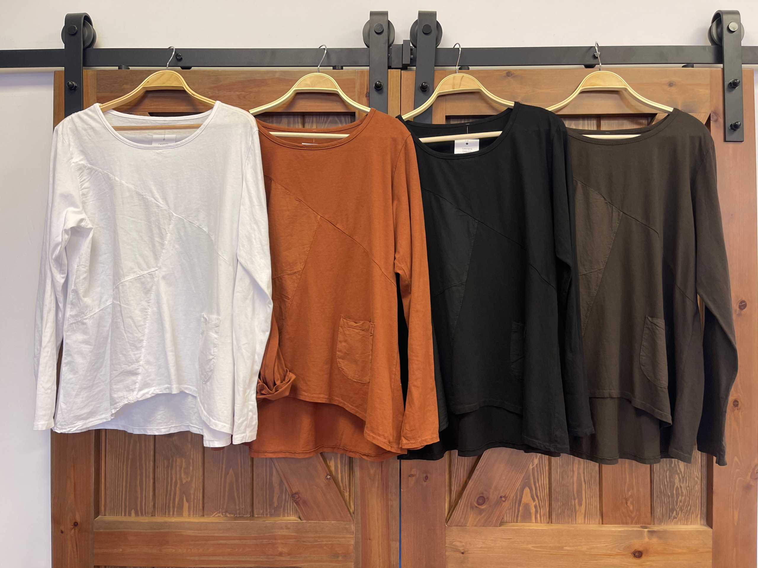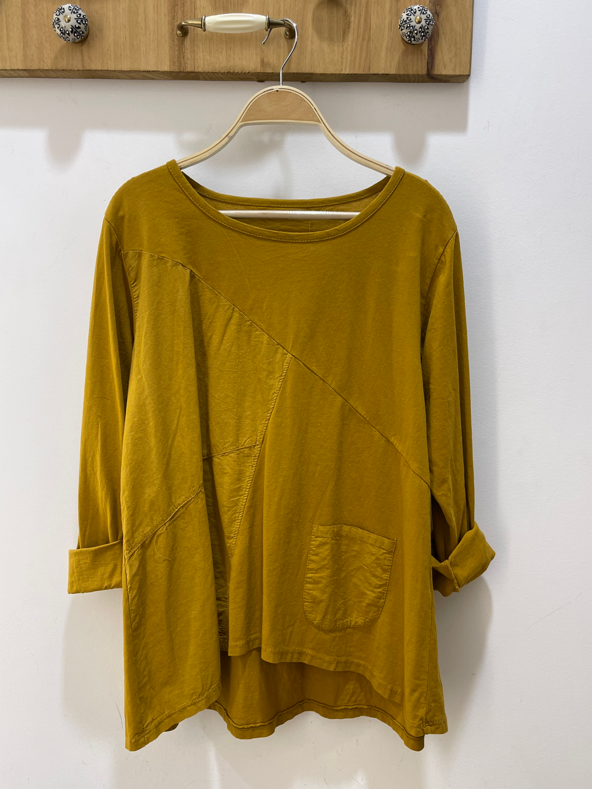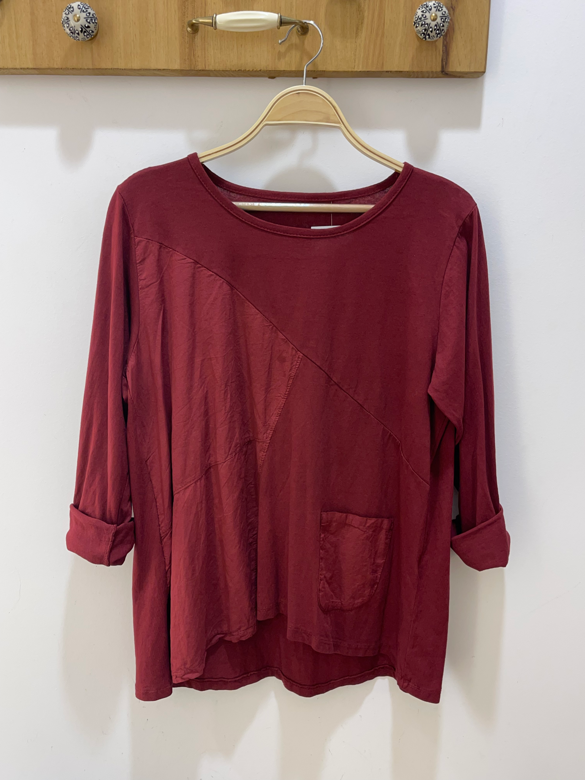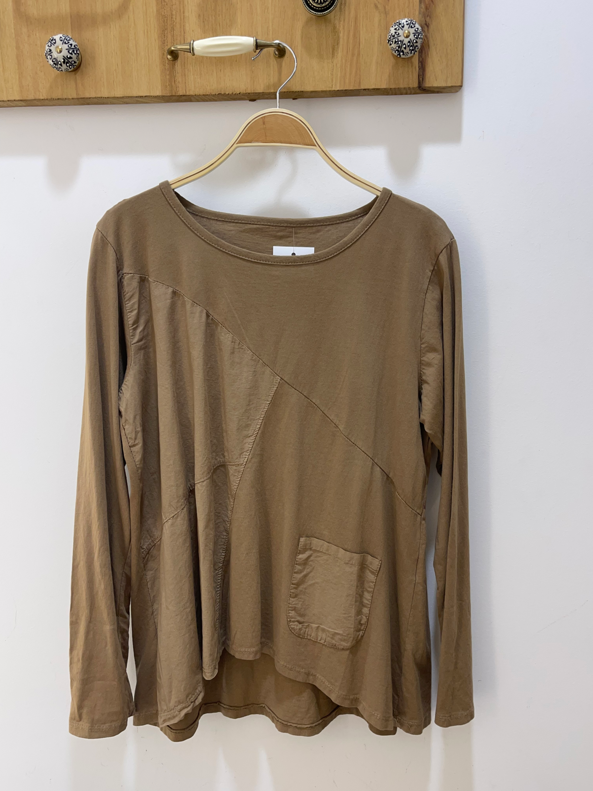 Camiseta de manga larga asimétrica, costuras vistas y bolsillo decorativo en la parte lateral delantera.