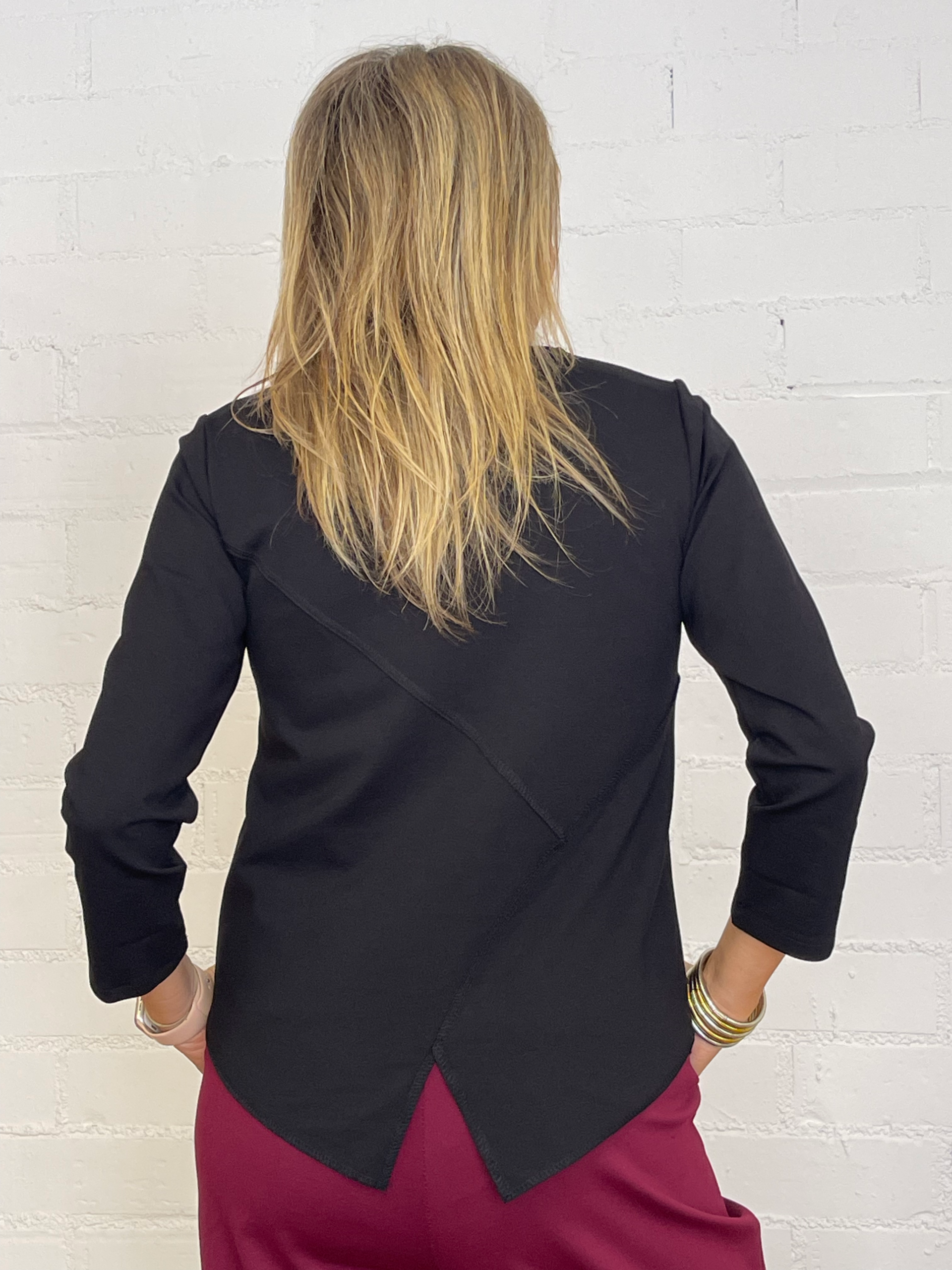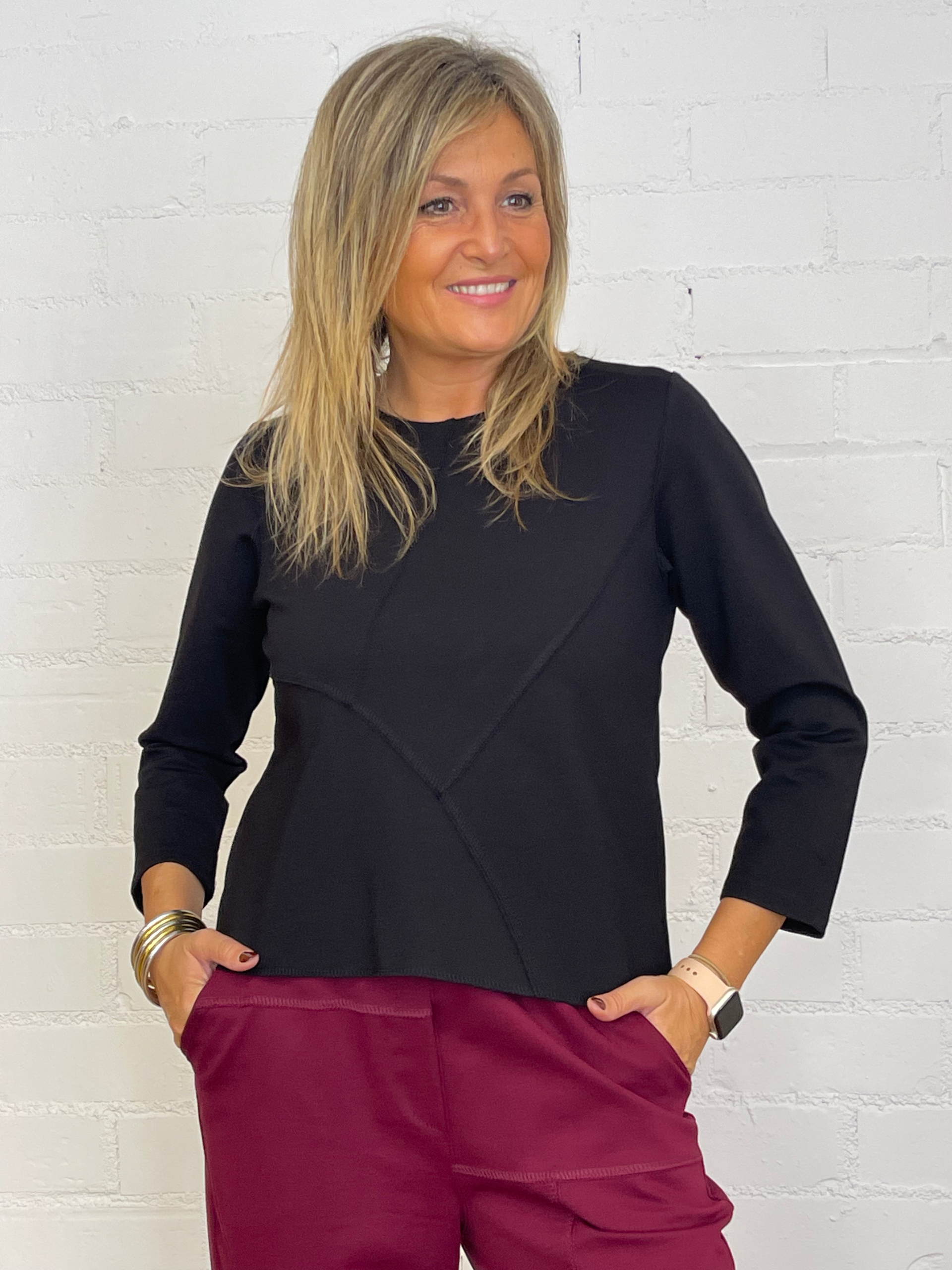 Esta camiseta de punto milano combina estilo y comodidad en un diseño moderno y favorecedor. De corte asimétrico y manga francesa, presenta un cuello redondo clásico que aporta equilibrio al conjunto. Los detalles de costuras decorativas, tanto en la parte delantera como en la trasera, realzan su diseño con un toque contemporáneo.