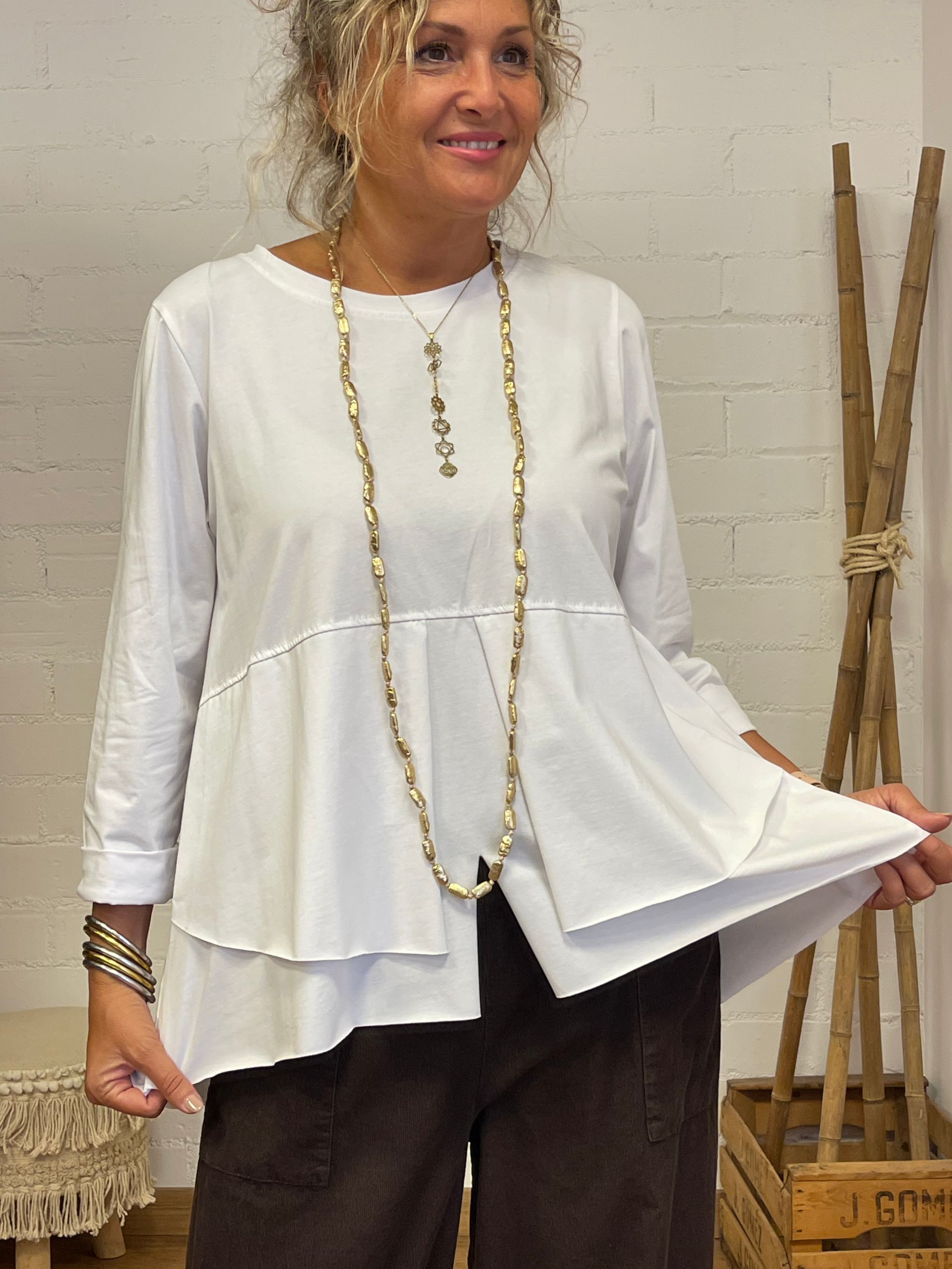 Dale un giro actual a tu look con esta camiseta de diseño asimétrico y manga larga. Su cuello redondo clásico contrasta con un bajo sin ribetear, que aporta un acabado desenfadado y moderno. El efecto layering crea una sensación de superposición ligera, perfecta para conseguir un estilo casual con un toque diferente.