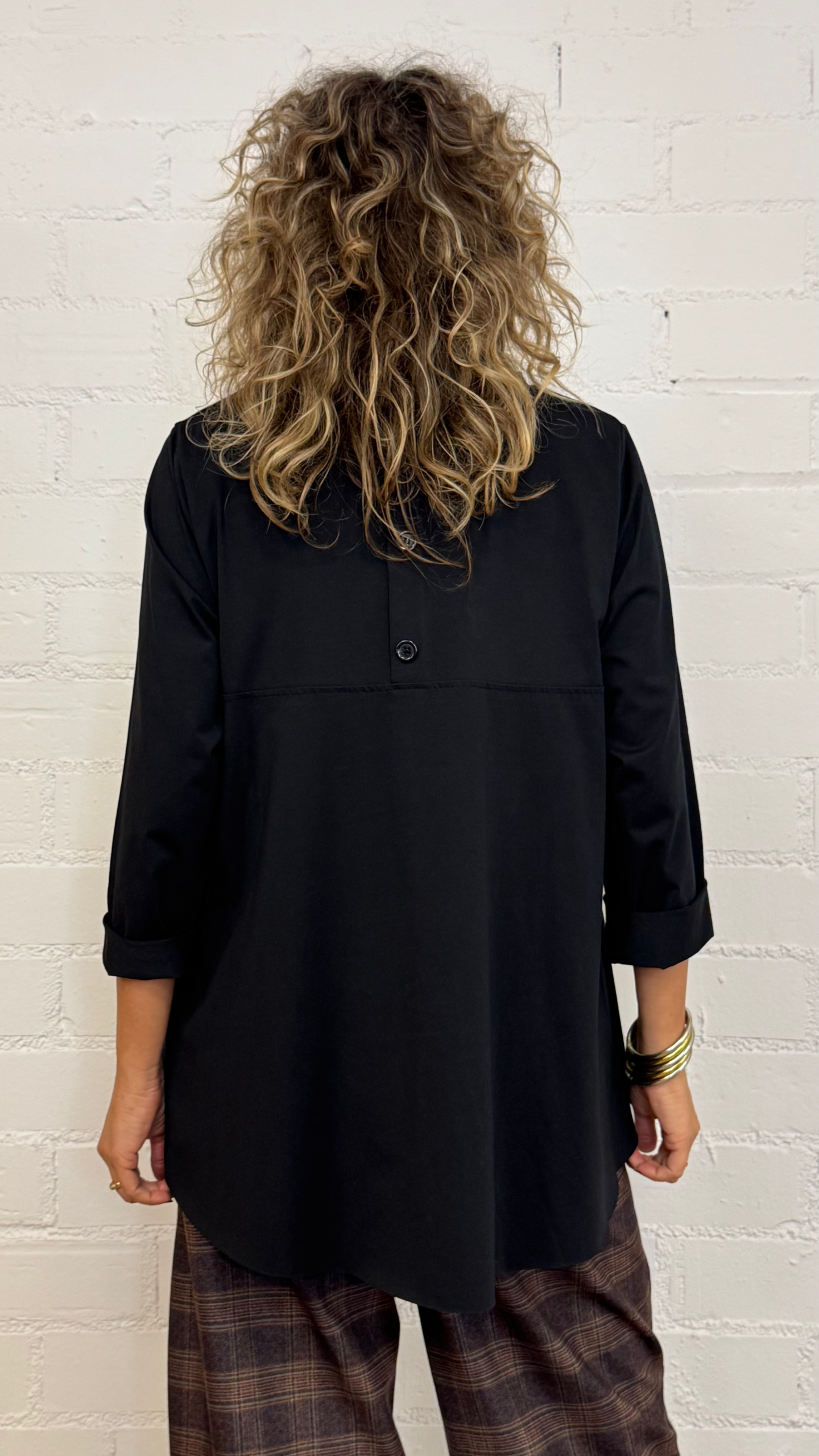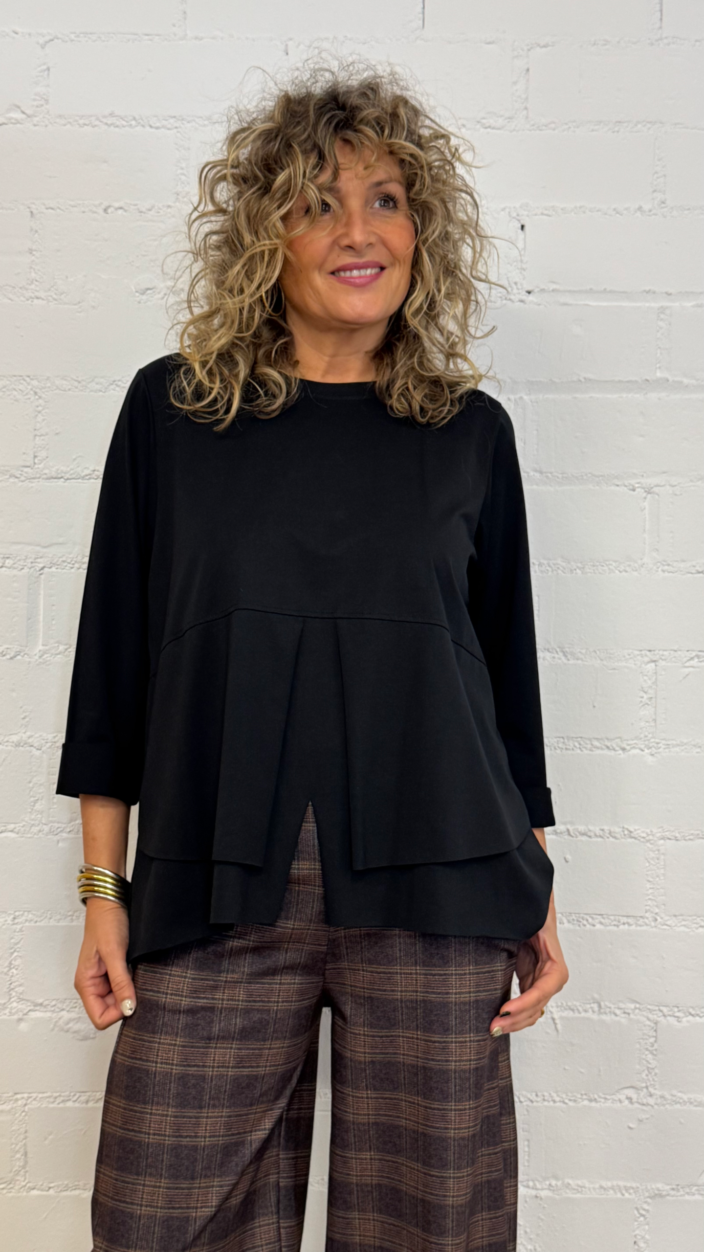 Dale un giro actual a tu look con esta camiseta de diseño asimétrico y manga larga. Su cuello redondo clásico contrasta con un bajo sin ribetear, que aporta un acabado desenfadado y moderno. El efecto layering crea una sensación de superposición ligera, perfecta para conseguir un estilo casual con un toque diferente.