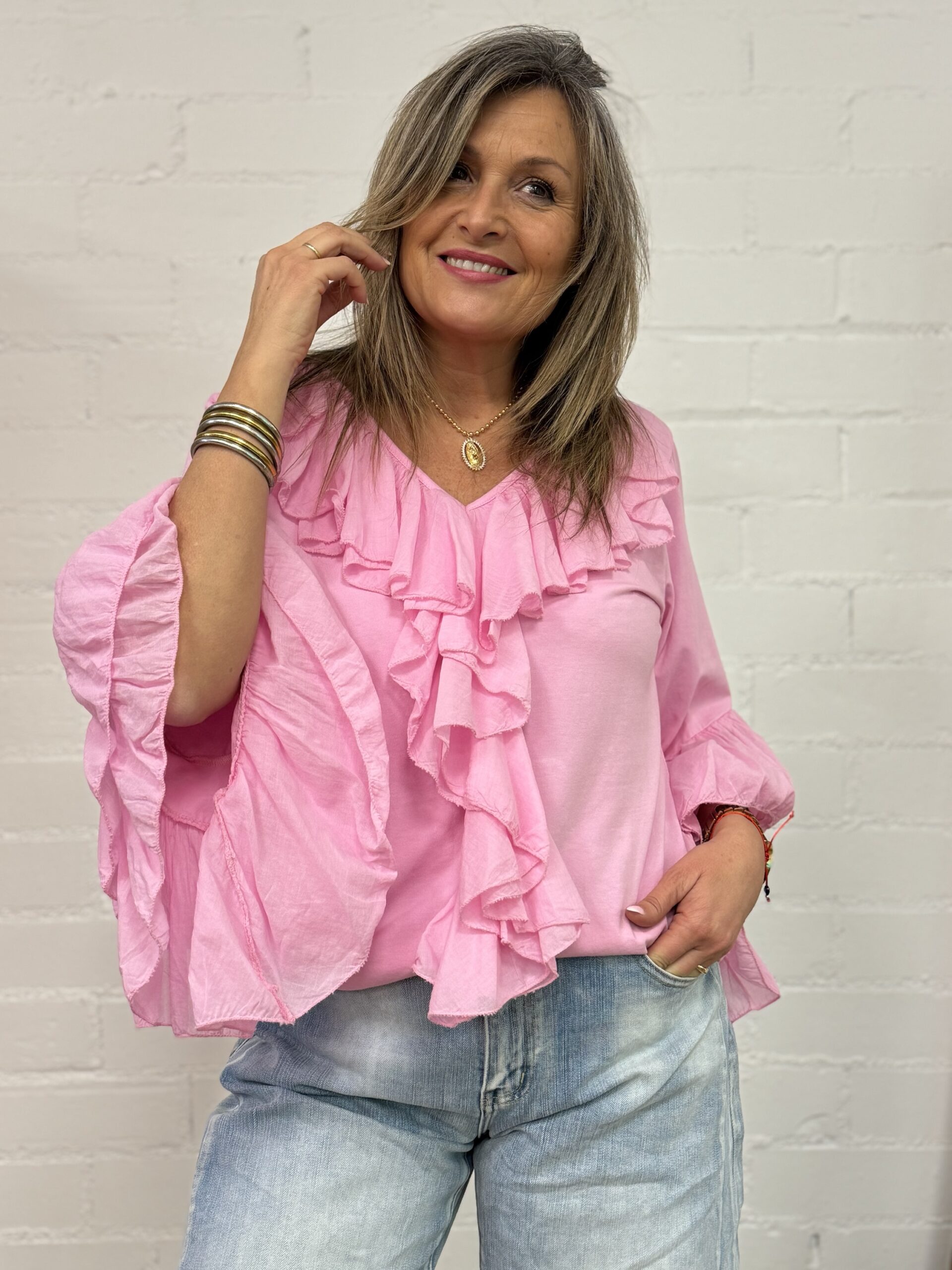 Camiseta fresca y ligera con cuello de pico, que estiliza el escote y aporta un aire femenino. Incorpora manga francesa, perfecta para entretiempo, y delicados volantes en el escote y en las mangas que añaden movimiento y un toque romántico.