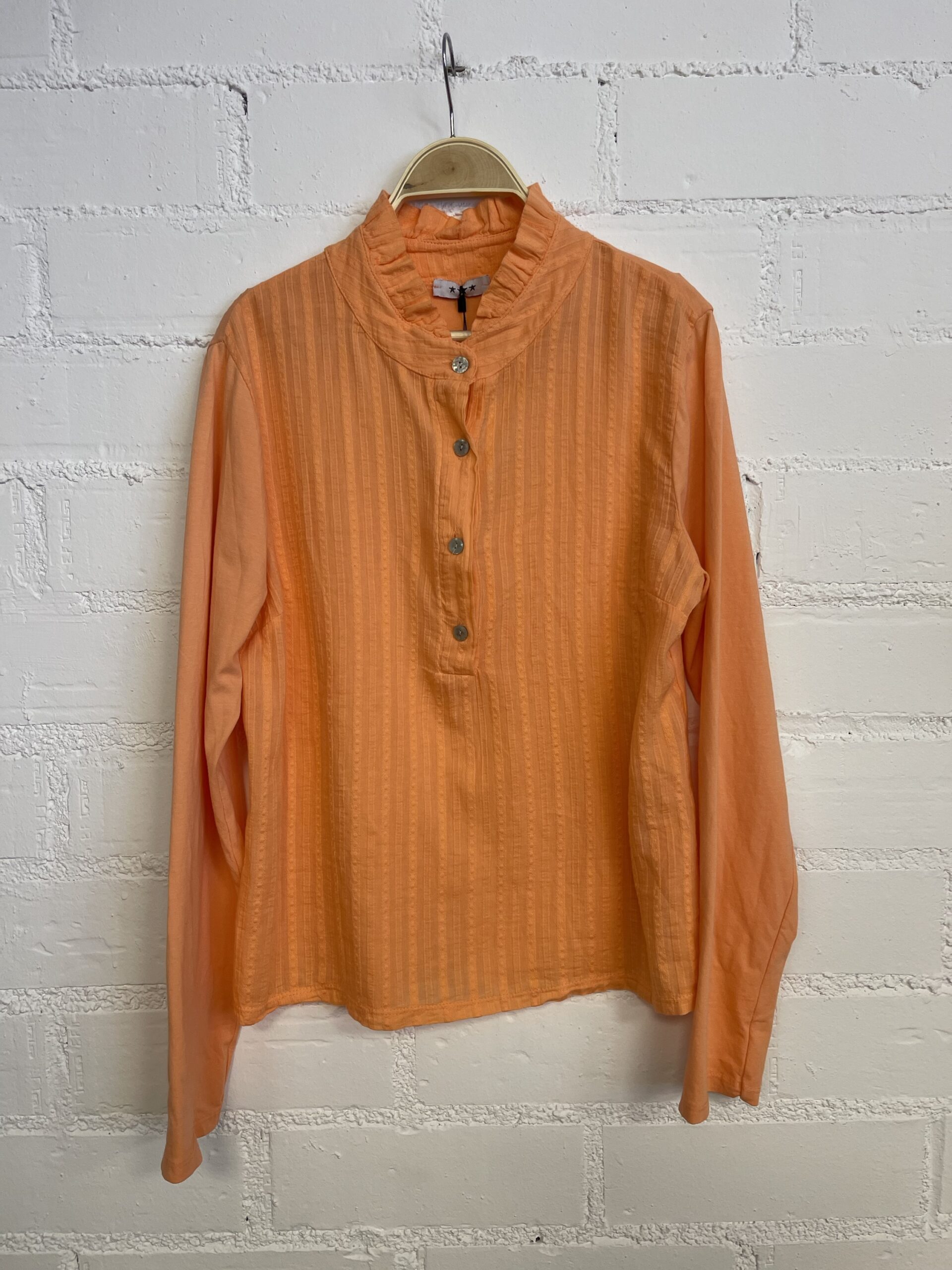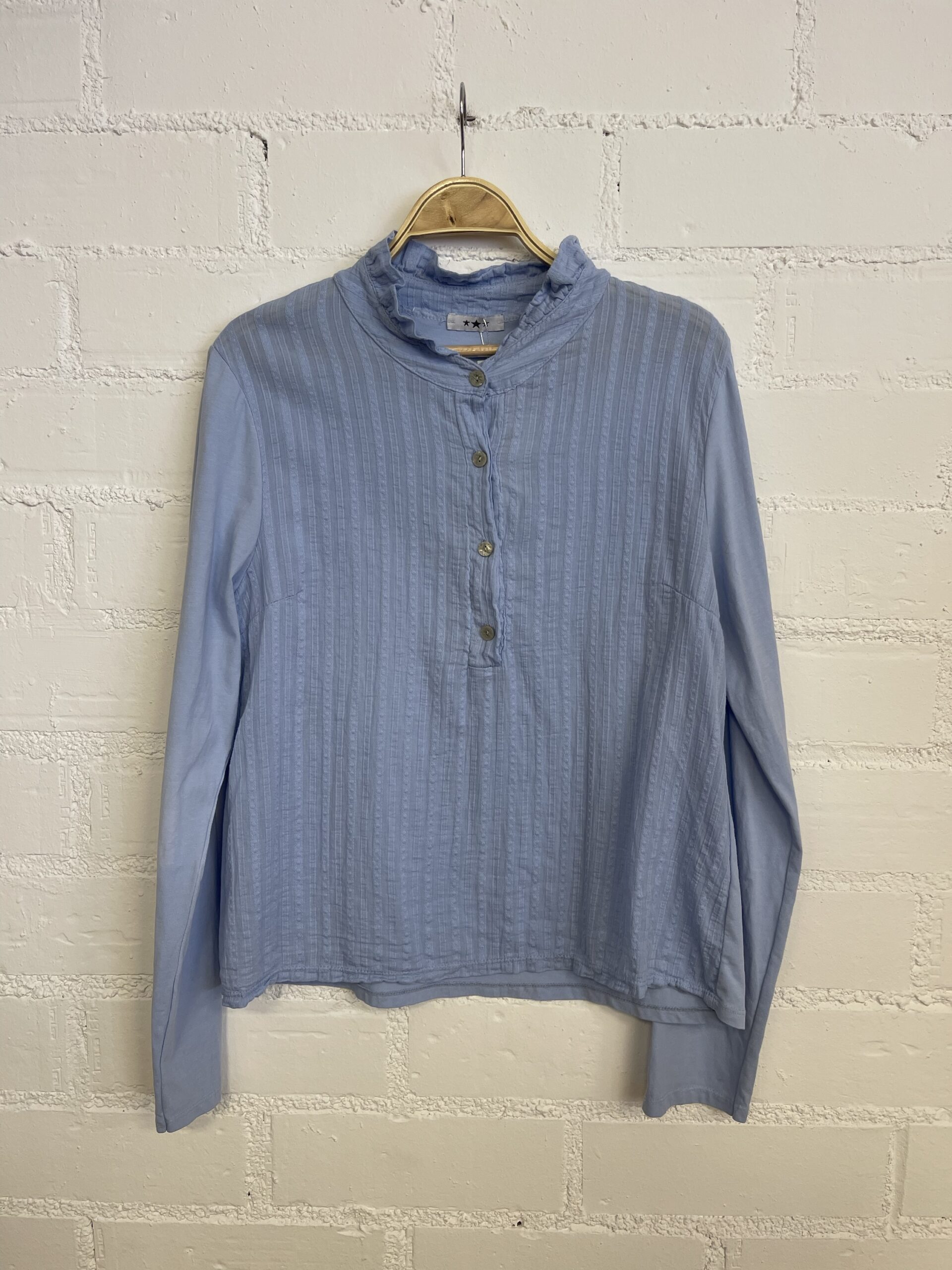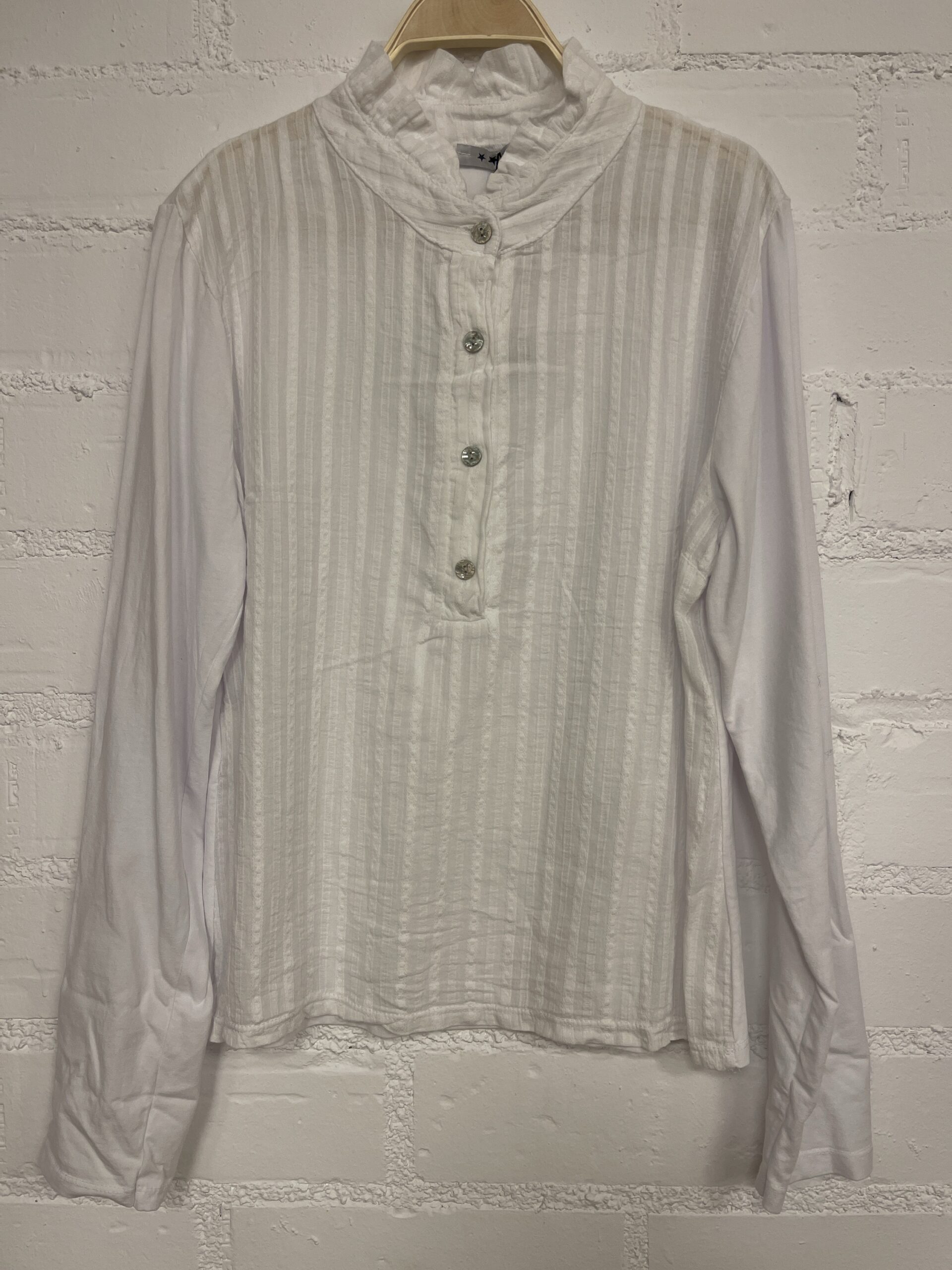 Camiseta de manga larga con un diseño delicado y muy favorecedor. La parte delantera destaca por su tejido con textura vertical, mientras que las mangas y la espalda están confeccionadas en el mismo tejido liso, aportando contraste sutil y mayor comodidad.