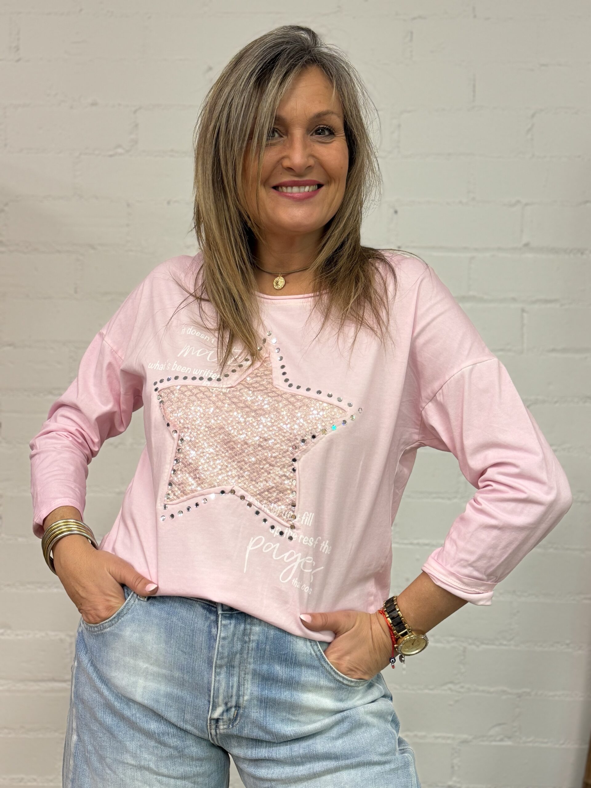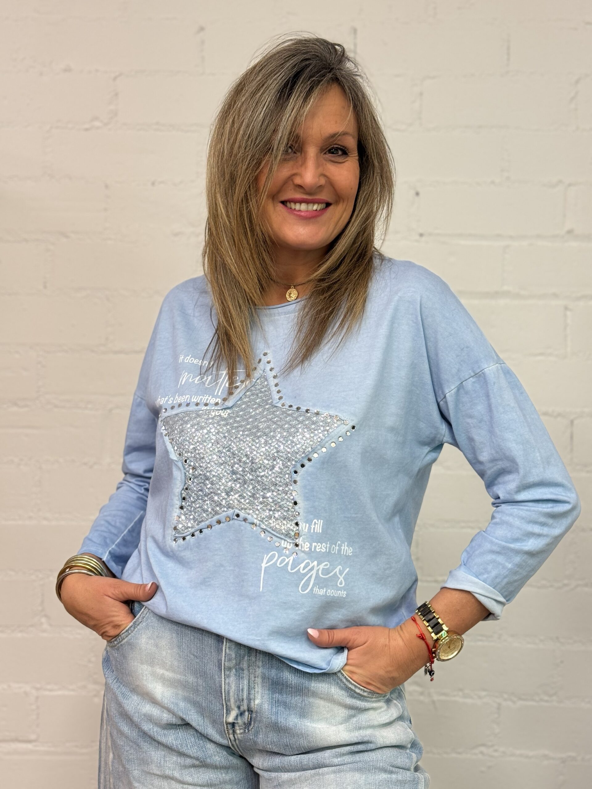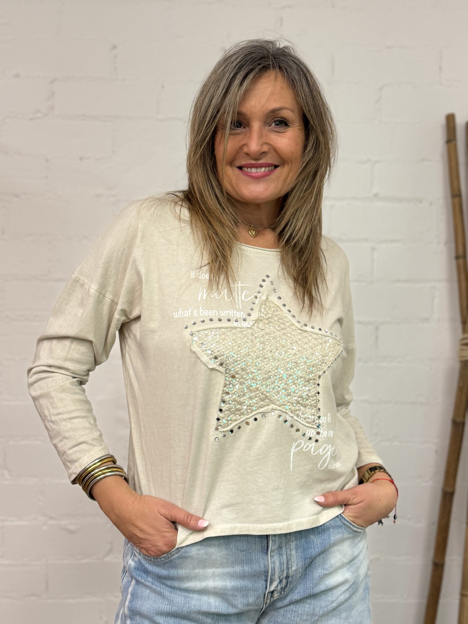 Esta camiseta de manga larga es perfecta para darle un toque especial a tus looks diarios. Con cuello redondo y un diseño cómodo, destaca por su estampado de letras en la parte frontal, combinado con lentejuelas formando una estrella que aportan brillo y personalidad.