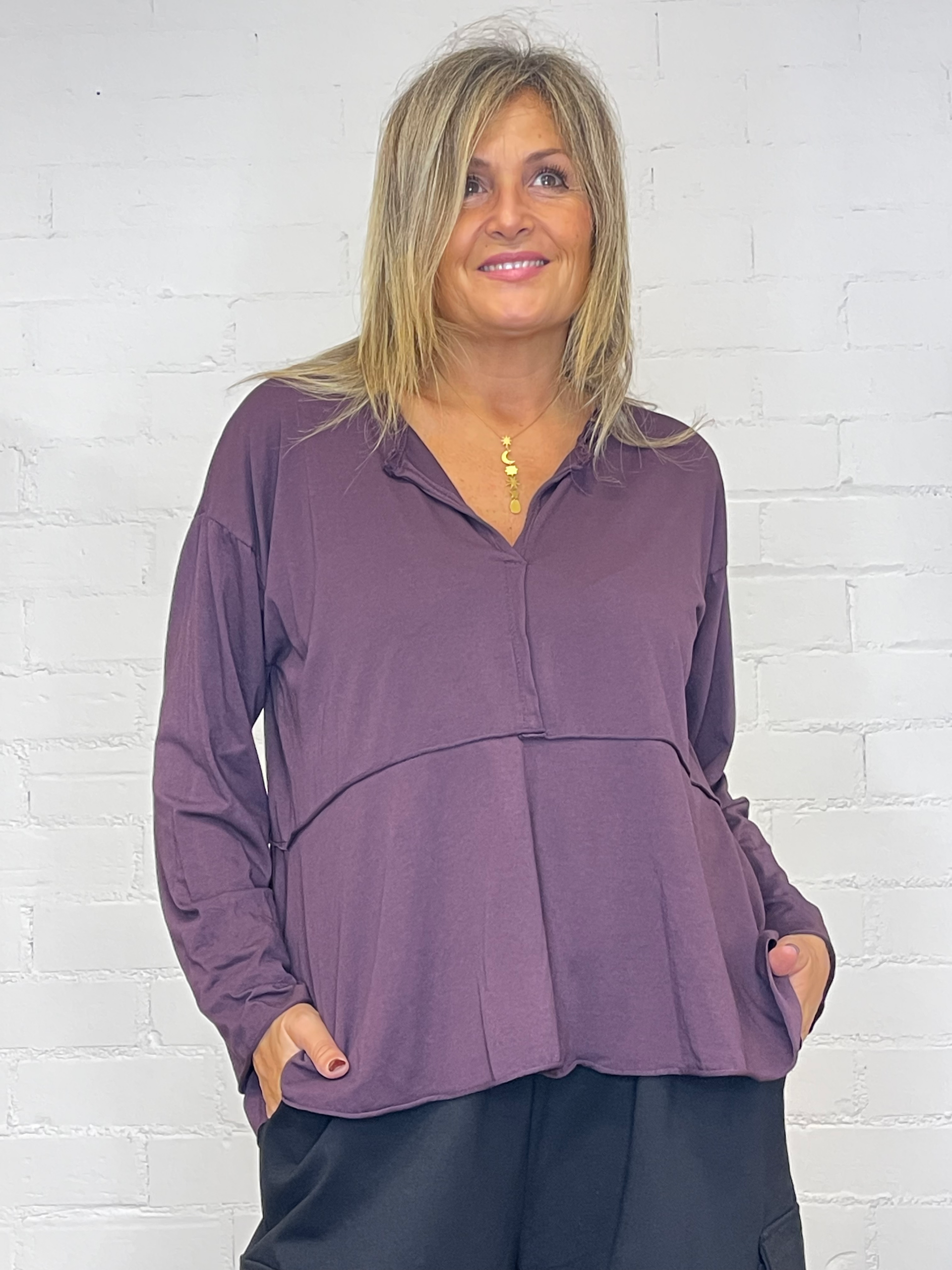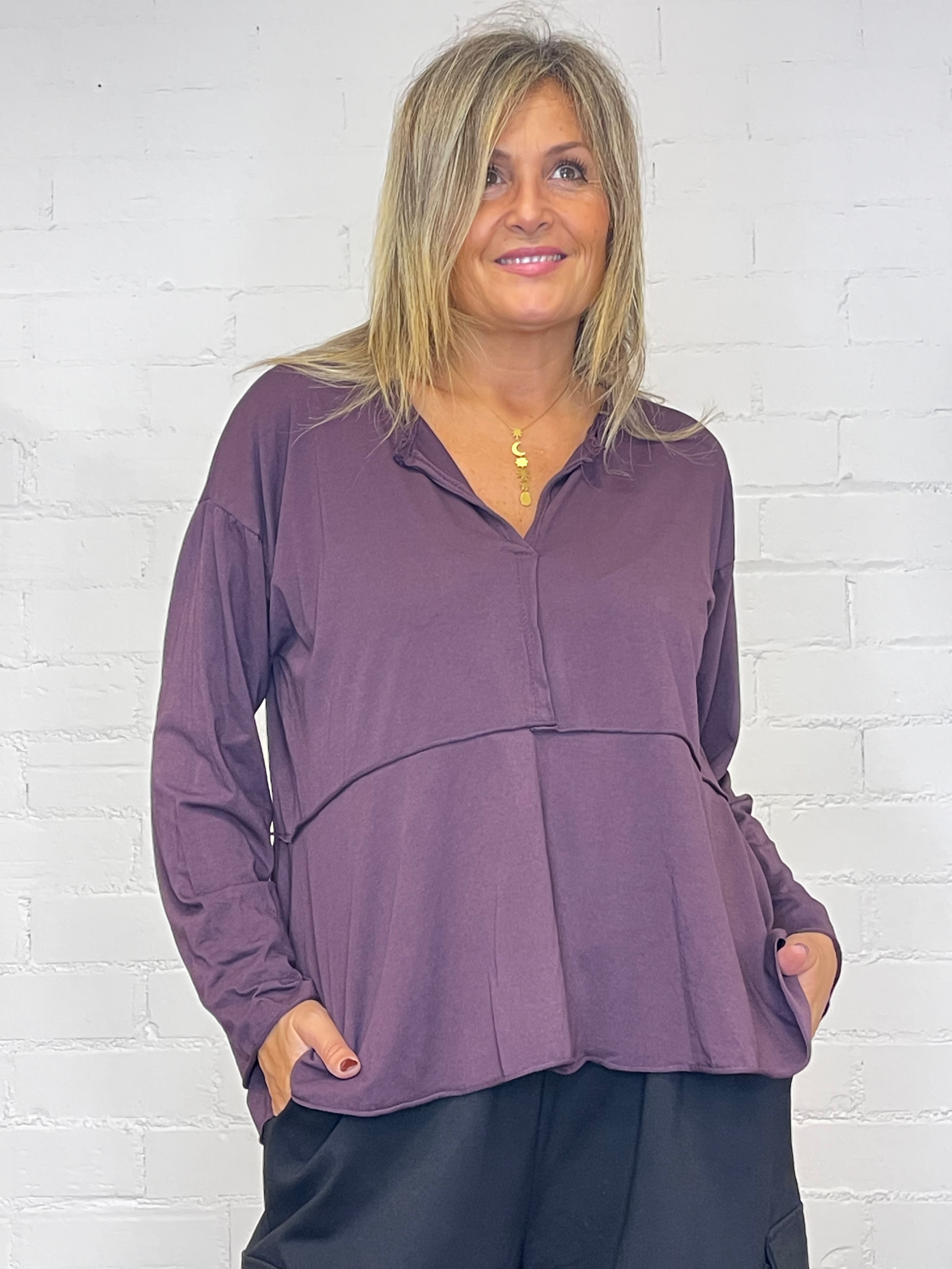 Esta camiseta de algodón suave destaca por sus detalles de costuras decorativas, que aportan un toque moderno y original al diseño. Presenta una costura central que parte del escote hasta la mitad del cuerpo y otra costura bajo el pecho que rodea toda la prenda, realzando la silueta de forma sutil y elegante.