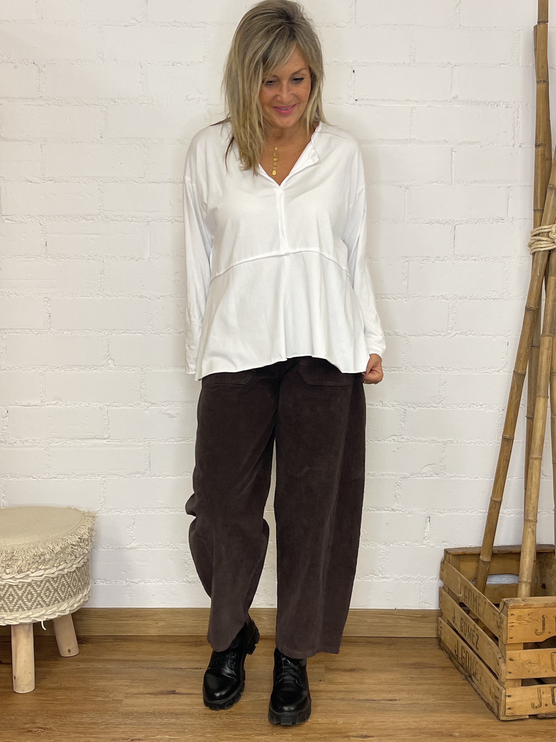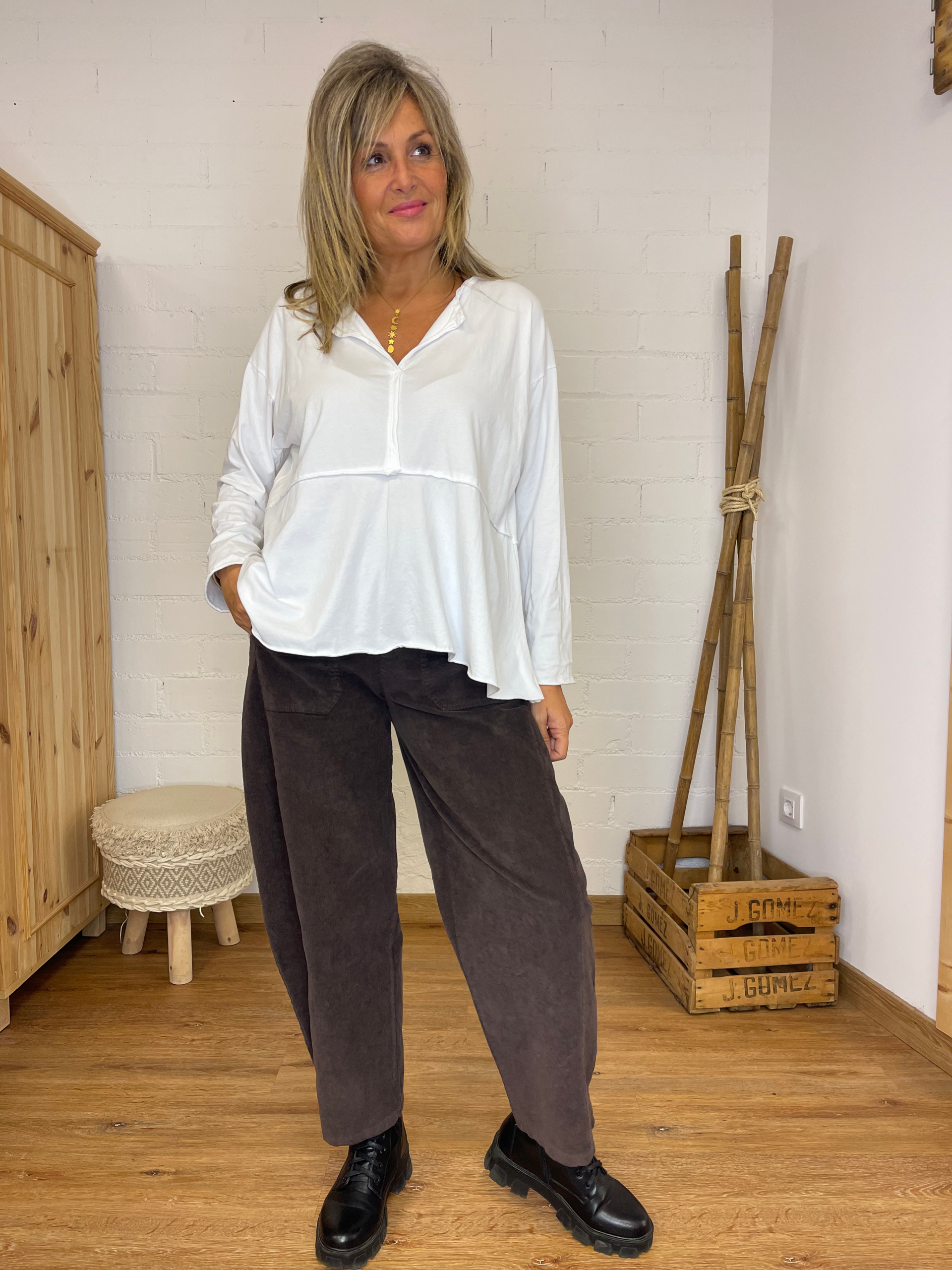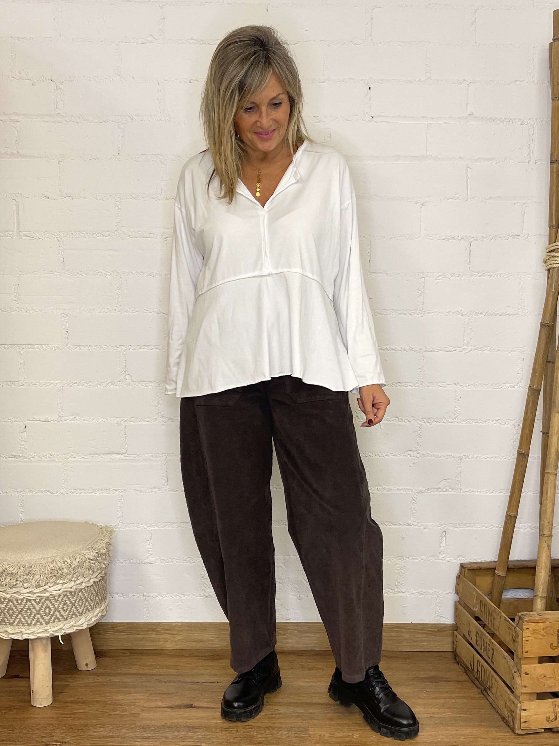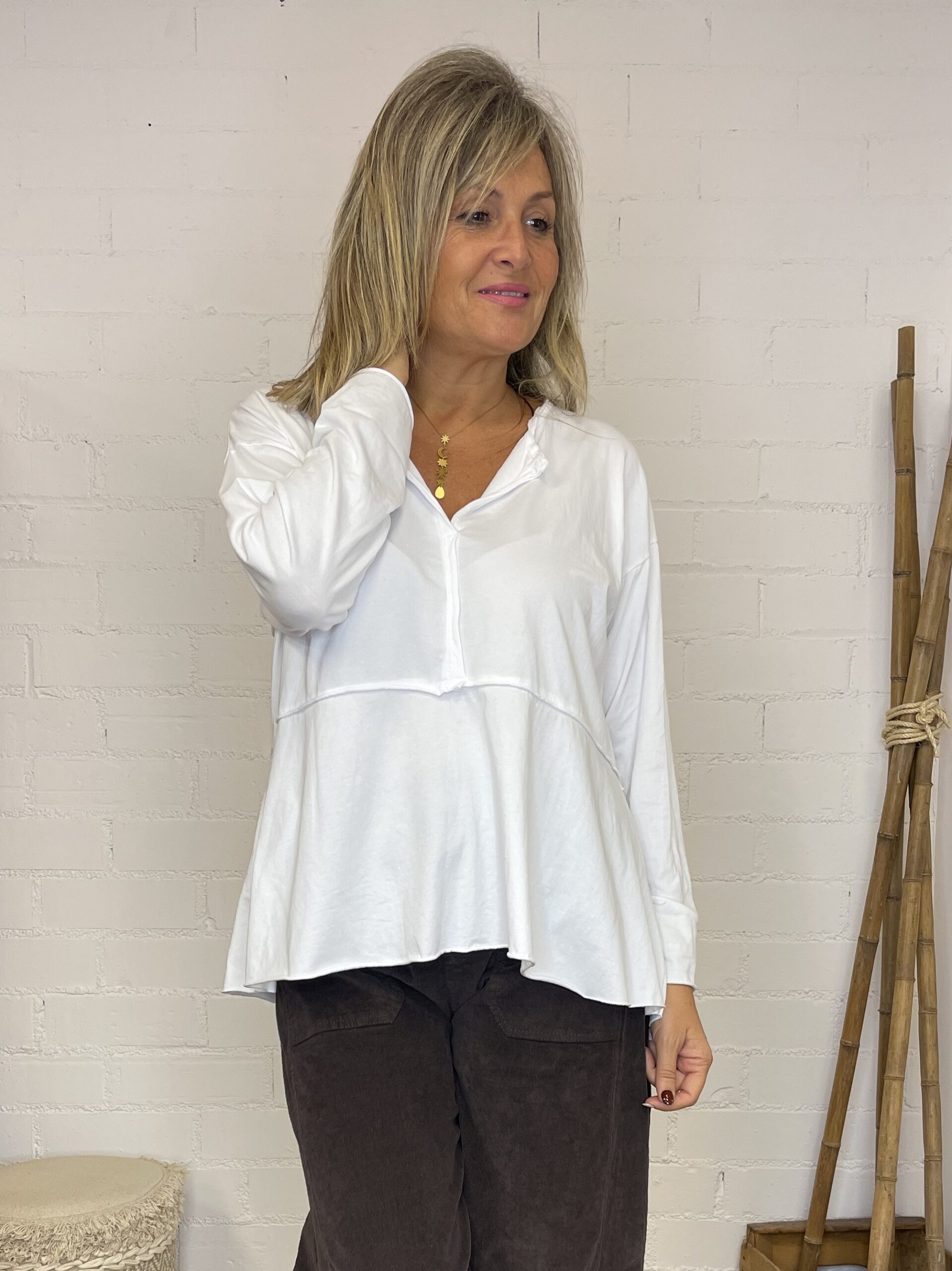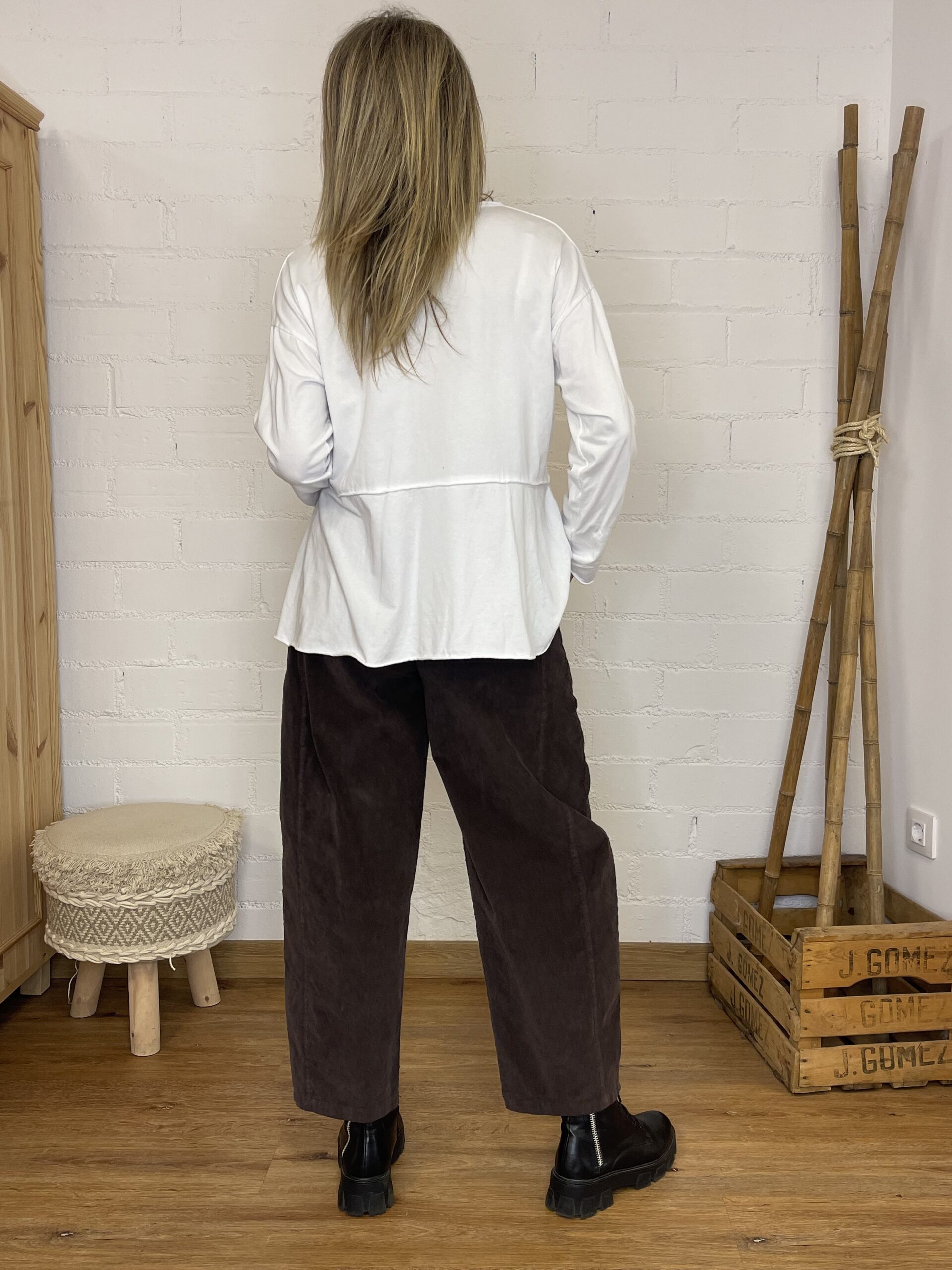 Esta camiseta de algodón suave destaca por sus detalles de costuras decorativas, que aportan un toque moderno y original al diseño. Presenta una costura central que parte del escote hasta la mitad del cuerpo y otra costura bajo el pecho que rodea toda la prenda, realzando la silueta de forma sutil y elegante.