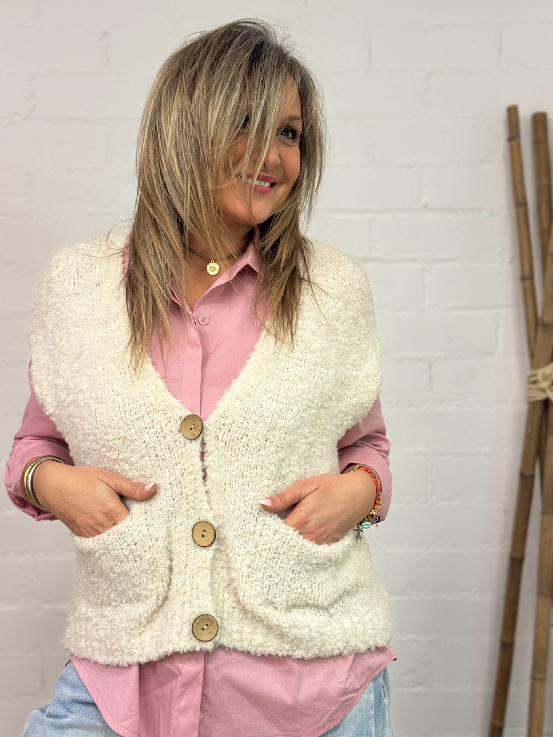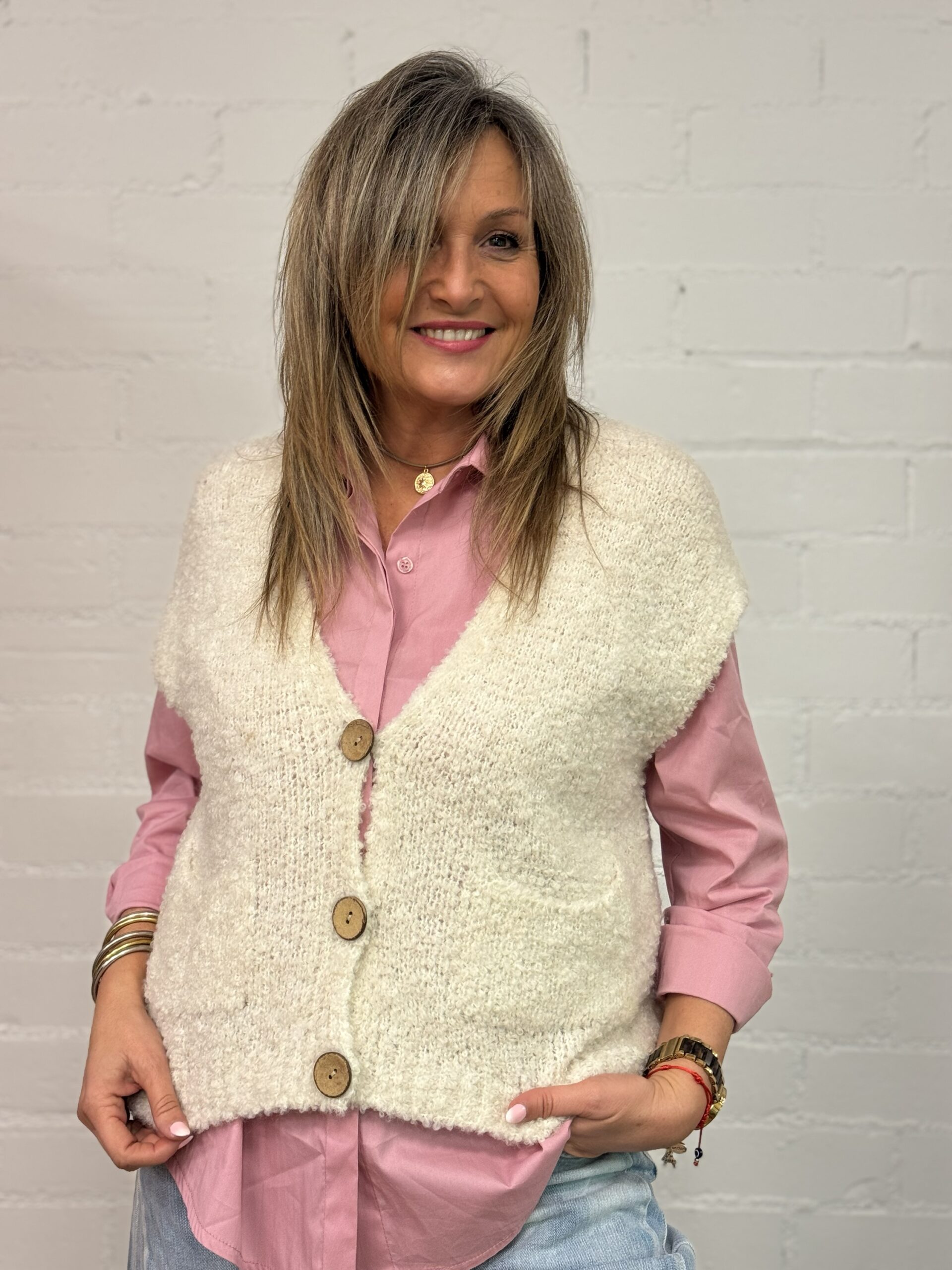 Su cierre frontal de botones estilo madera aporta un toque natural y atemporal, mientras que los bolsillos delanteros añaden funcionalidad sin renunciar al diseño. Ideal para llevar sobre camisas, blusas o camisetas, es perfecto tanto para looks casuales como más cuidados.