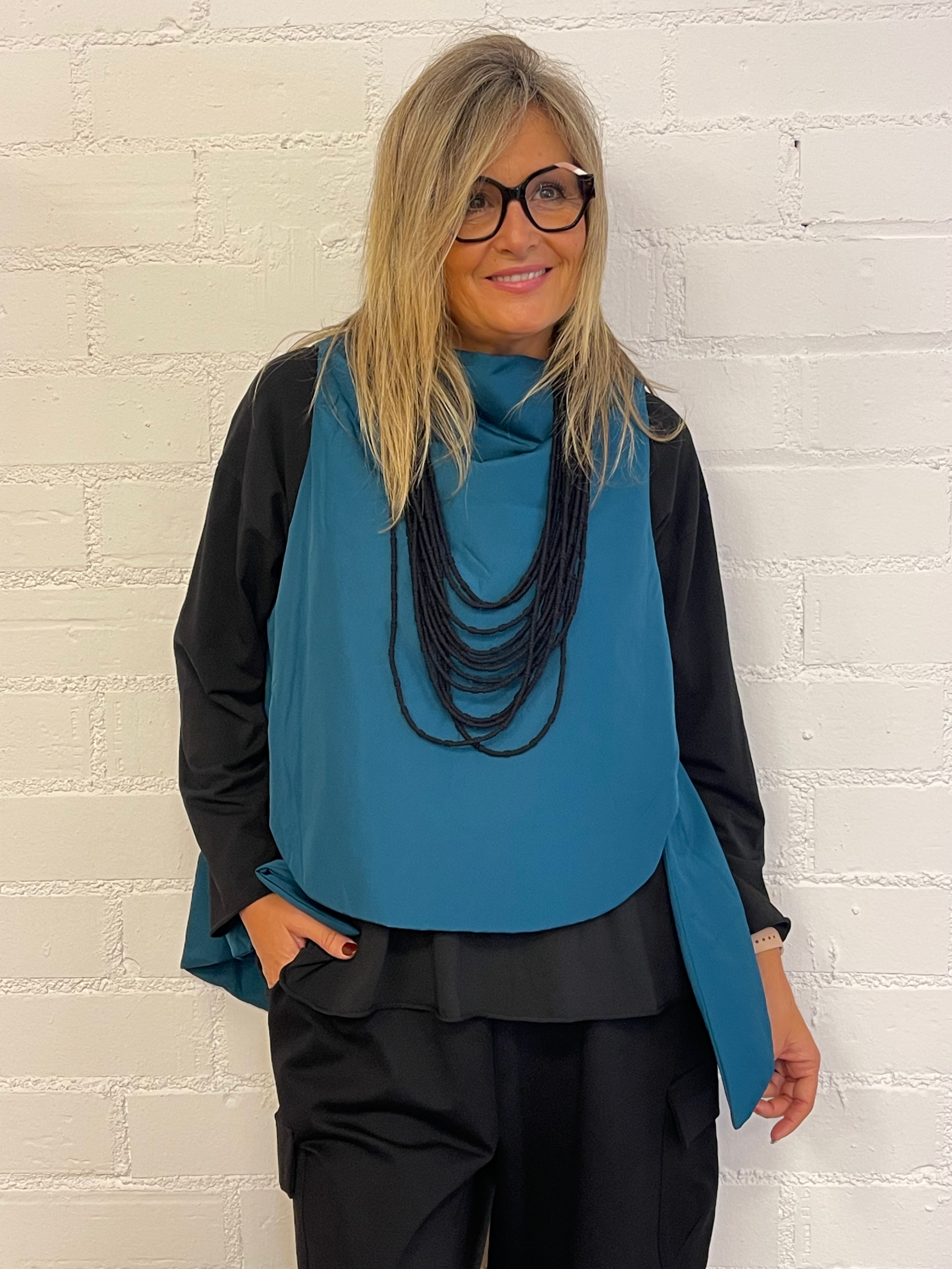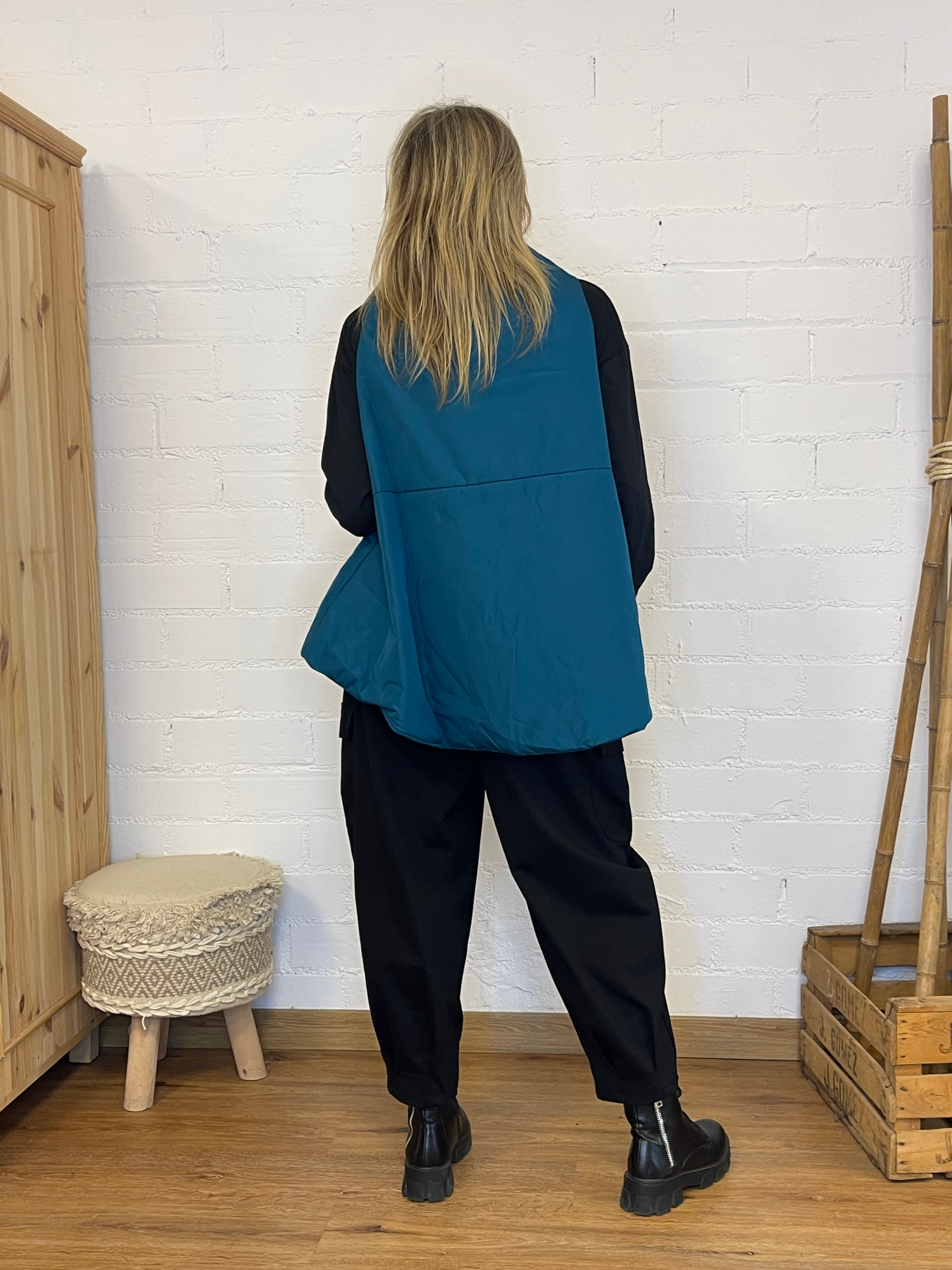 Aporta un toque de estilo y color a tus looks con este chaleco azul petróleo asimétrico, una prenda versátil que combina diseño moderno y confort. Su acabado acolchado ofrece una silueta ligera y elegante, perfecta para los días más frescos.