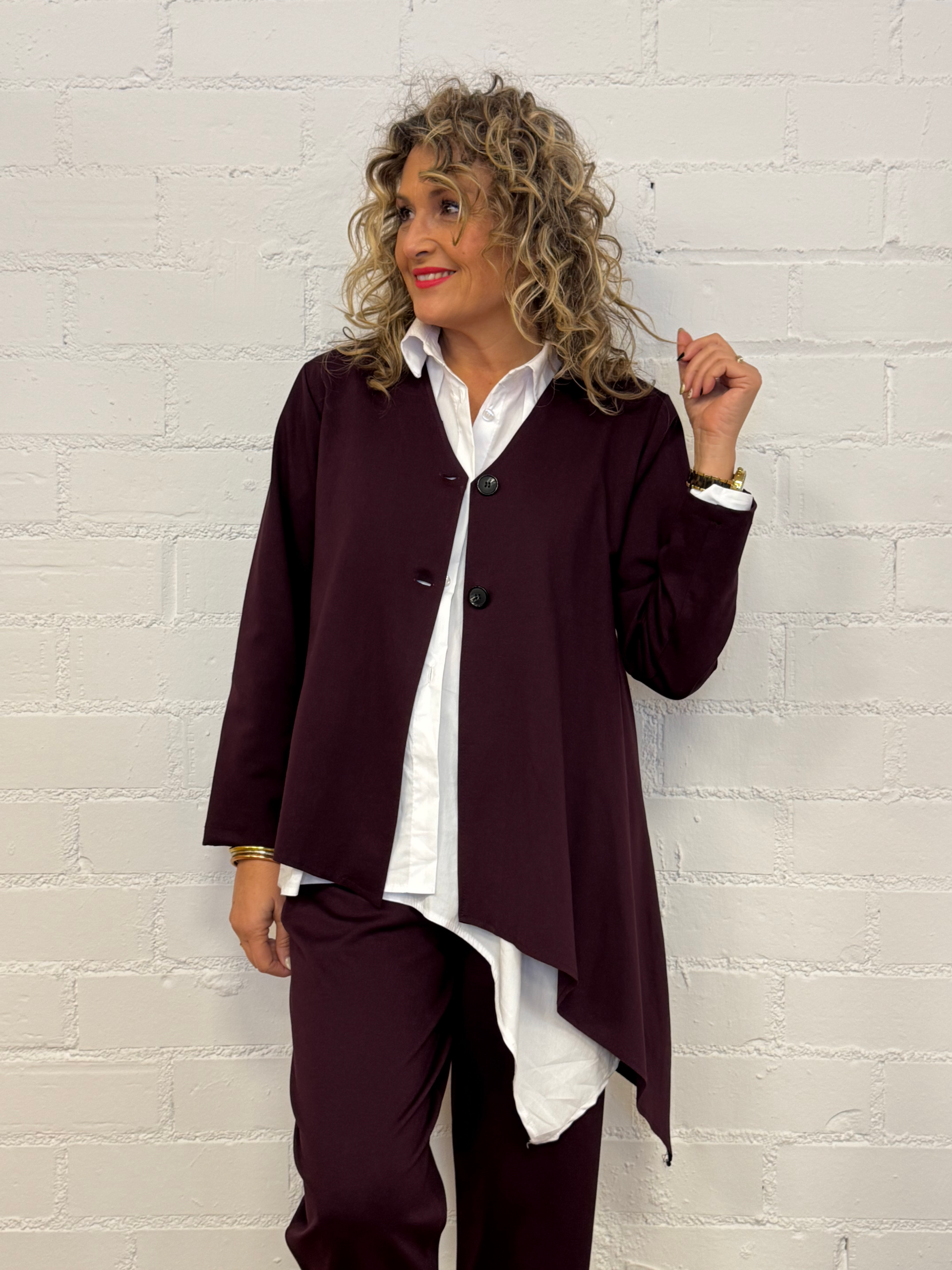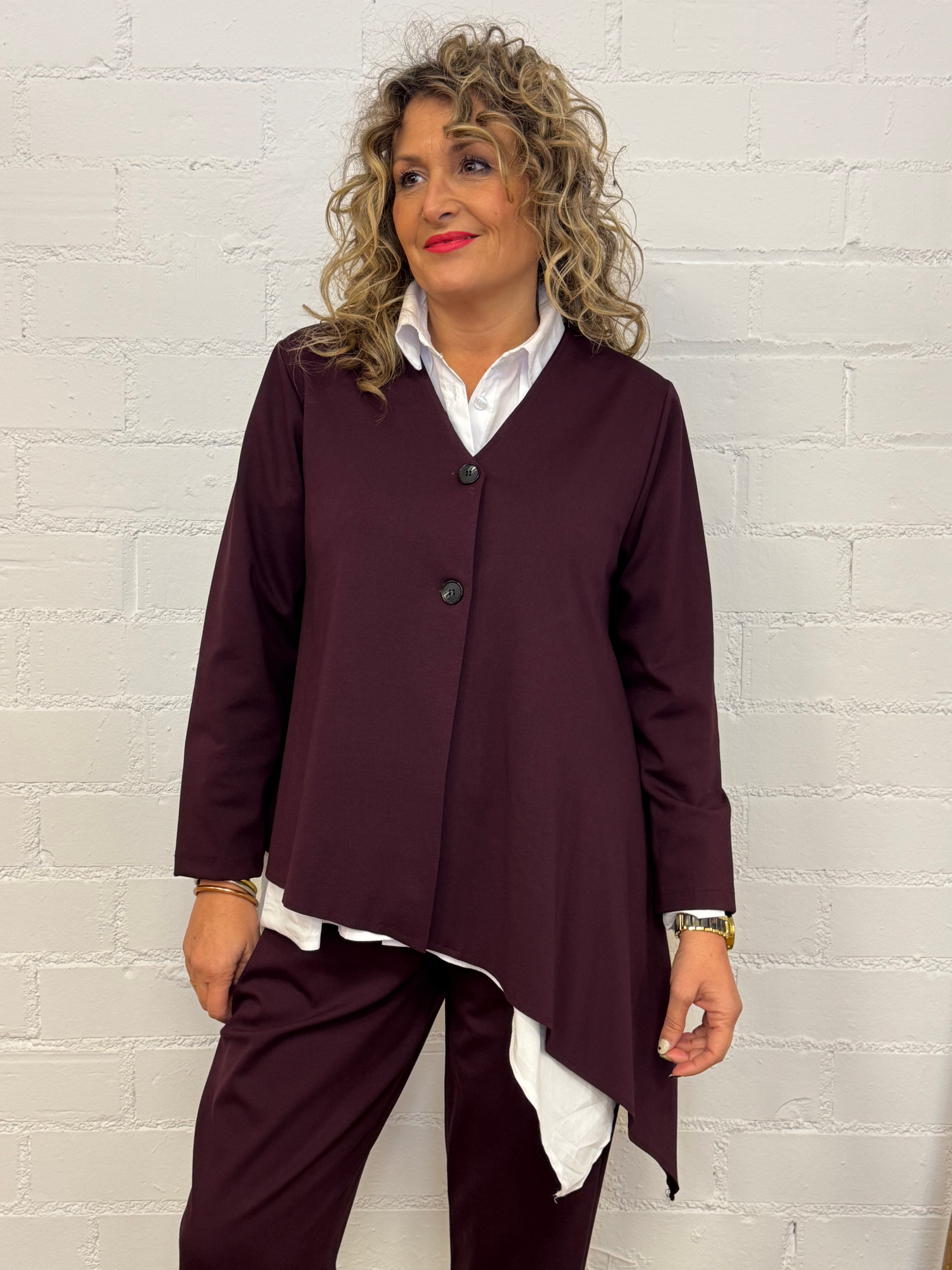 Dale un toque de elegancia contemporánea a tus looks con esta chaqueta confeccionada en suave tejido de punto Milano, conocida por su textura firme, confortable y con una caída impecable. Su diseño asimétrico con un delicado pico en un lateral aporta un aire moderno y favorecedor, ideal para estilizar la silueta.