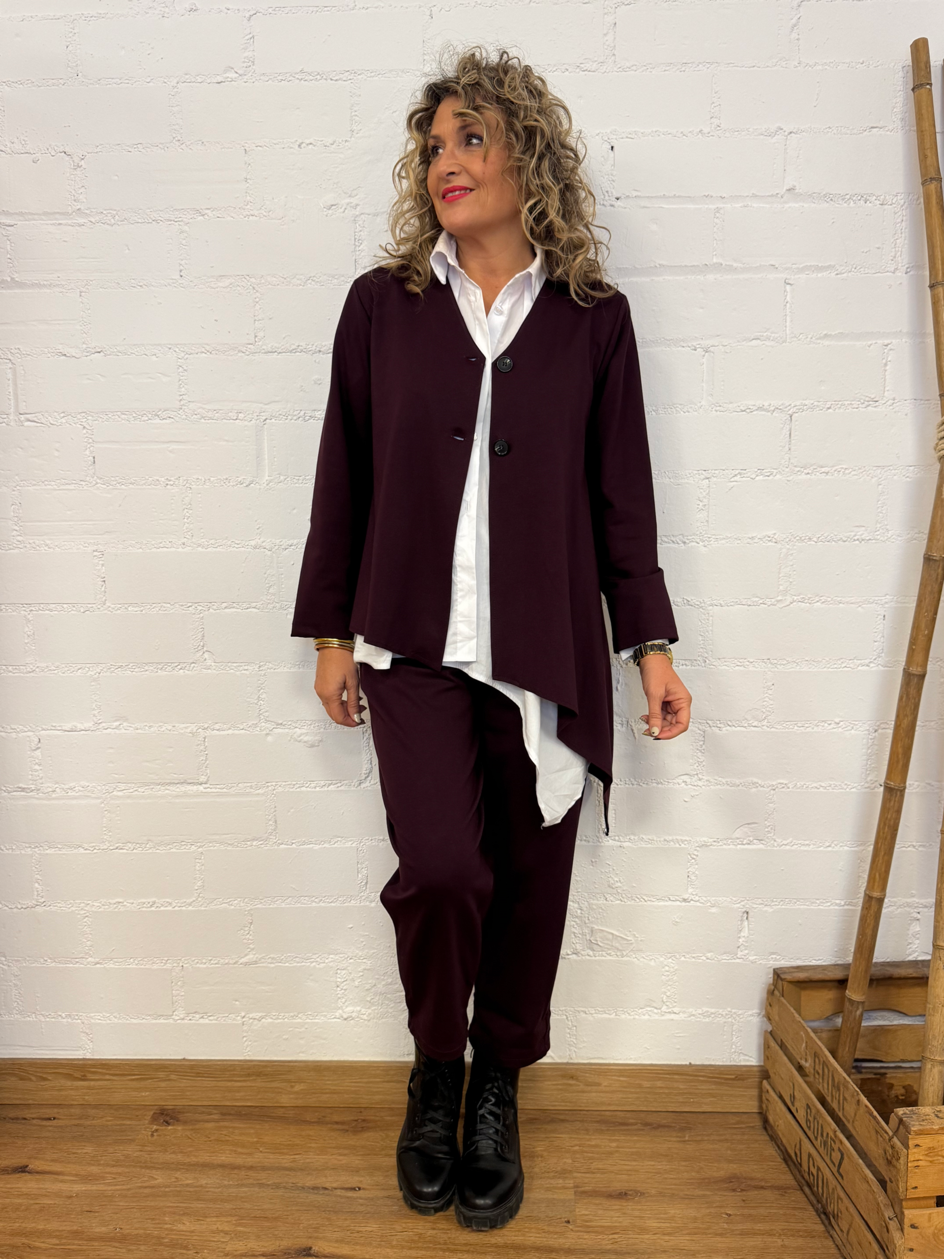 Cuenta con un cierre frontal de botones que realza su línea minimalista y permite llevarla tanto abierta como cerrada, según el estilo que busques. Perfecta para combinar con pantalones de vestir o vaqueros, esta chaqueta es una prenda versátil que te acompañará en cualquier ocasión.