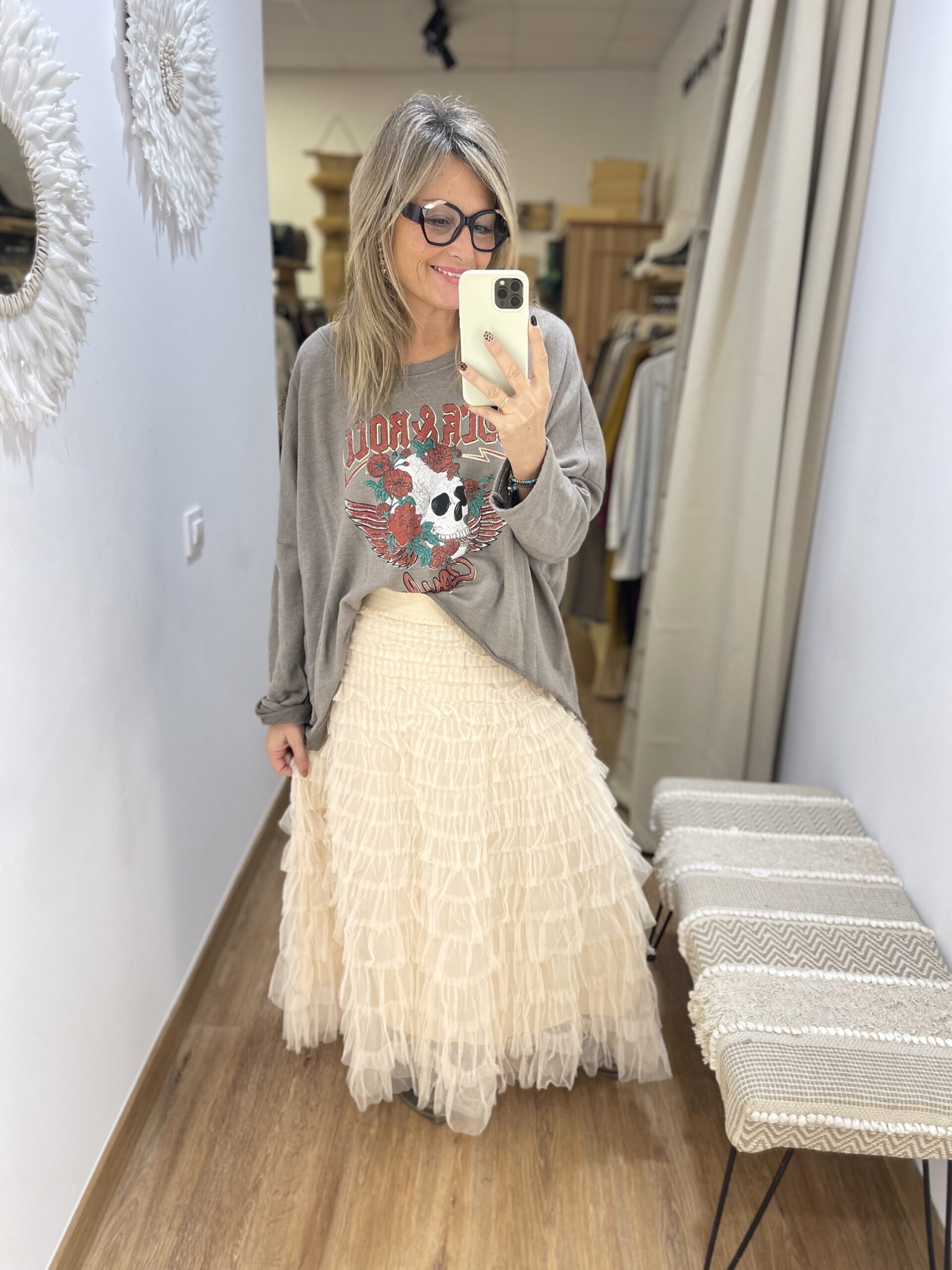 Falda larga de tul con volantes, goma en la cintura y forro en la parte interna.
