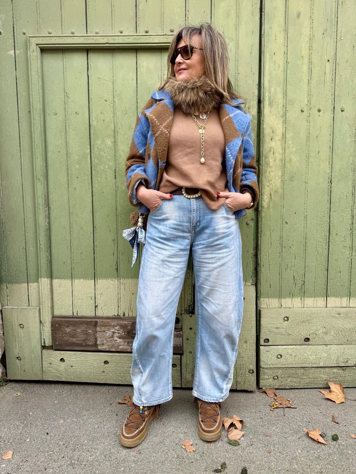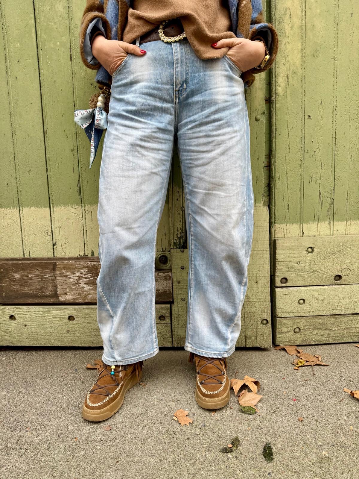 Este pantalón tejano tipo barrel se caracteriza por su silueta moderna y favorecedora: volumen en la zona de la cadera y el muslo, con una pierna ligeramente curvada que se va estrechando suavemente hacia el bajo. Un diseño actual que aporta estilo y comodidad a partes iguales.