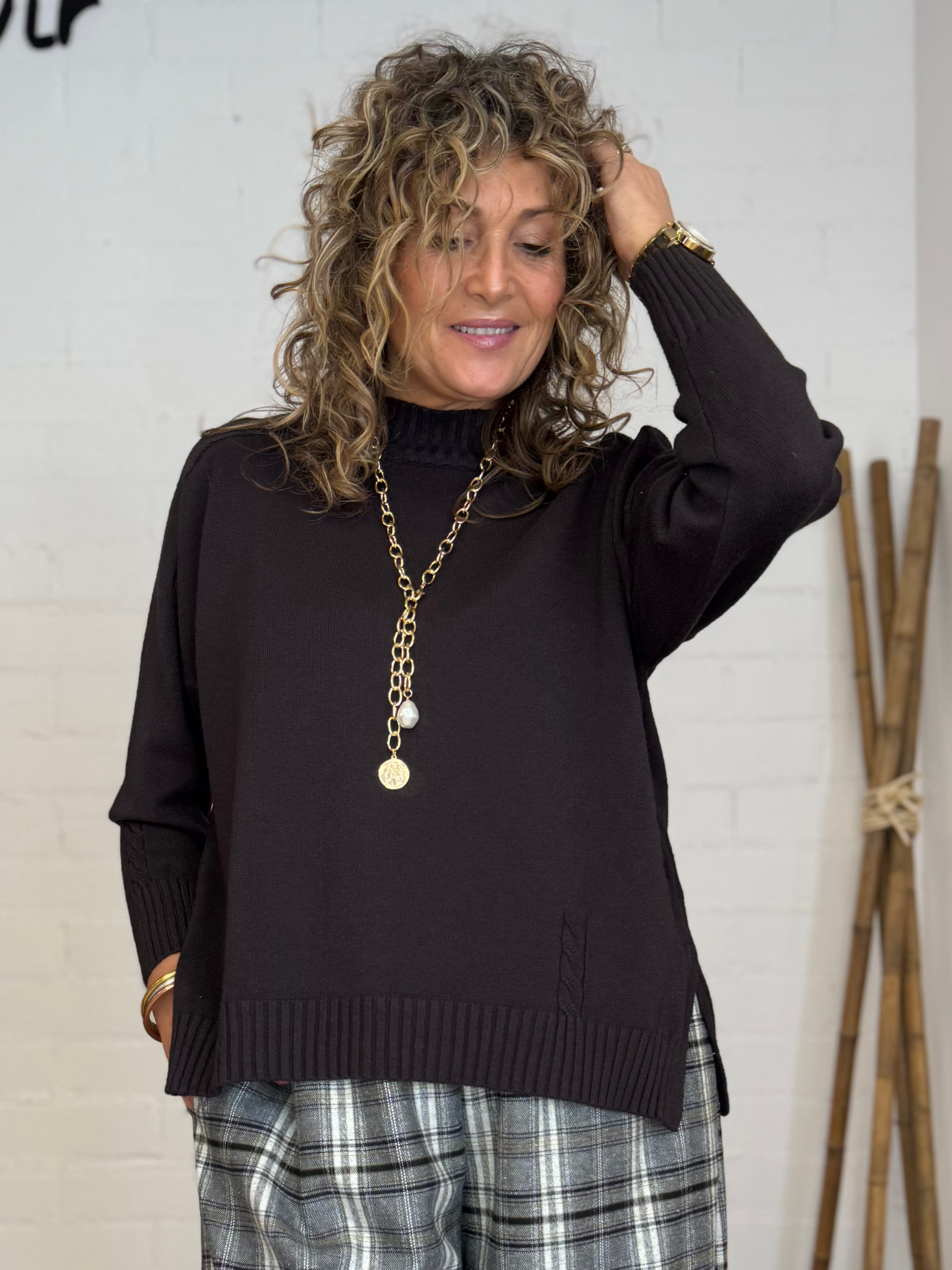 Este jersey de punto combina estilo y comodidad en una prenda versátil. Su manga larga y cuello Perkins ofrecen abrigo y un acabado elegante, mientras que las aperturas en los laterales del bajo aportan movimiento y un toque contemporáneo.