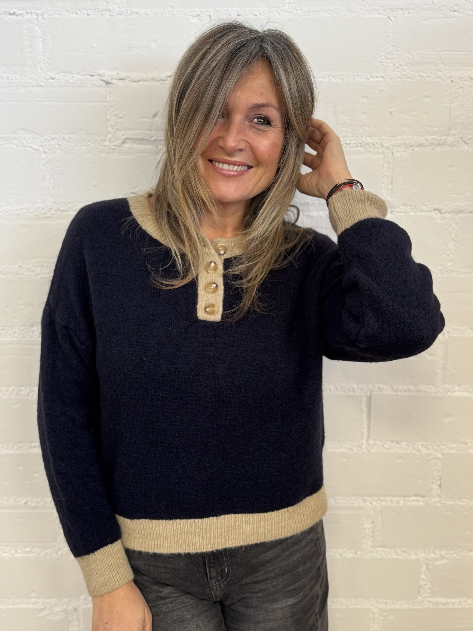 Los ribetes del cuello, las mangas y el bajo en color a contraste aportan un detalle especial que realza el diseño, mientras que su tejido muy suave lo convierte en una opción ideal para llevar durante todo el día. Un jersey cálido, cómodo y con un toque distintivo para completar tus looks de temporada.