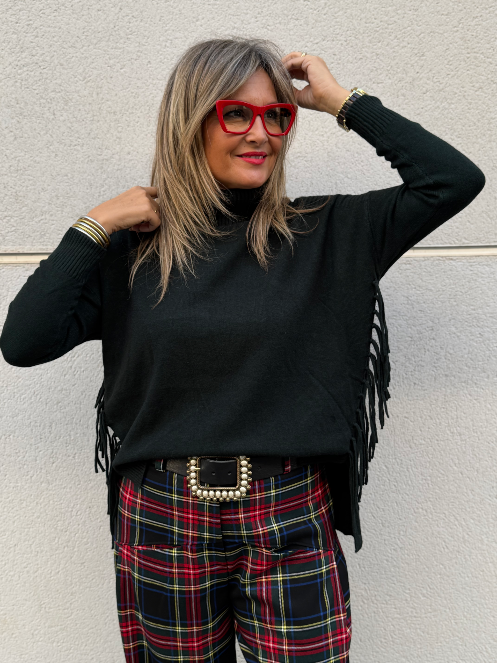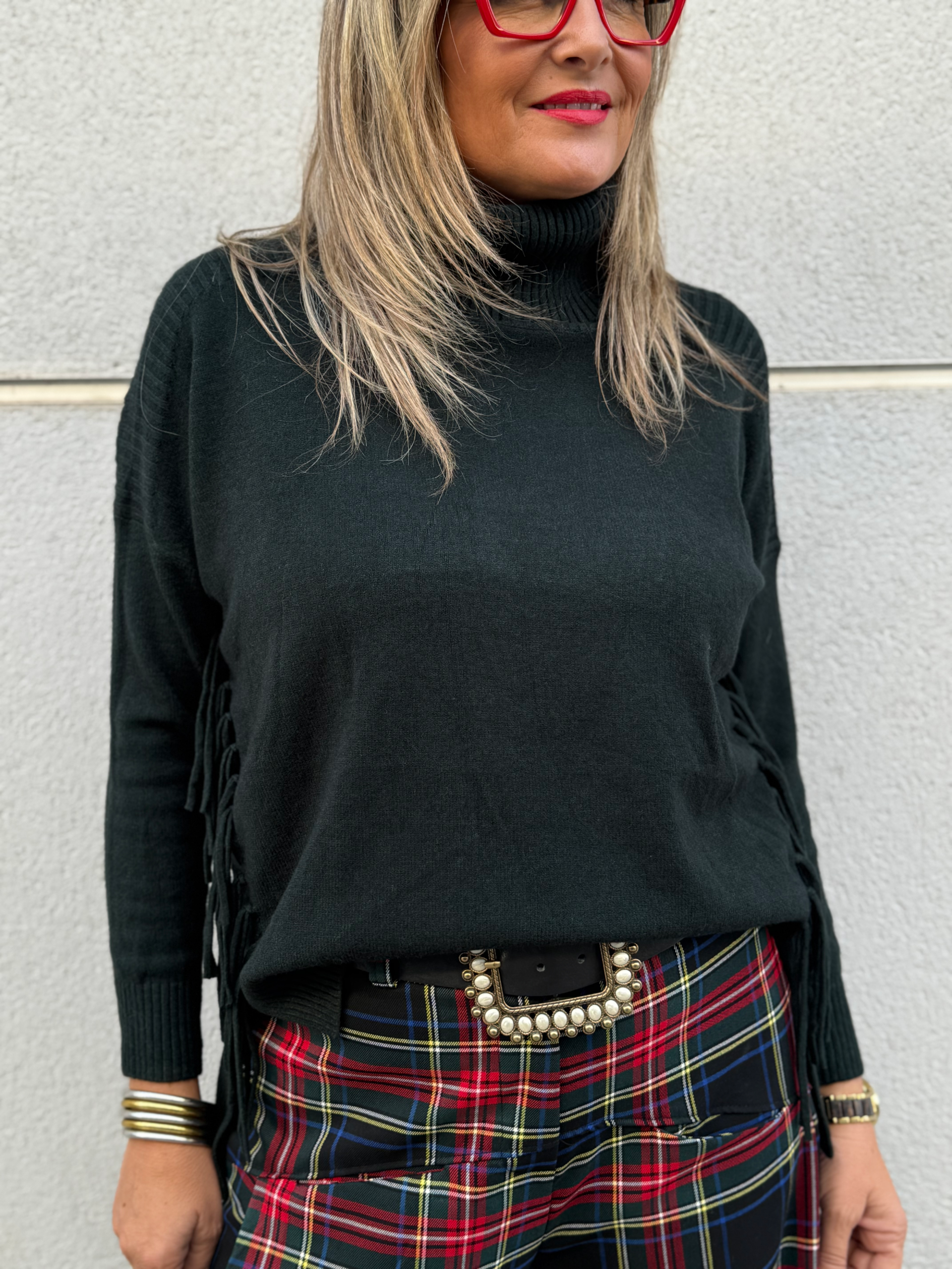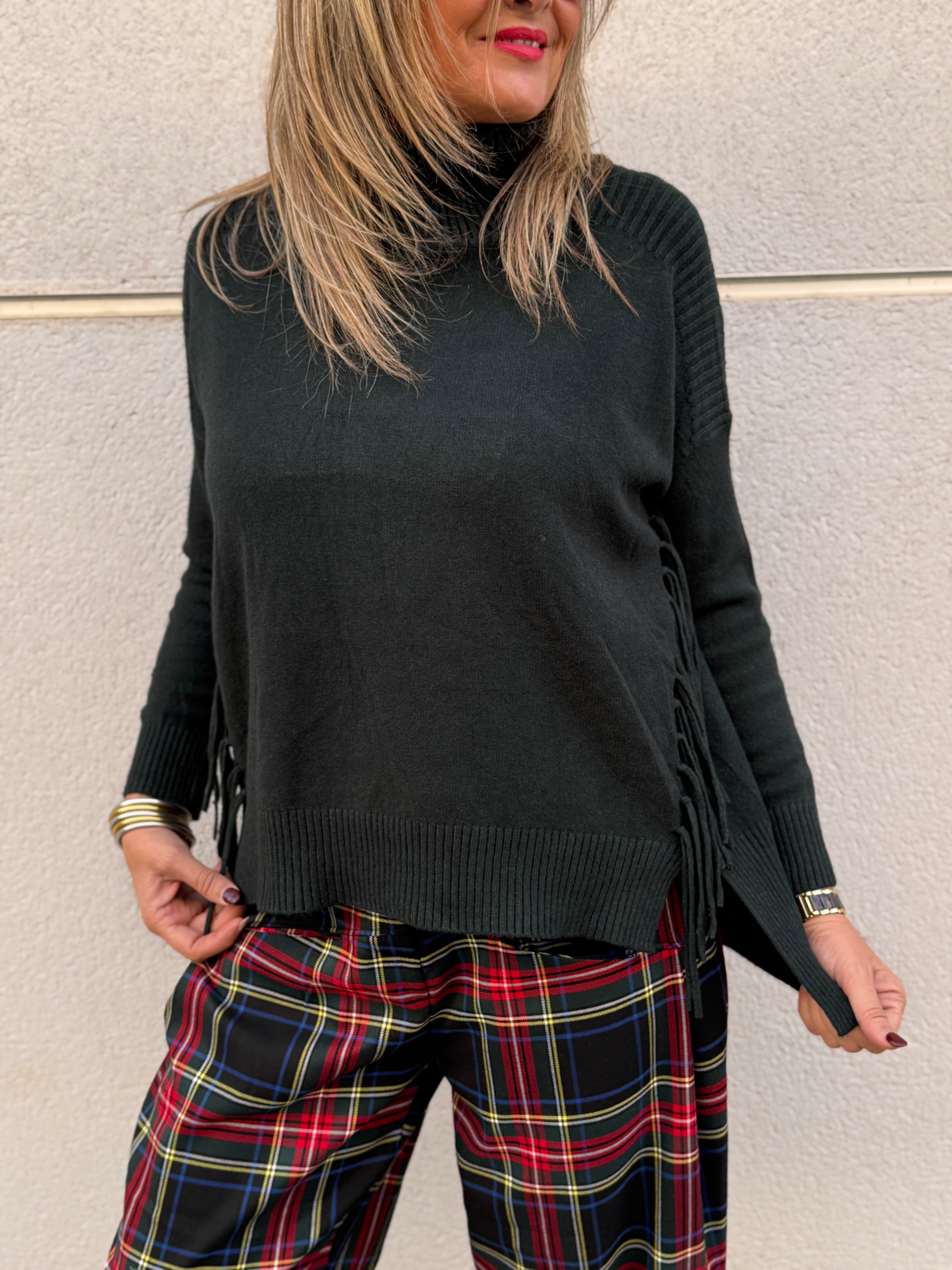 Jersey de punto de cuello alto con decoración de flecos en los laterales.