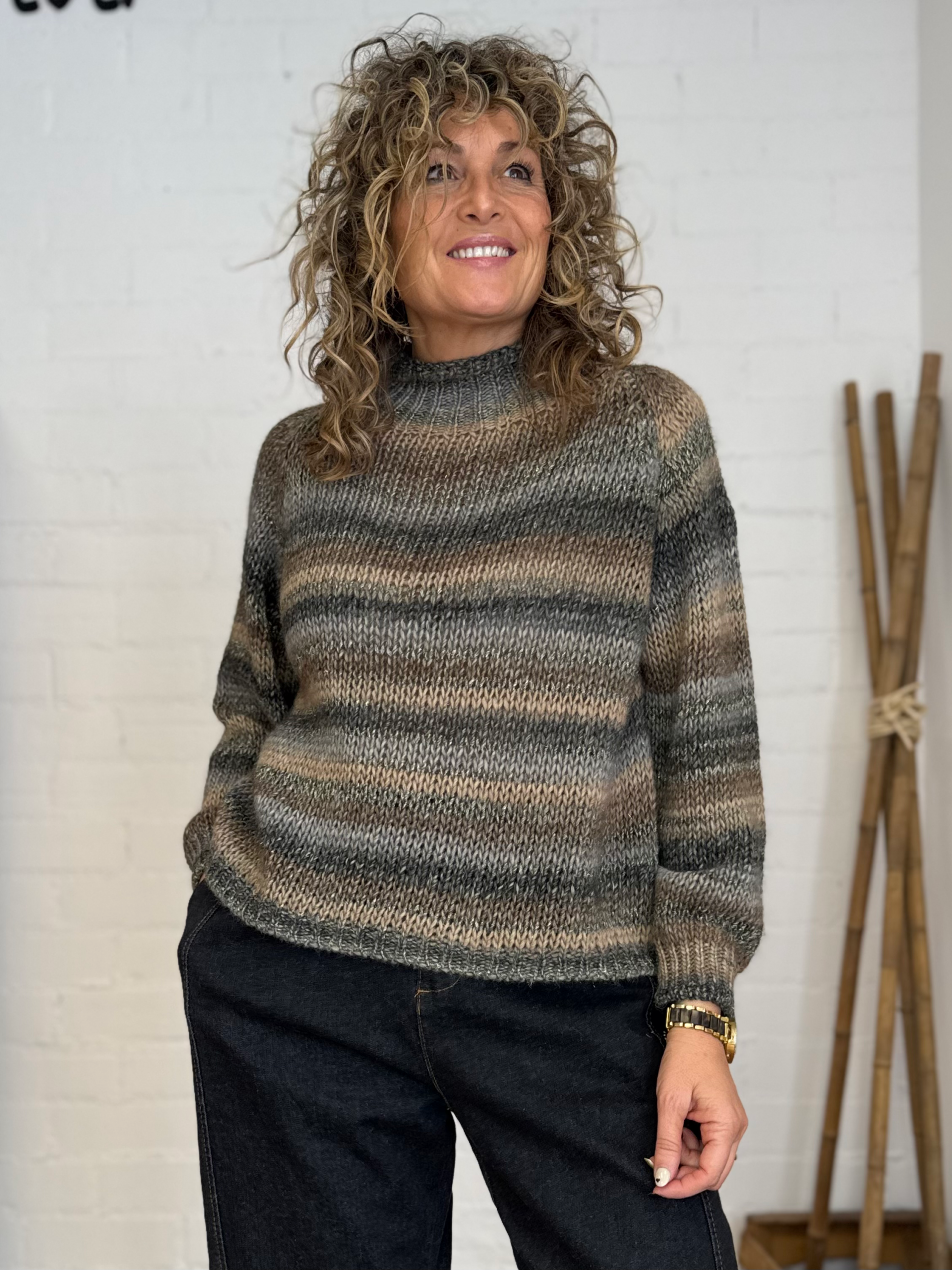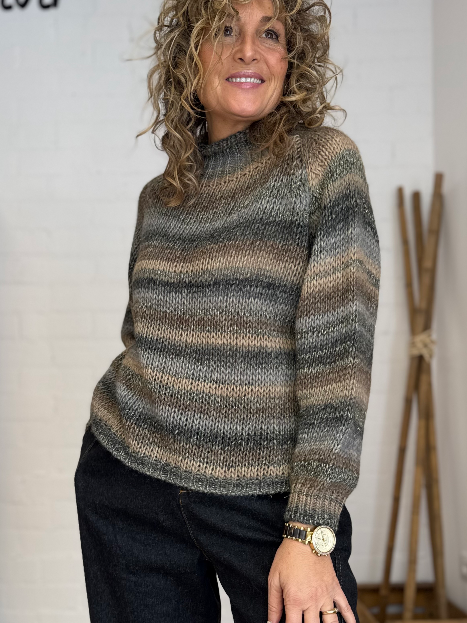 Este jersey de lana combina calidez y estilo en una prenda perfecta para la temporada. Presenta un diseño de rayas en tonos verdes, muy favorecedor y fácil de combinar. Su cuello Perkins aporta un toque actual y cómodo, ideal para los días más frescos.