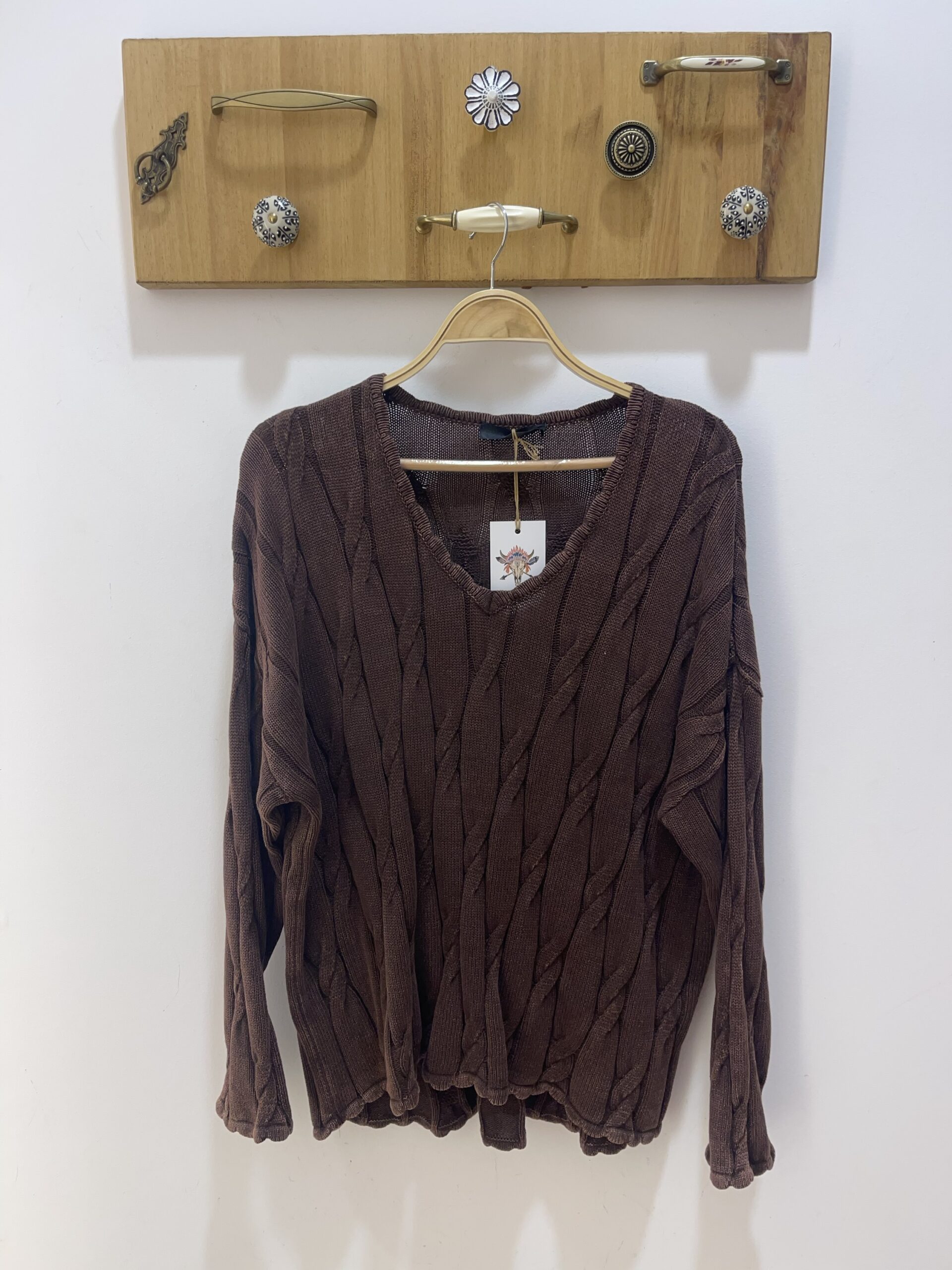 Este jersey de manga larga combina elegancia y comodidad en una prenda atemporal. Su cuello de pico realza la silueta y aporta un toque favorecedor, mientras que el acabado trenzado le da textura y un estilo clásico renovado.