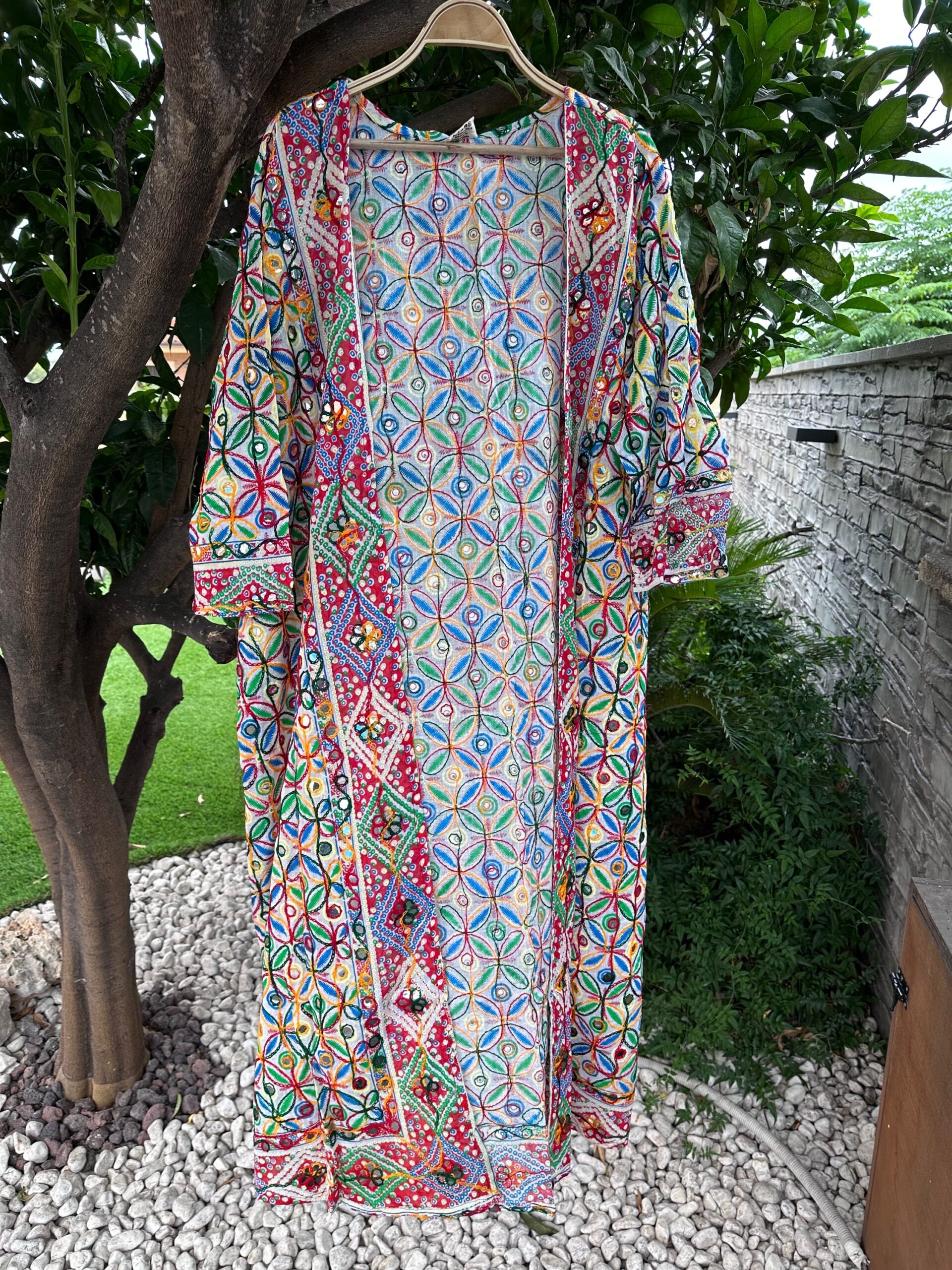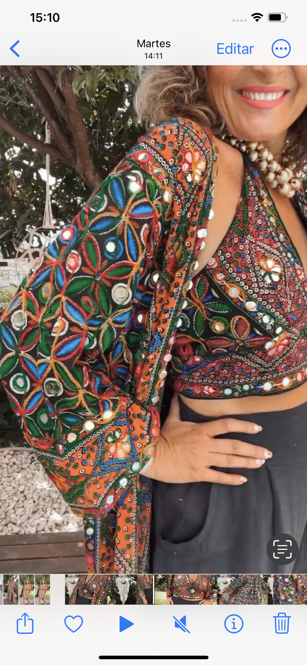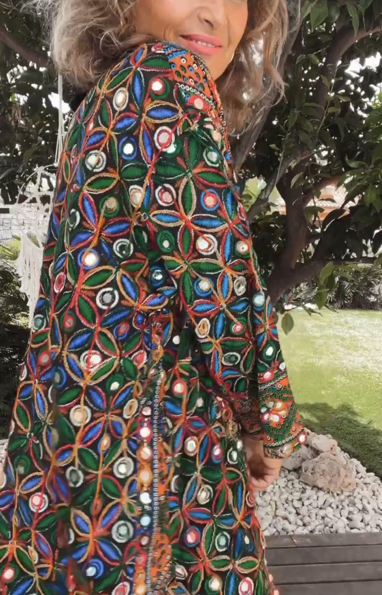 Destacan sus múltiples bordados con hilos de color sobre la base lisa y sus detalles brillantes. Disponible en varios colores.