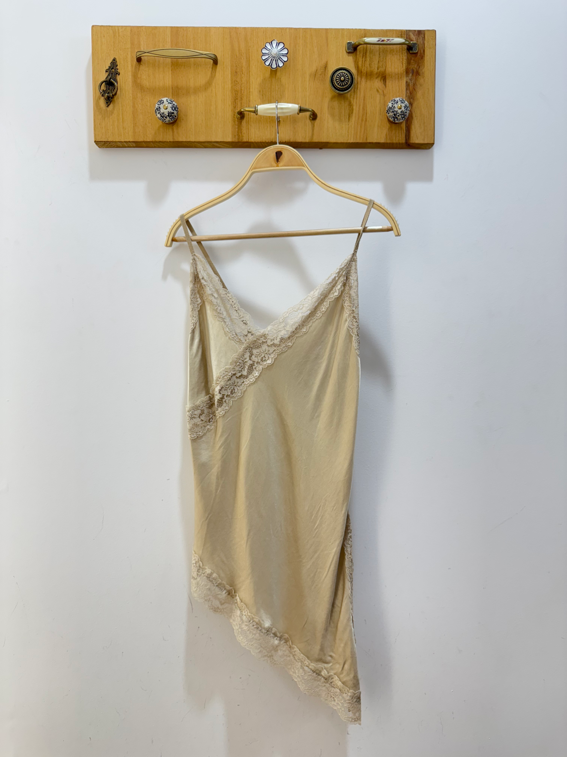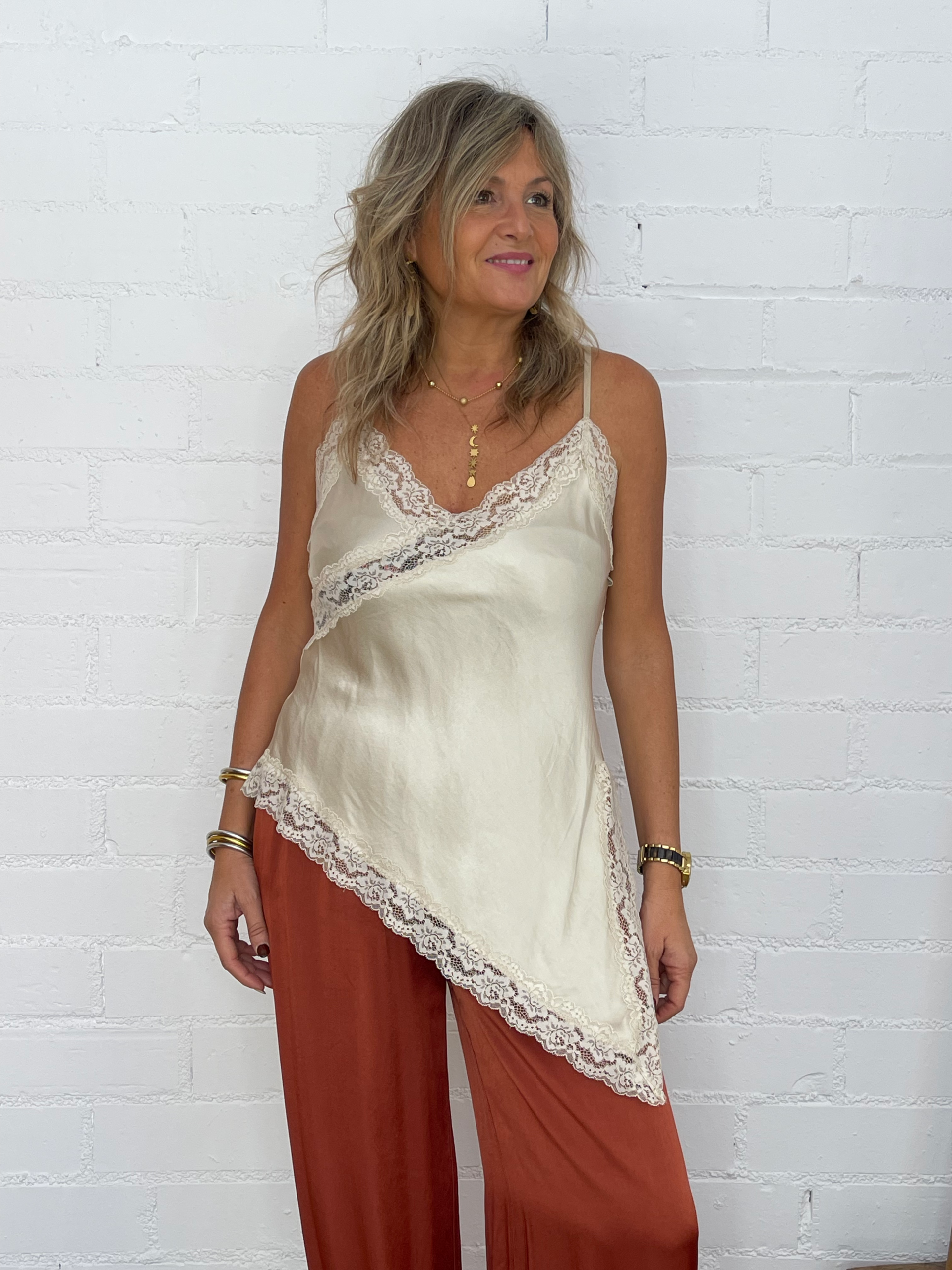Femenina, sofisticada y con un toque sensual, esta lencera asimétrica de raso satinado se convertirá en una pieza clave de tu armario. Su escote en pico y los delicados detalles de encaje en el escote y el bajo realzan la silueta con sutileza y elegancia.