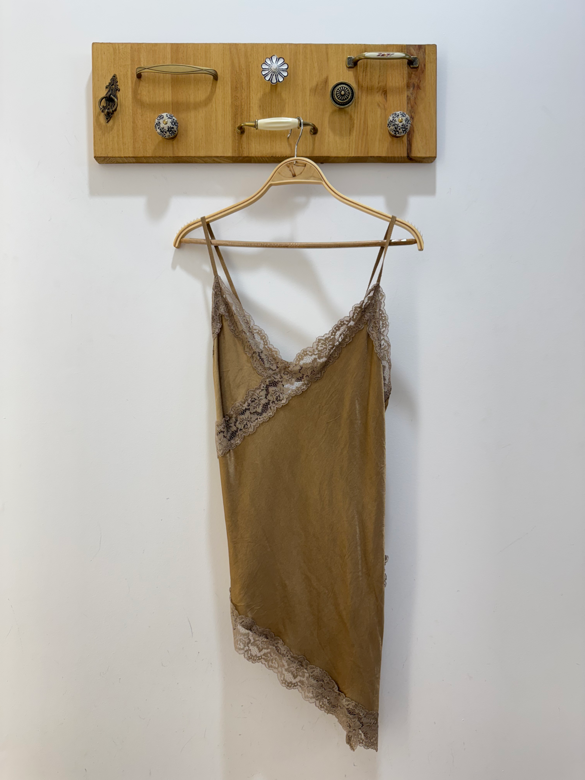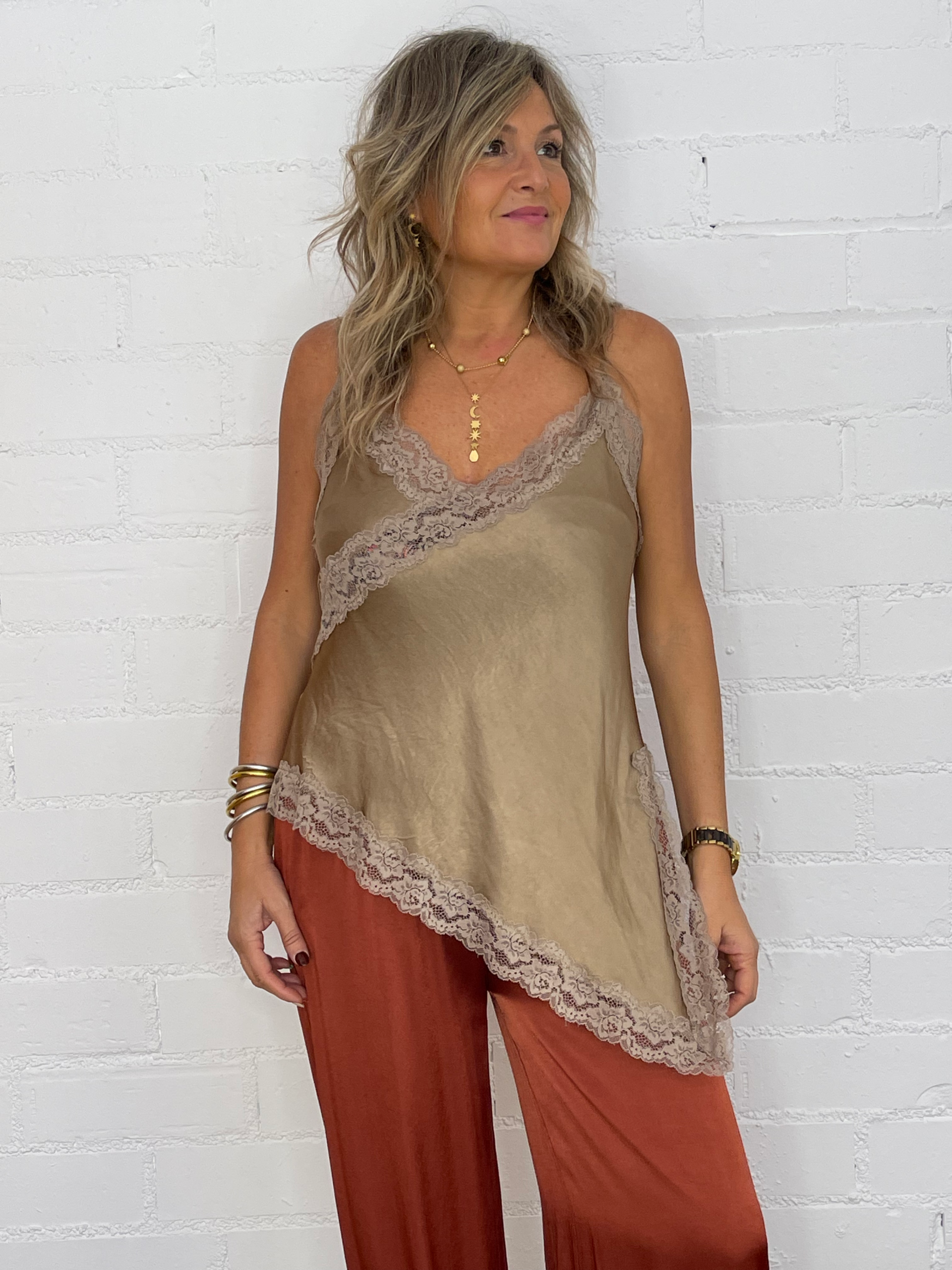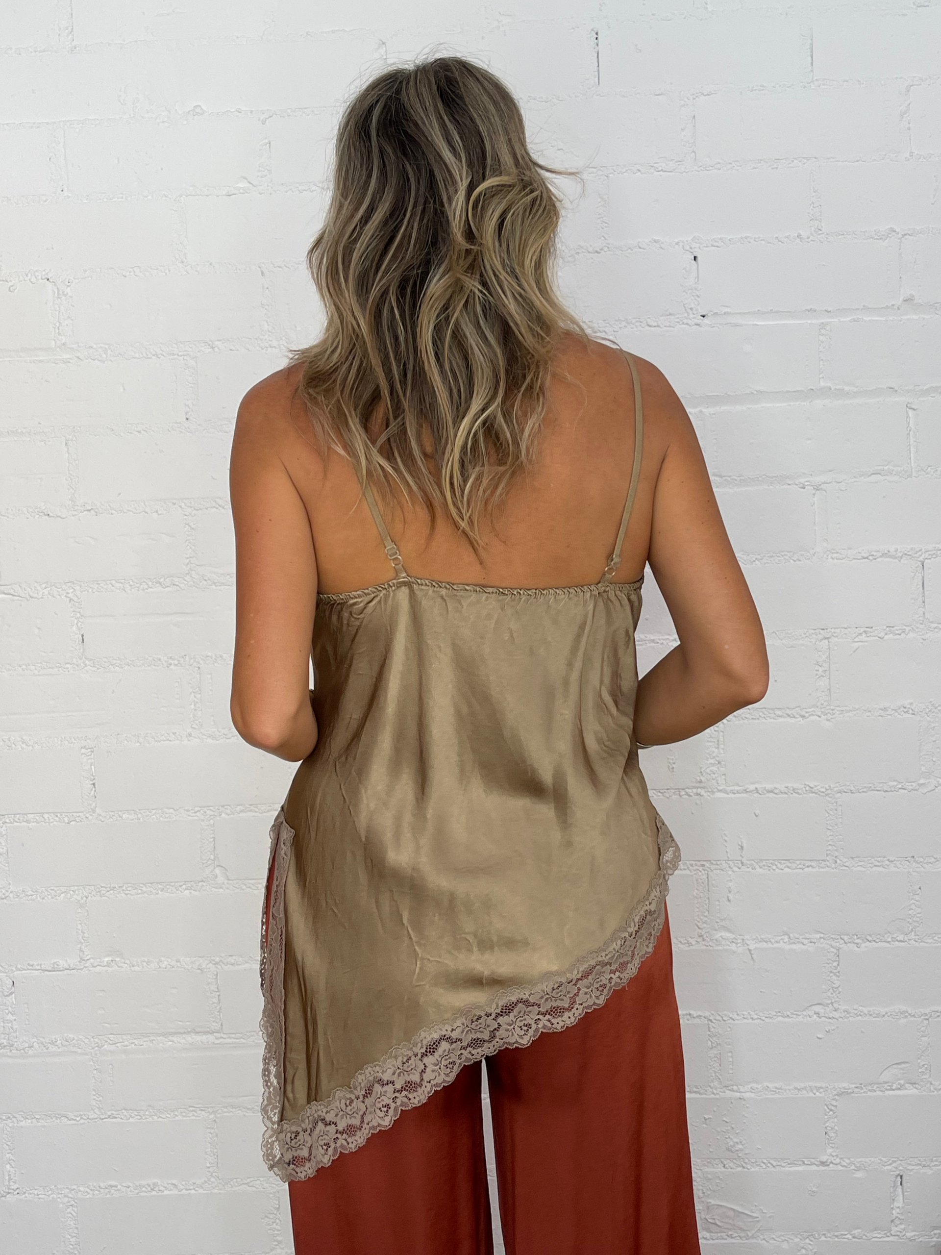Femenina, sofisticada y con un toque sensual, esta lencera asimétrica de raso satinado se convertirá en una pieza clave de tu armario. Su escote en pico y los delicados detalles de encaje en el escote y el bajo realzan la silueta con sutileza y elegancia.