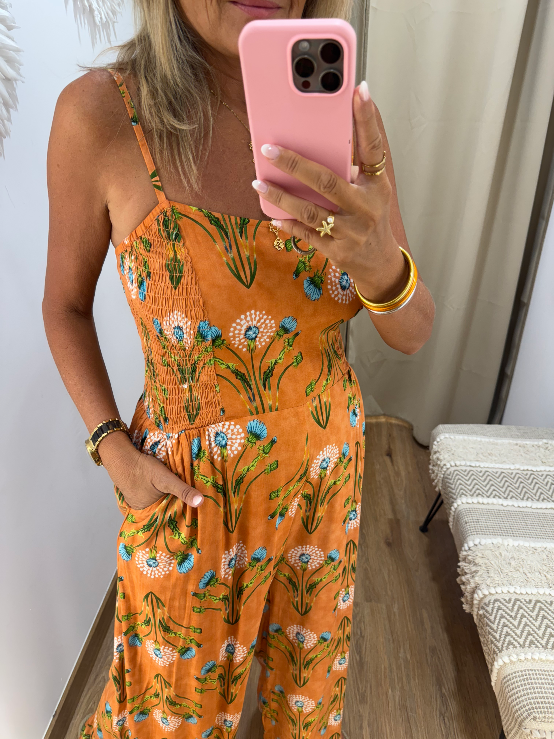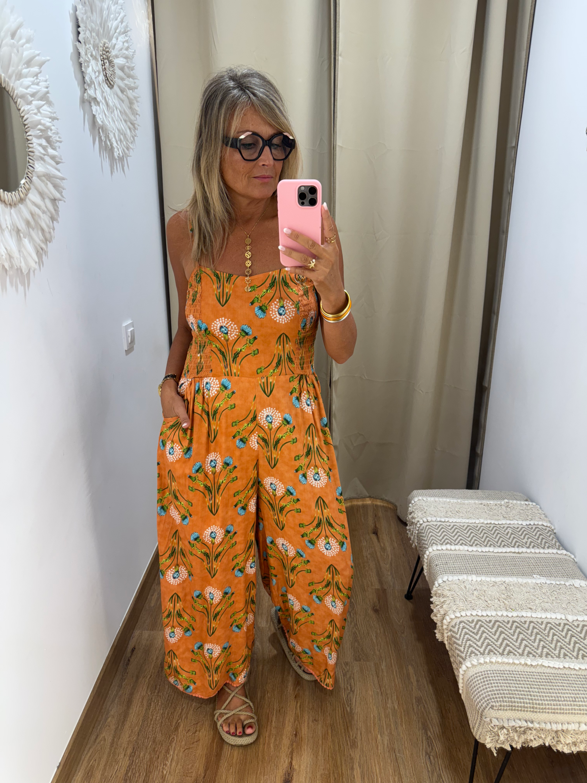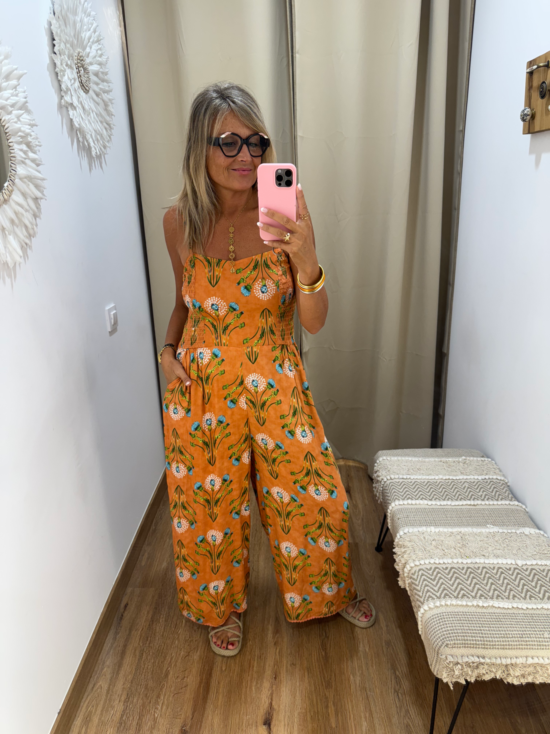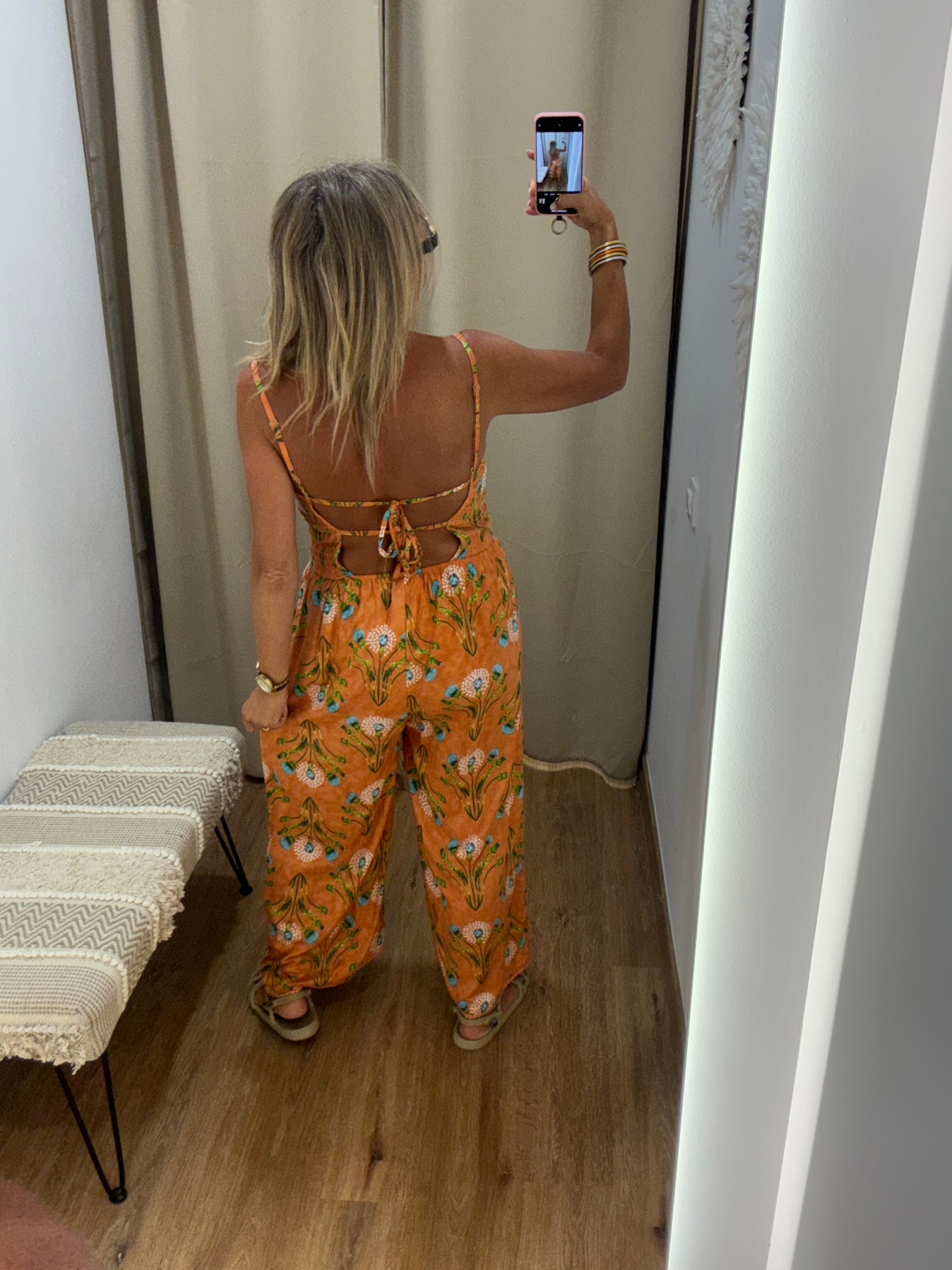 Mono estampado en tejido de viscosa. Tirante regulable, dos cintas en la espalda para ajustar, elástico nido de abeja en los laterales, bolsillos.