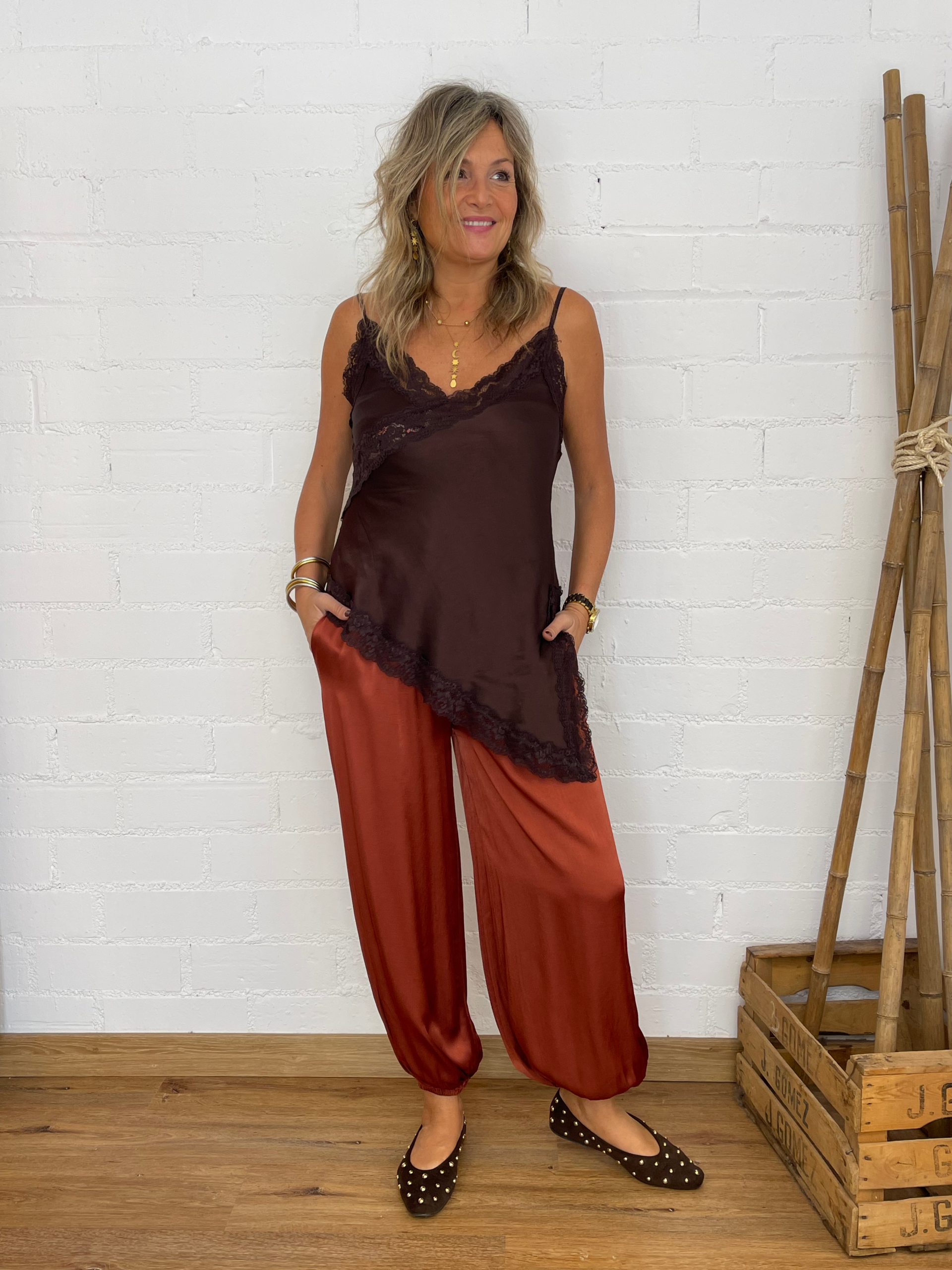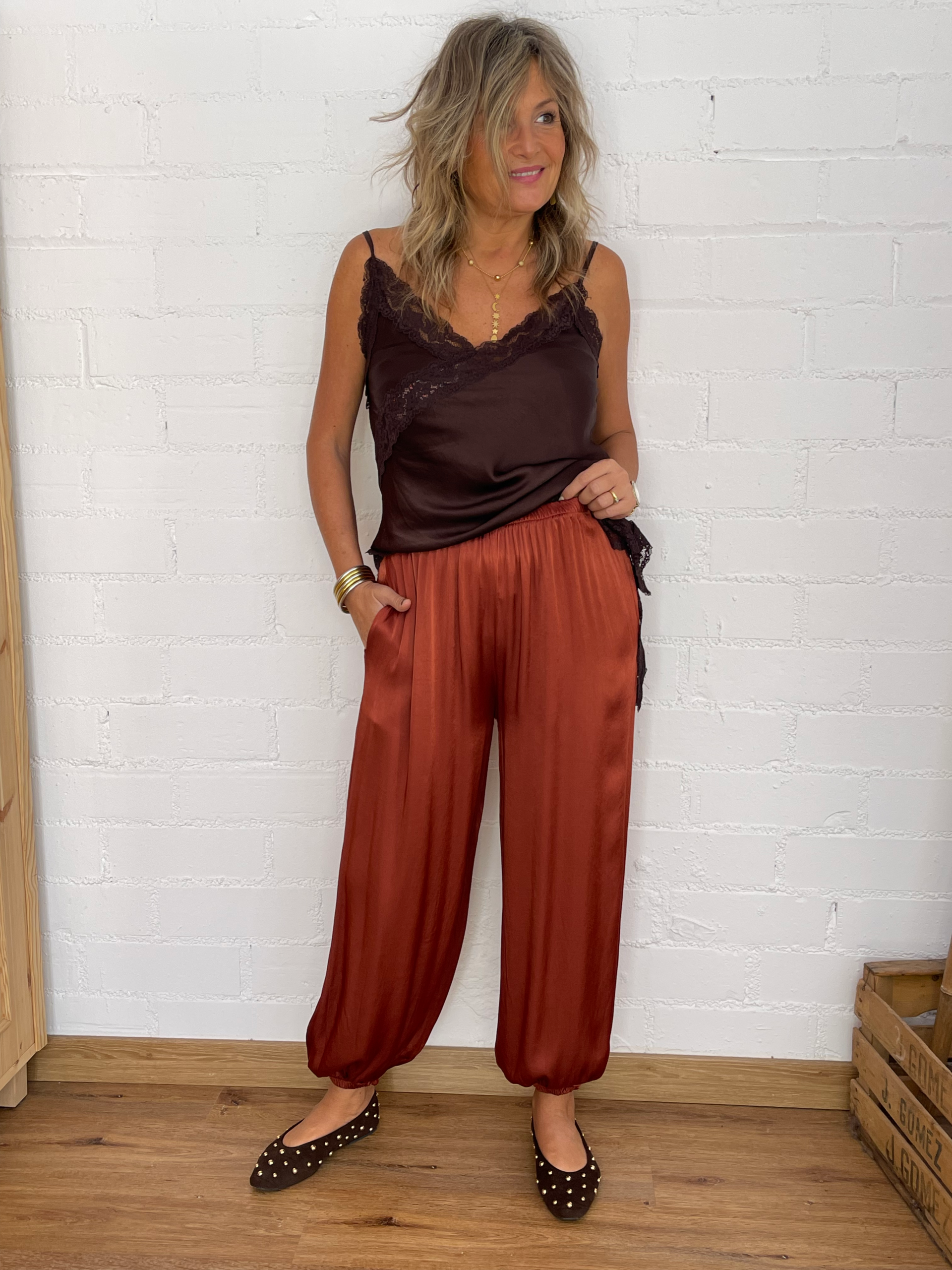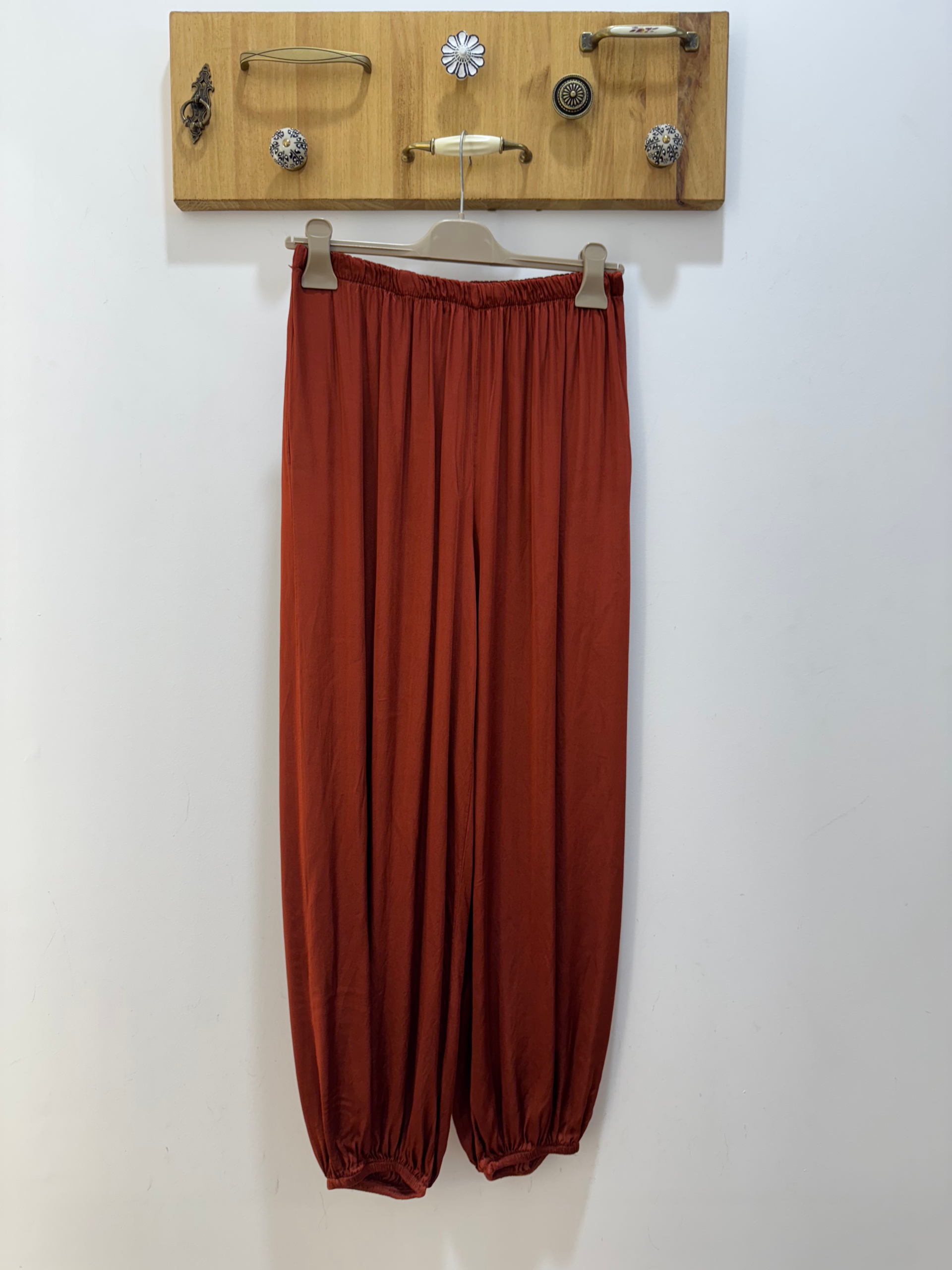 Sofisticado y con un aire relajado, este pantalón bombacho de viscosa es la combinación perfecta entre comodidad y estilo. Su tejido de raso aporta un acabado suave y ligeramente satinado que eleva cualquier look con un toque de elegancia discreta.