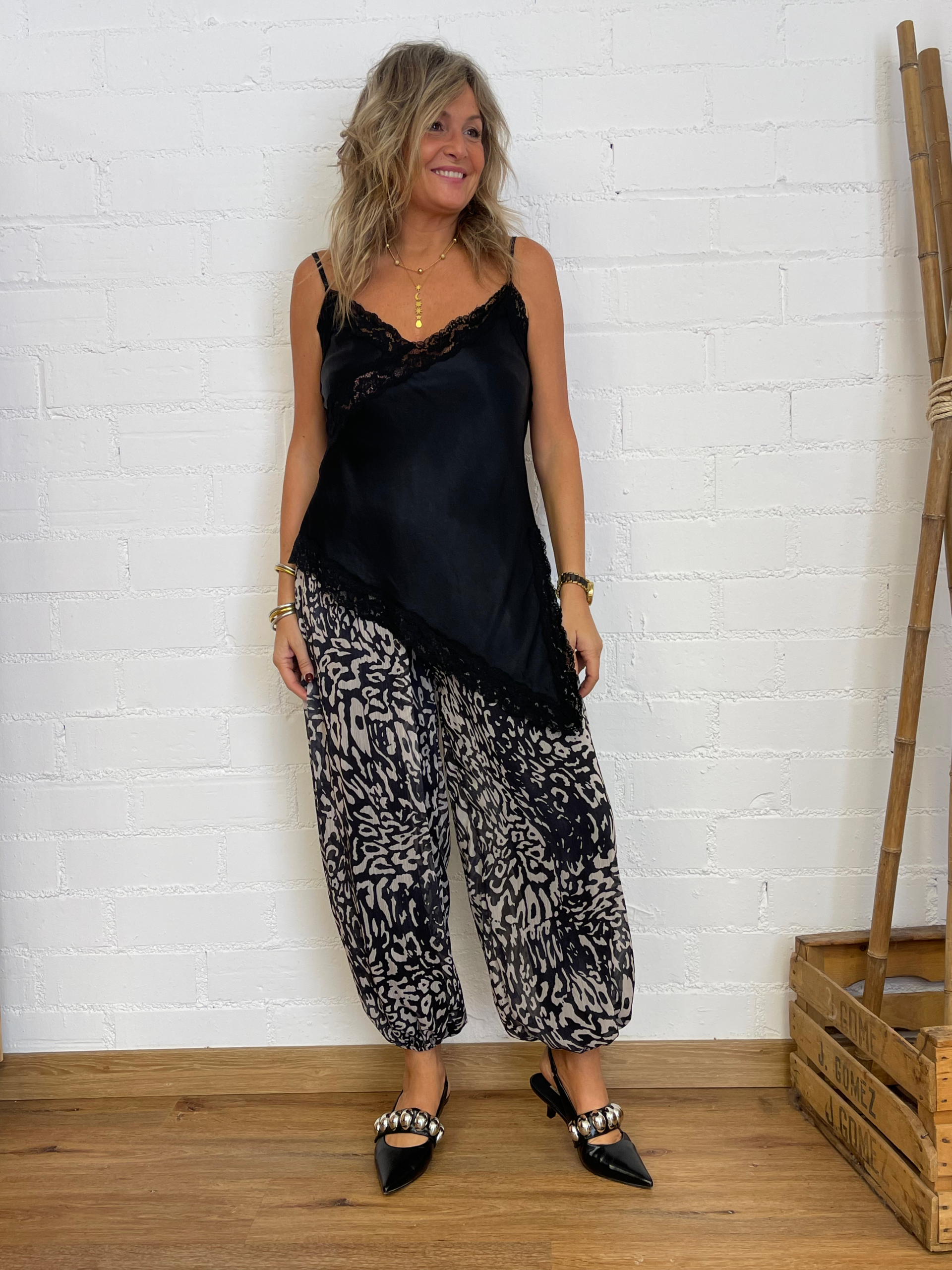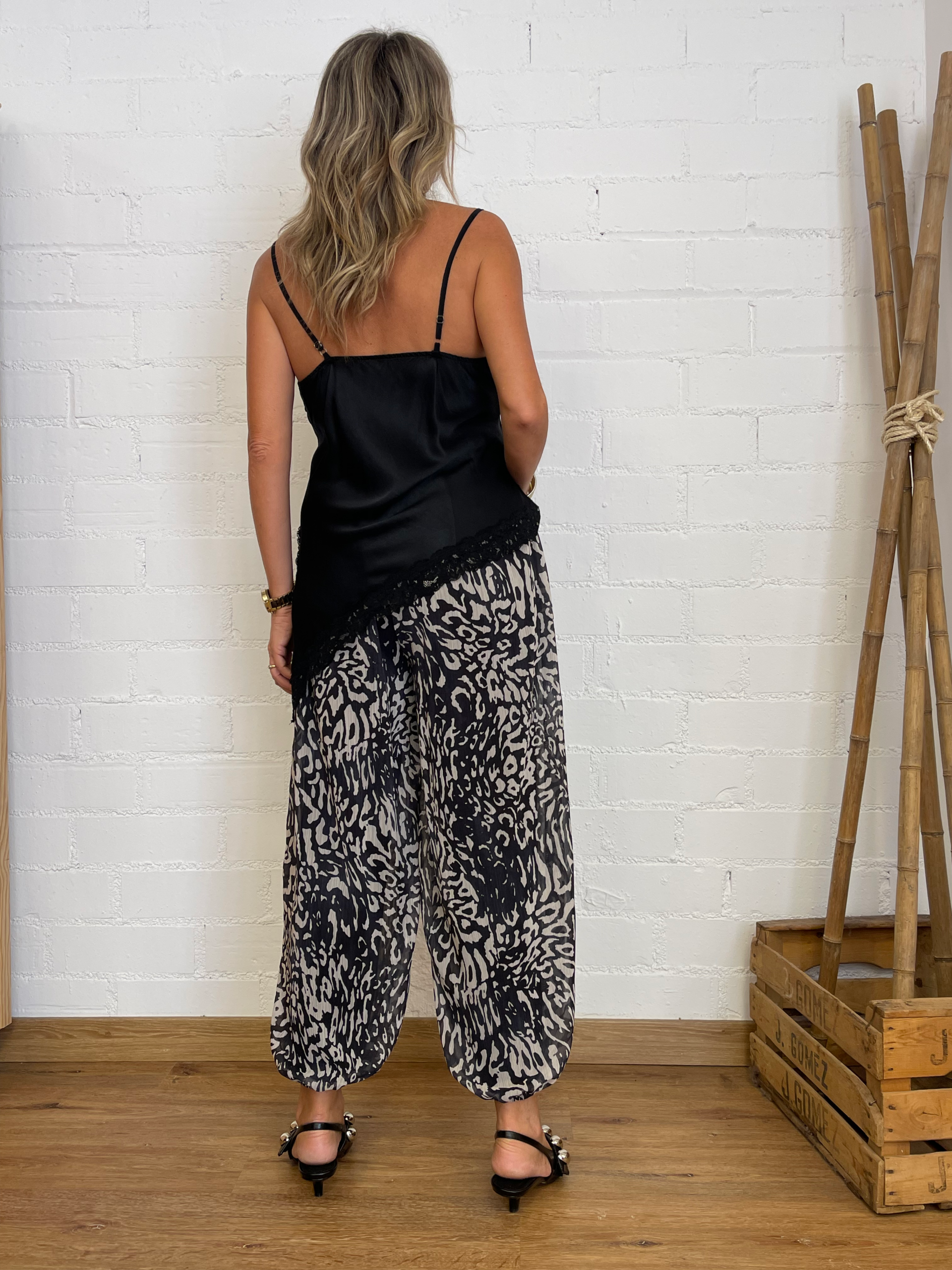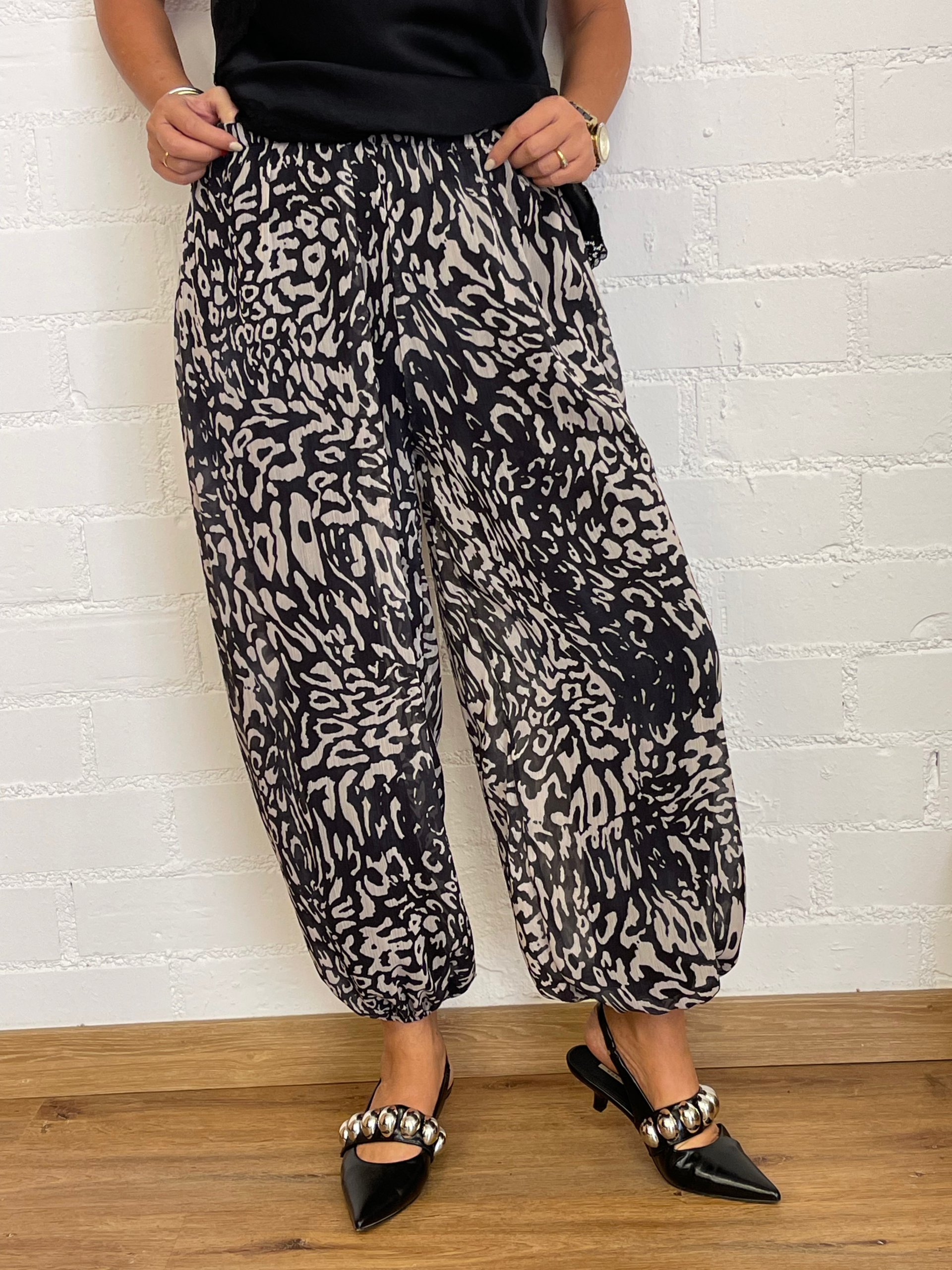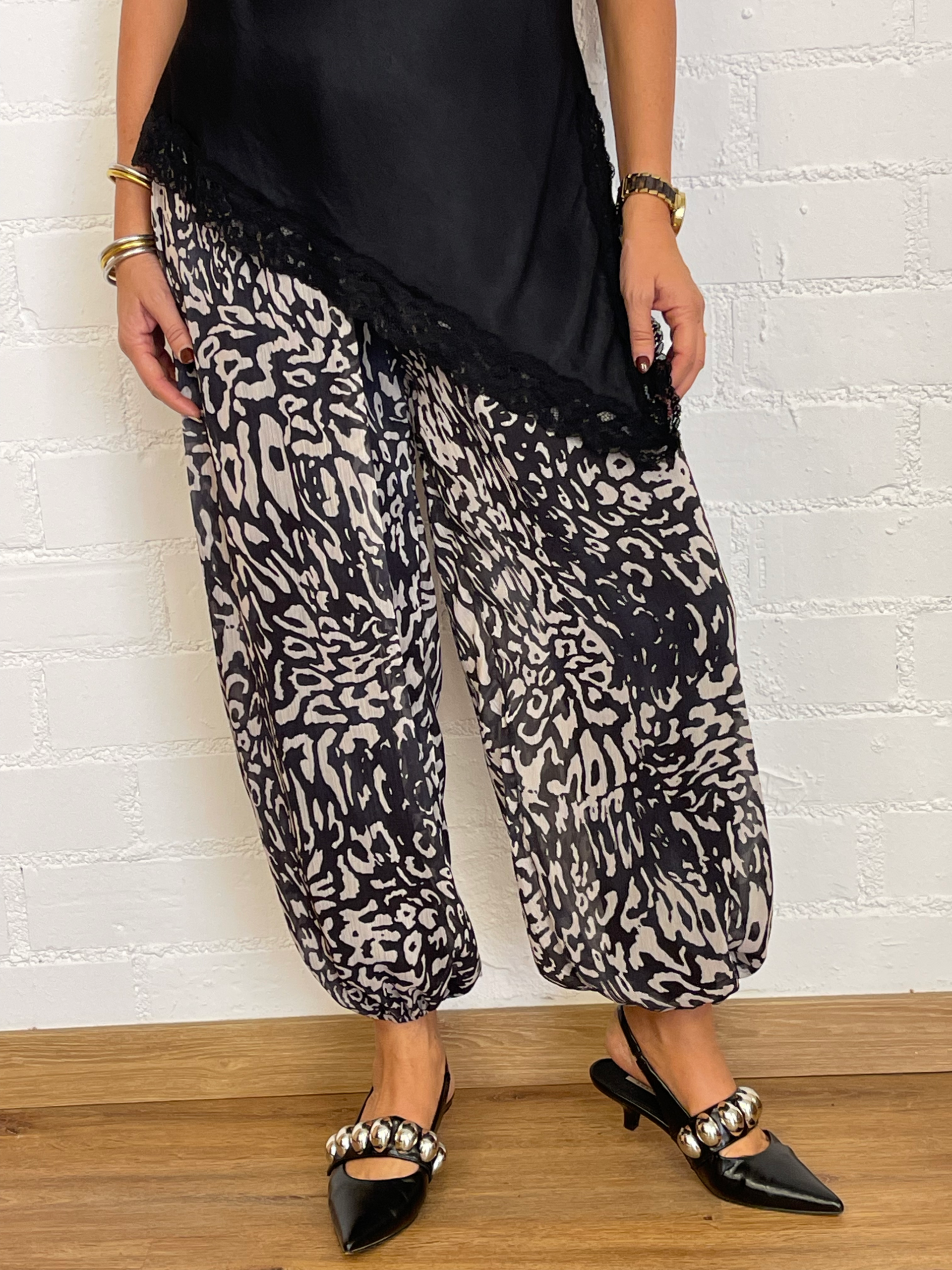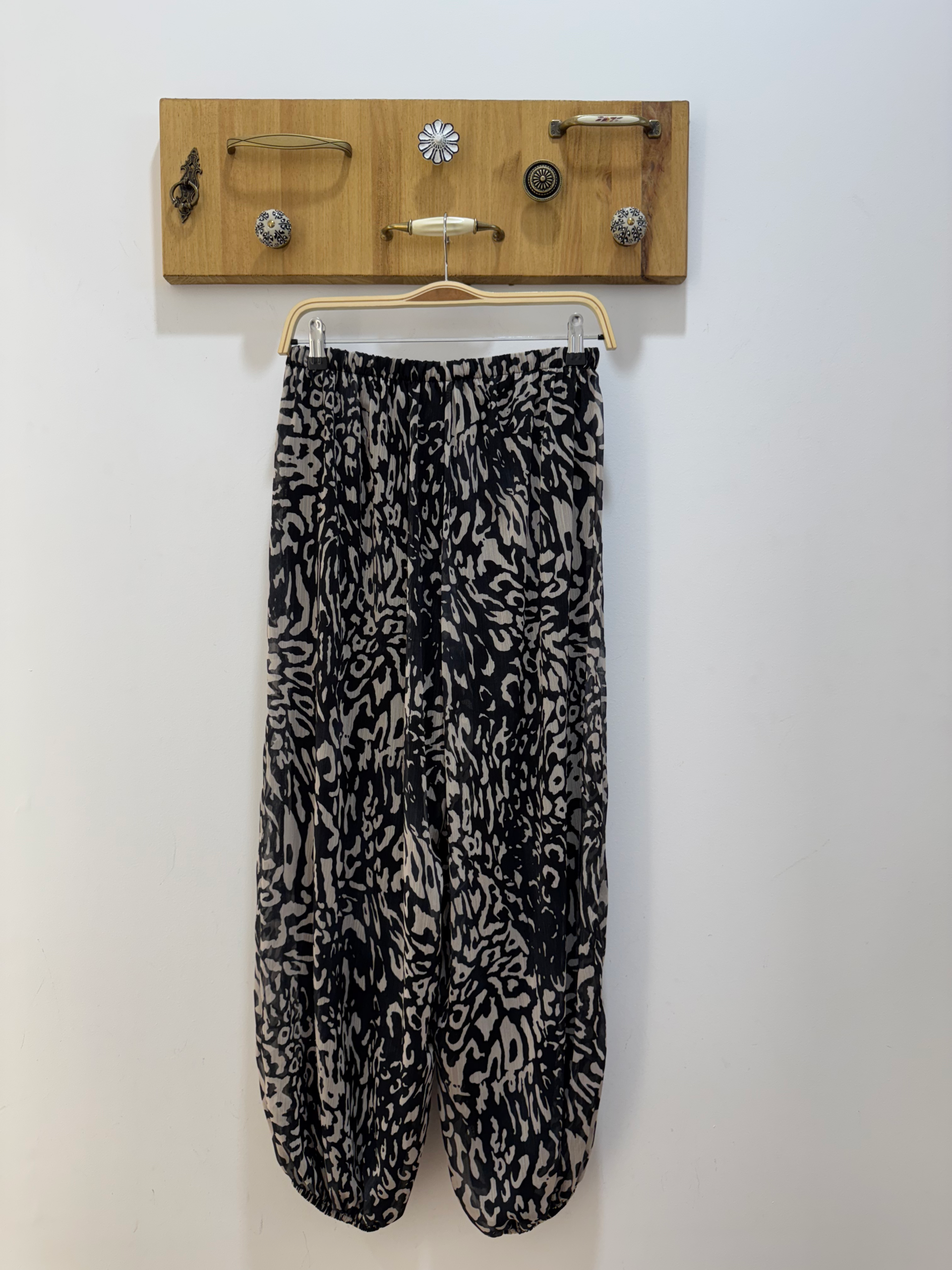Aporta un toque exótico y elegante a tu look con este pantalón bombacho de animal print. Confeccionado en una ligera tela de gasa con forro interior, combina estilo y comodidad, ofreciendo una caída fluida y un movimiento natural en cada paso.