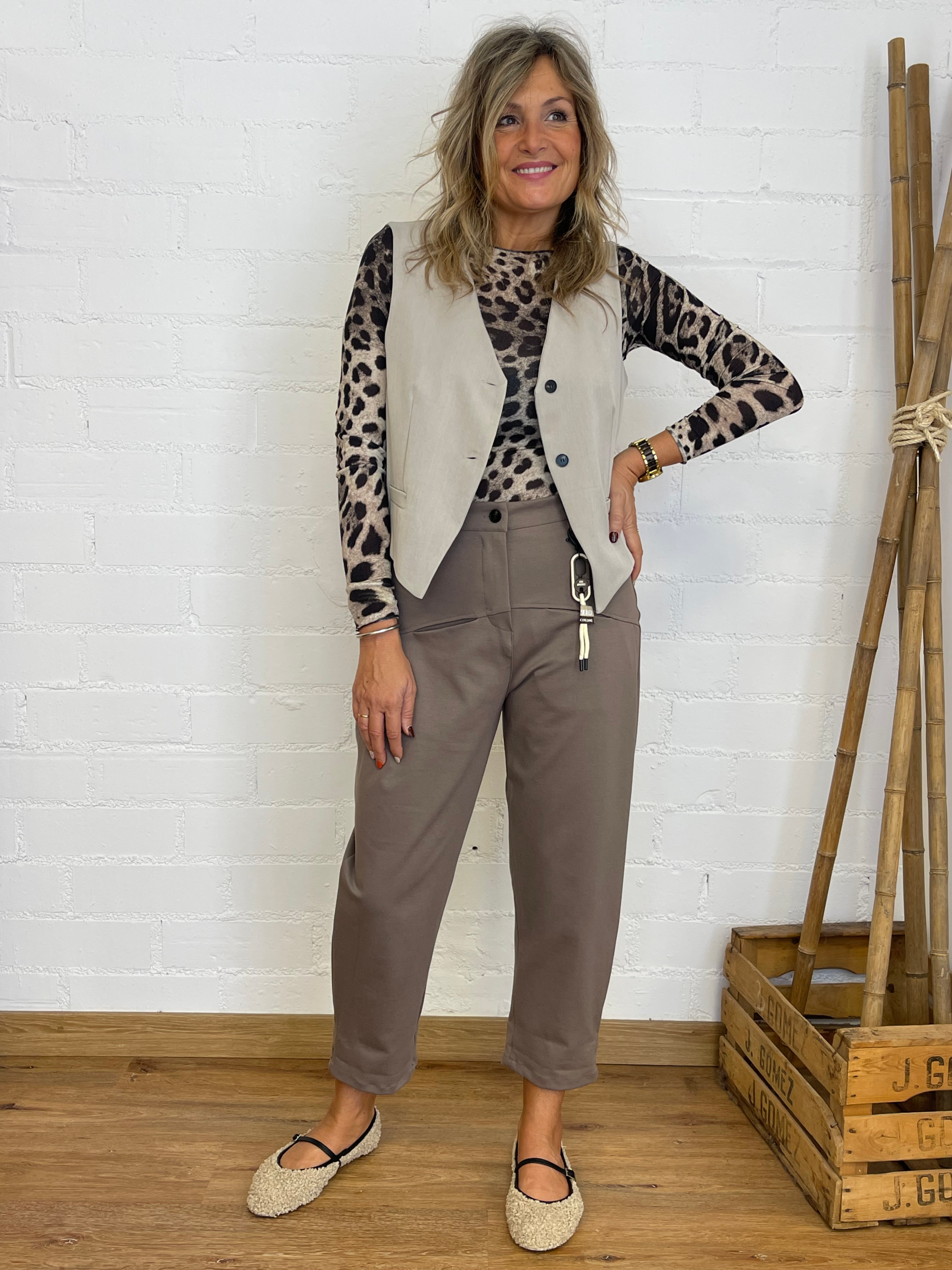 El diseño se completa con un llavero decorativo que añade un toque actual y sofisticado, junto con un cierre con cremallera y botón que asegura un acabado clásico y pulido. Ideal para combinar con blusas, camisetas o chaquetas, este pantalón se convertirá en un básico versátil para cualquier ocasión.