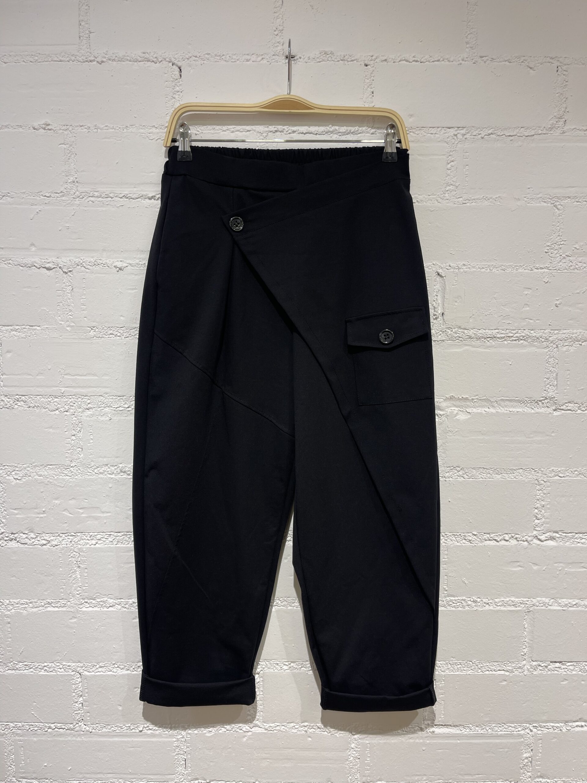 Pantalón de corte cómodo y actual, confeccionado en un tejido estructurado pero flexible, ideal para el día a día sin renunciar al estilo. Su diseño destaca por la parte delantera tipo pareo, con cierre decorativo de botón, que aporta un aire original y diferente.