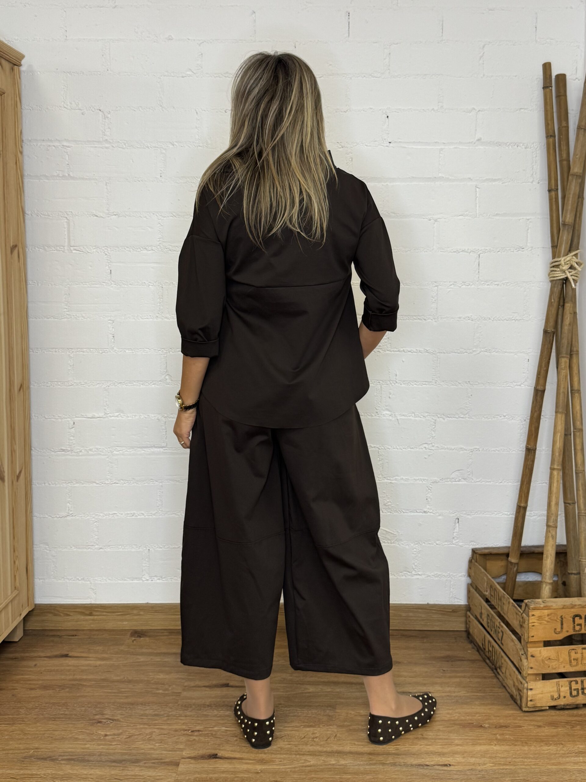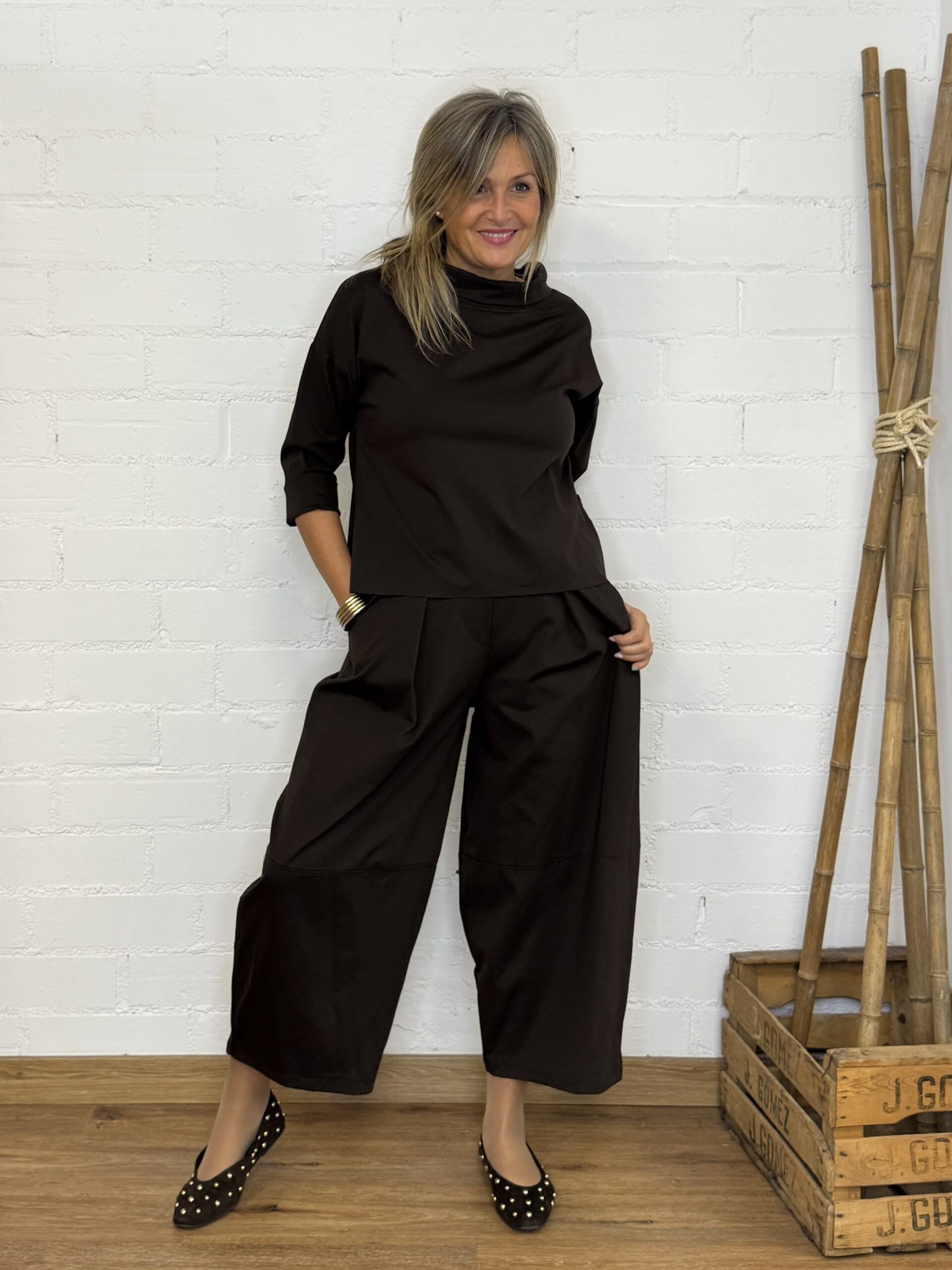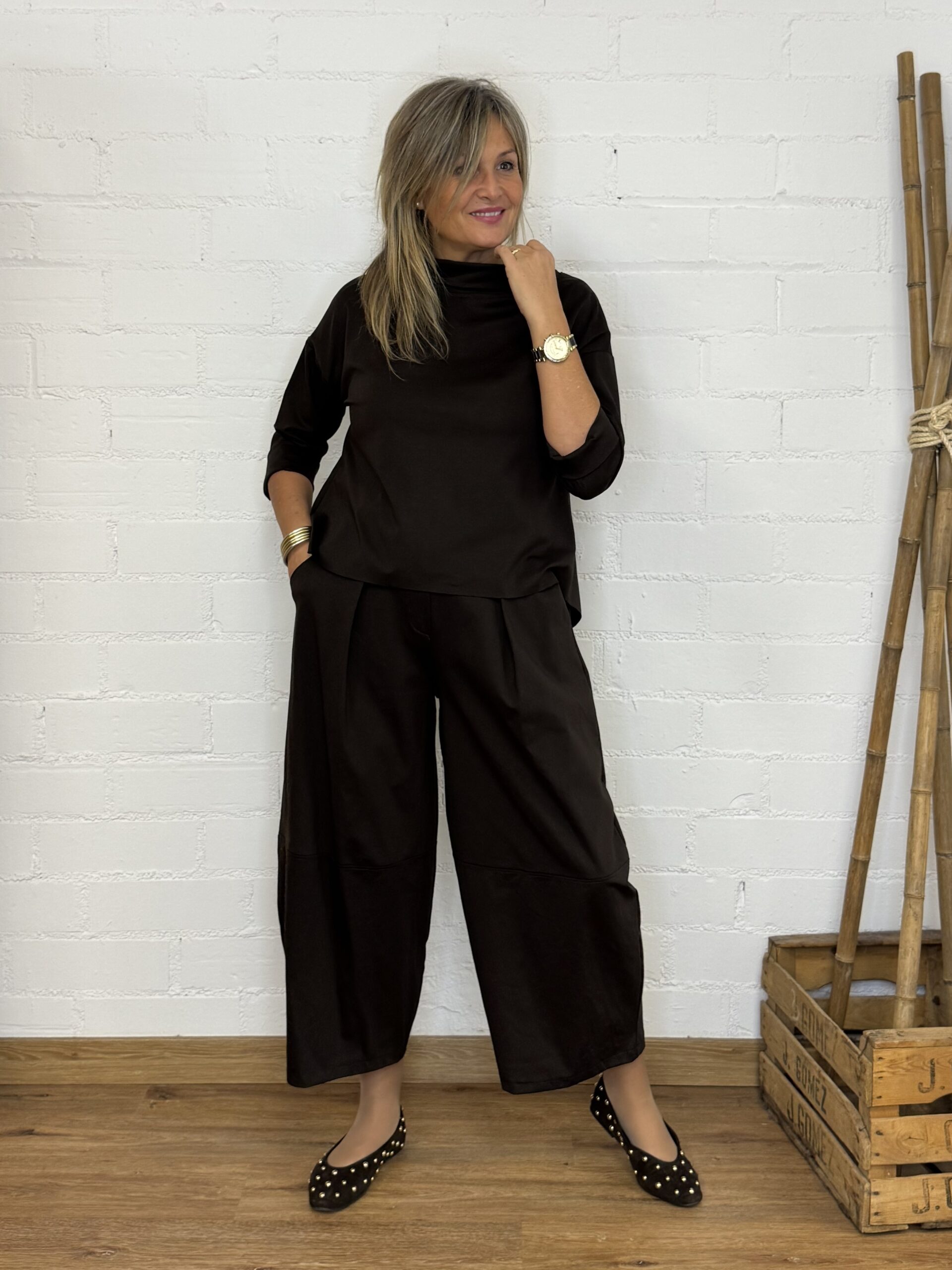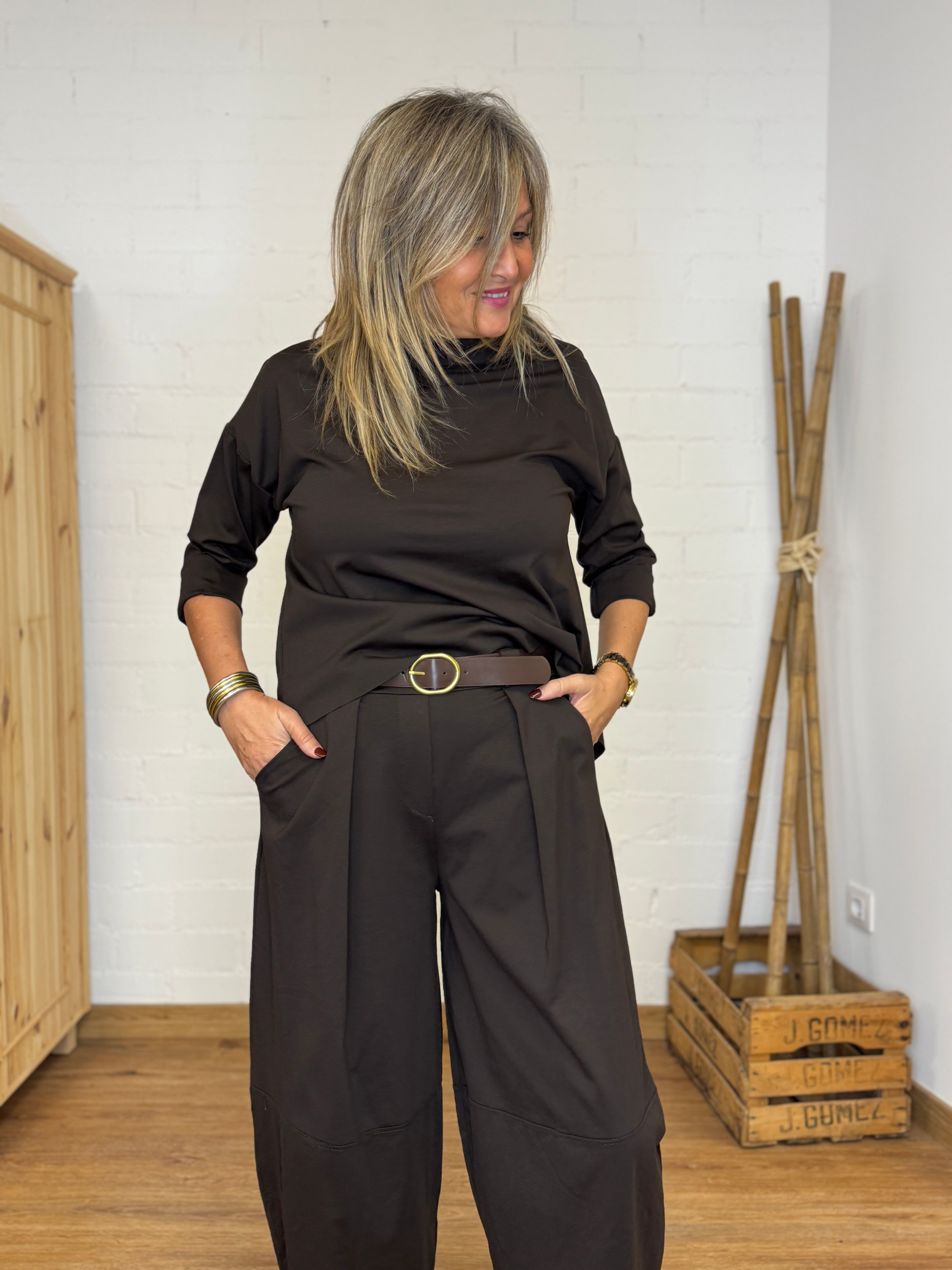 Este pantalón de punto milano destaca por su corte bombacho y su diseño cómodo y con estilo. Presenta una cintura elástica en la parte trasera que se adapta a la figura sin renunciar al confort, y trabillas con cinturón incluido para un toque extra de estilo.
