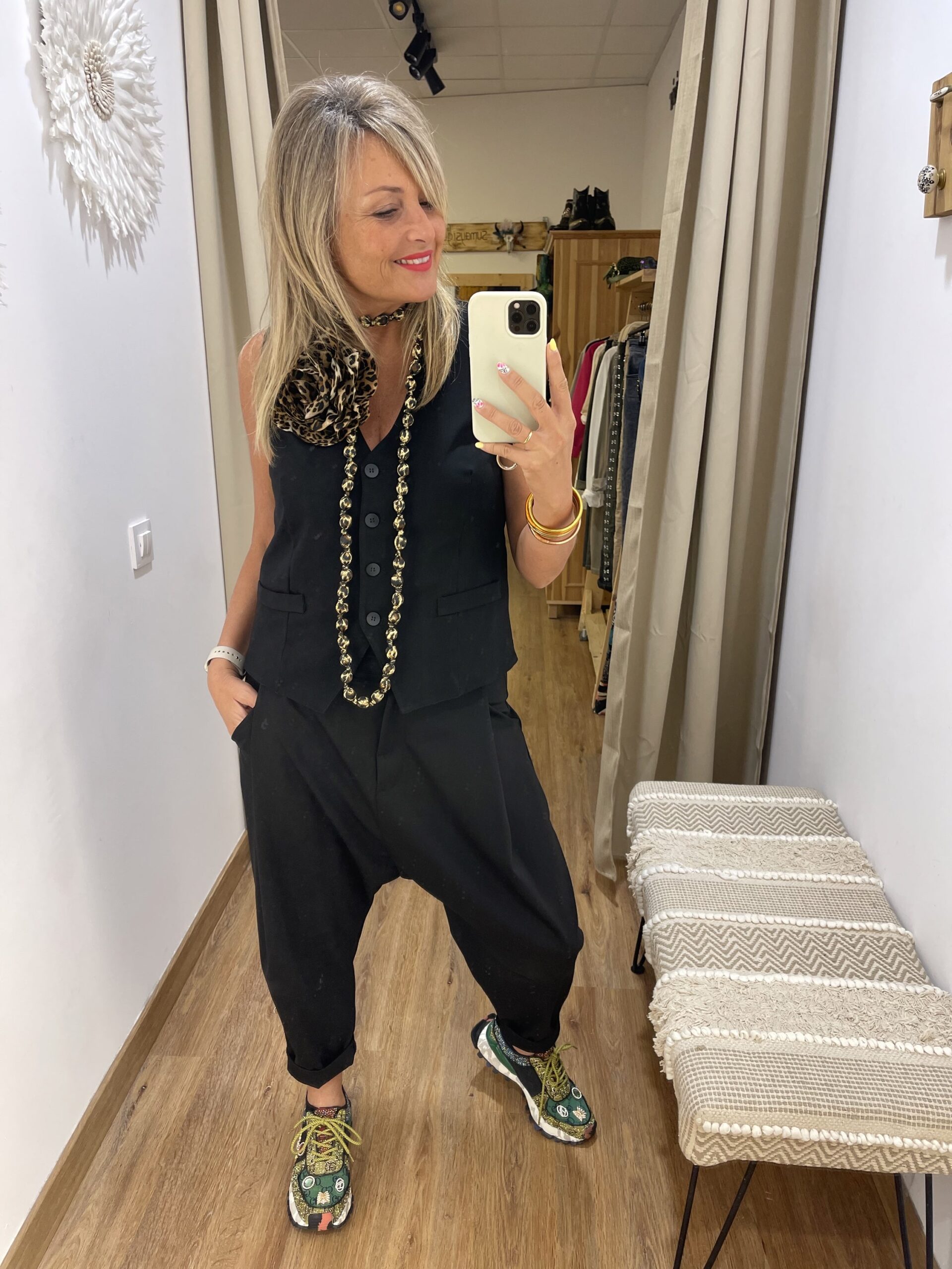 Pantalón estilo baggy para mujer, confeccionado en un tejido fino tipo traje que aporta una caída elegante y ligera. Su diseño combina comodidad y estilo gracias a la cintura elástica que se adapta perfectamente a la silueta, junto con trabillas para cinturón que permiten personalizar el look. Incluye bolsillos laterales funcionales, ideales para un toque casual y práctico, y un cierre frontal de botón y cremallera que mantiene la estética clásica del pantalón sastrero. El corte baggy añade un aire moderno y relajado, perfecto para crear conjuntos versátiles tanto para el día a día como para ocasiones más especiales. Elegante, cómodo y actual: un imprescindible en cualquier armario.Talla única.