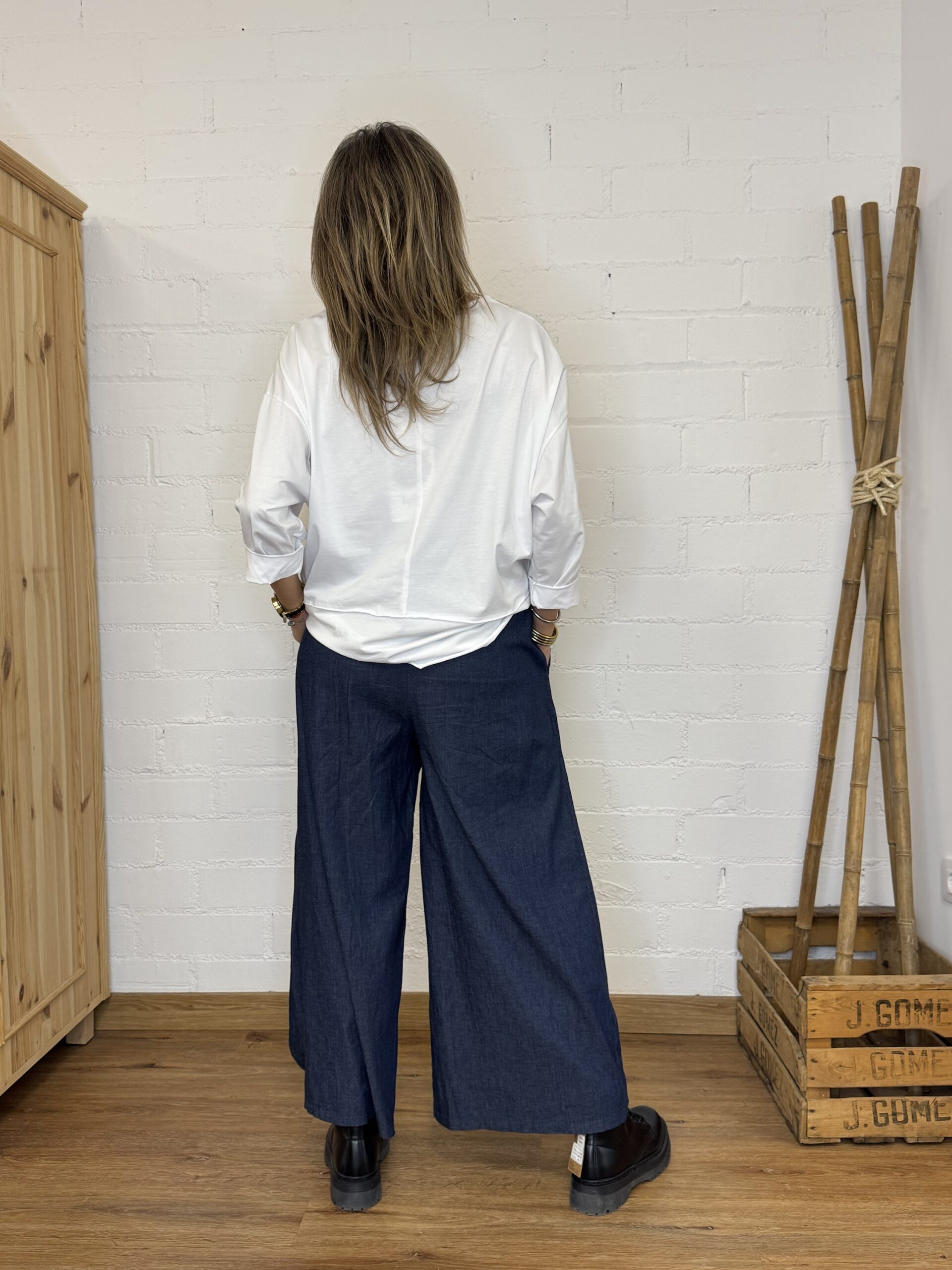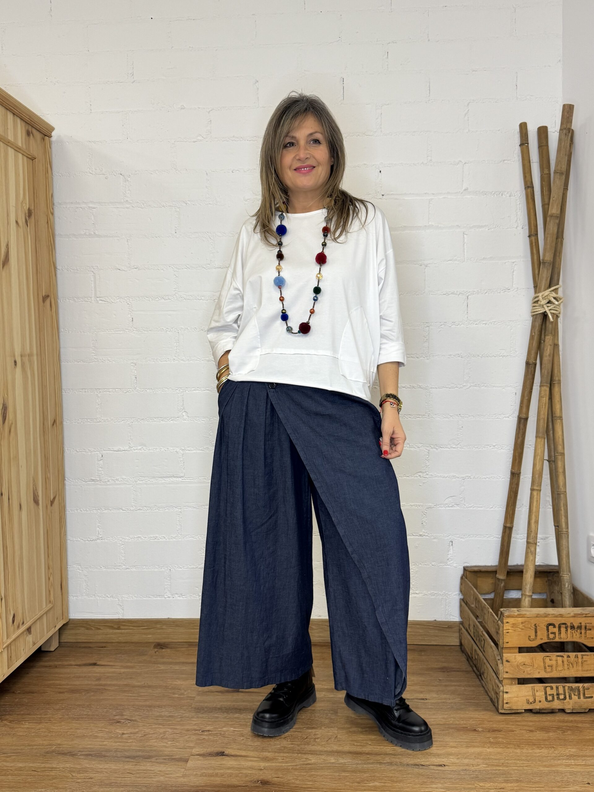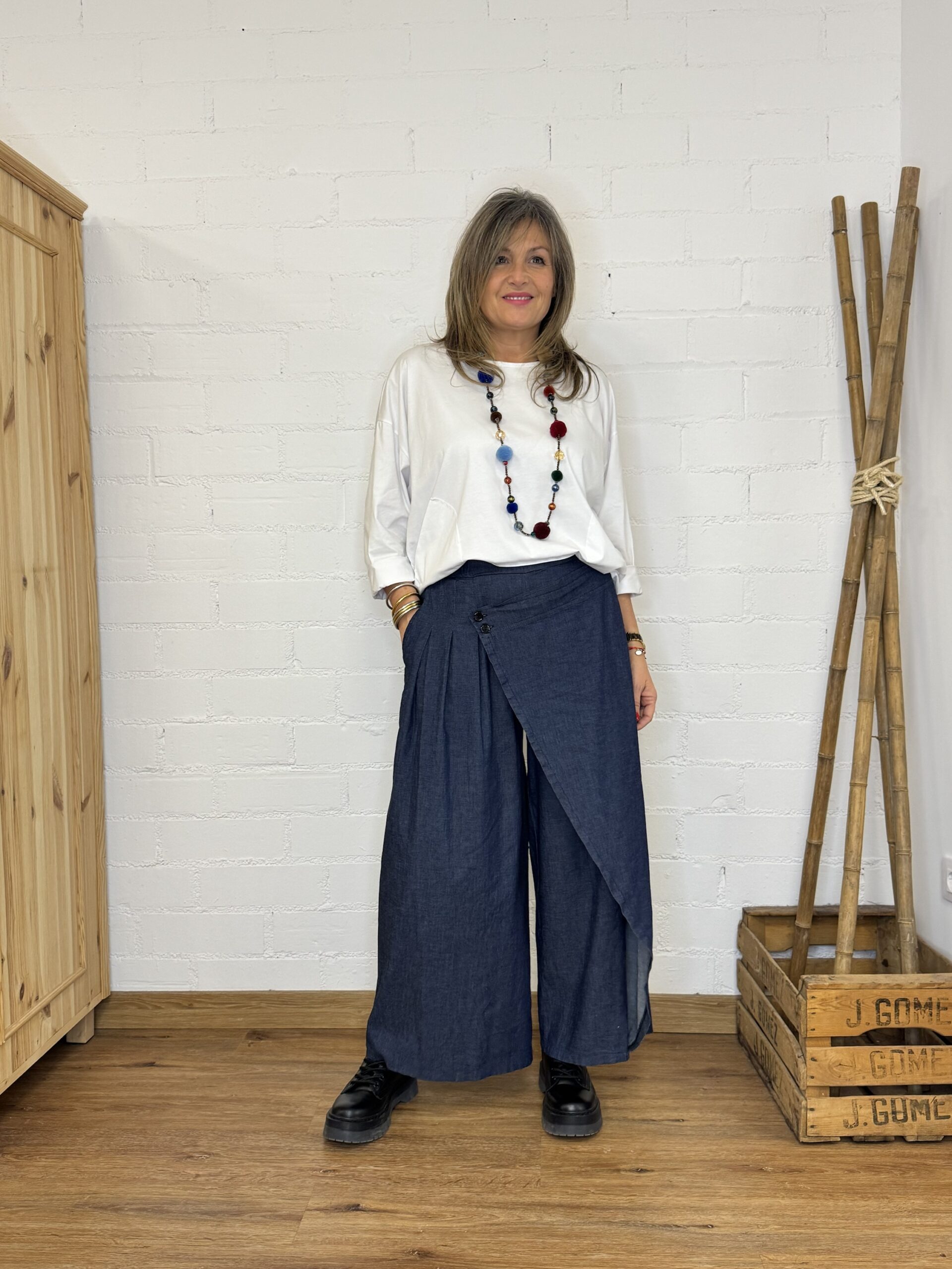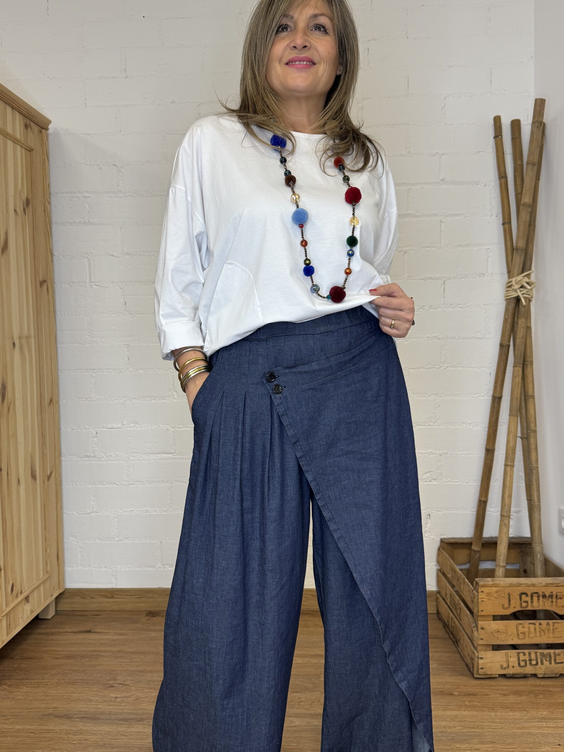 Su corte tipo palazzo aporta un estilo relajado y actual, mientras que la cintura elástica se adapta cómodamente al cuerpo. Destaca por su diseño delantero tipo pareo, con efecto decorativo de agarre mediante botón, que añade un toque original y diferente. Incorpora además bolsillo en la parte derecha, combinando diseño y funcionalidad.