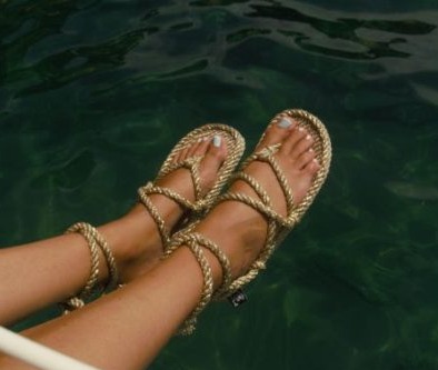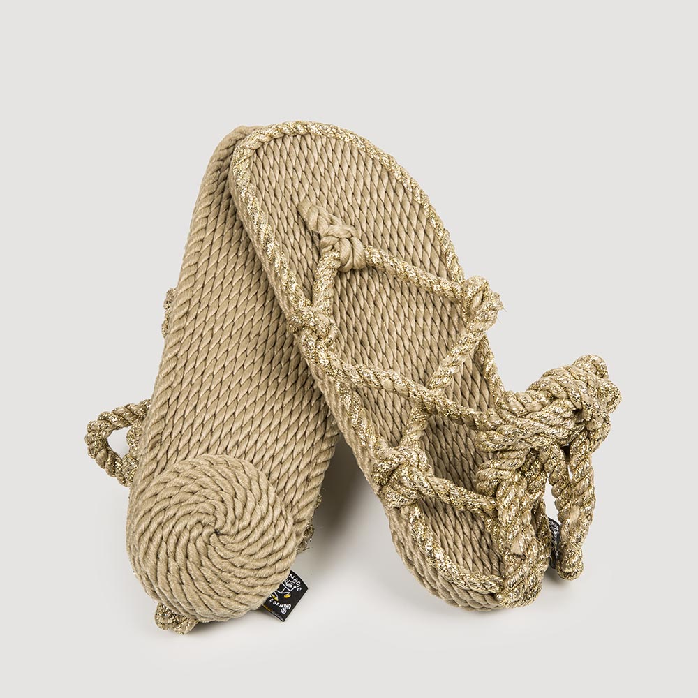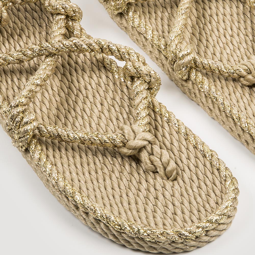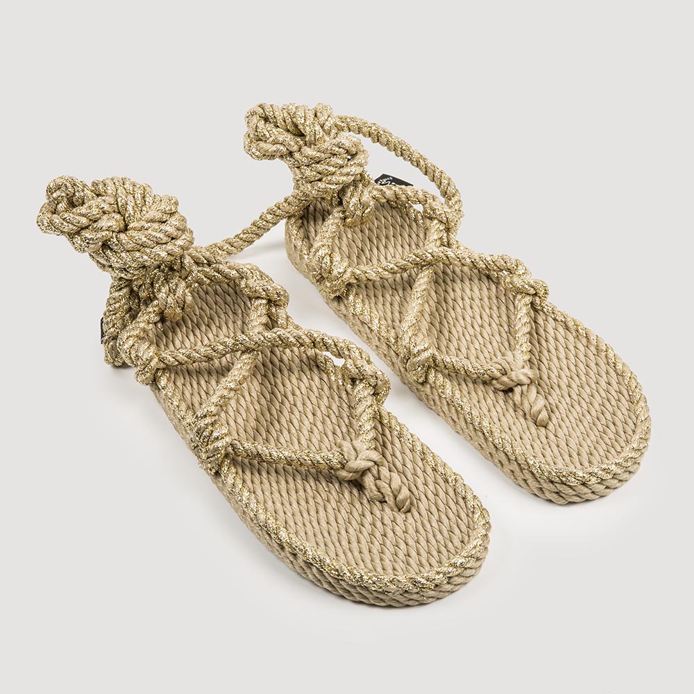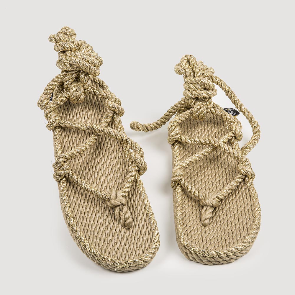 Nuestra sandalia de estilo romano ahora con detalles dorados, con cinco puntos de sujeción, es una de las sandalias que se ajusta mejor al pie. Sus suaves cuerdas pueden ser de diferentes colores y se pueden cambiar fácilmente. No hay normas para atarlas, sigue tu propio estilo. Le hemos añadido una elevación en el talón en una divertida forma circular, para hacerlas aun más femeninas.