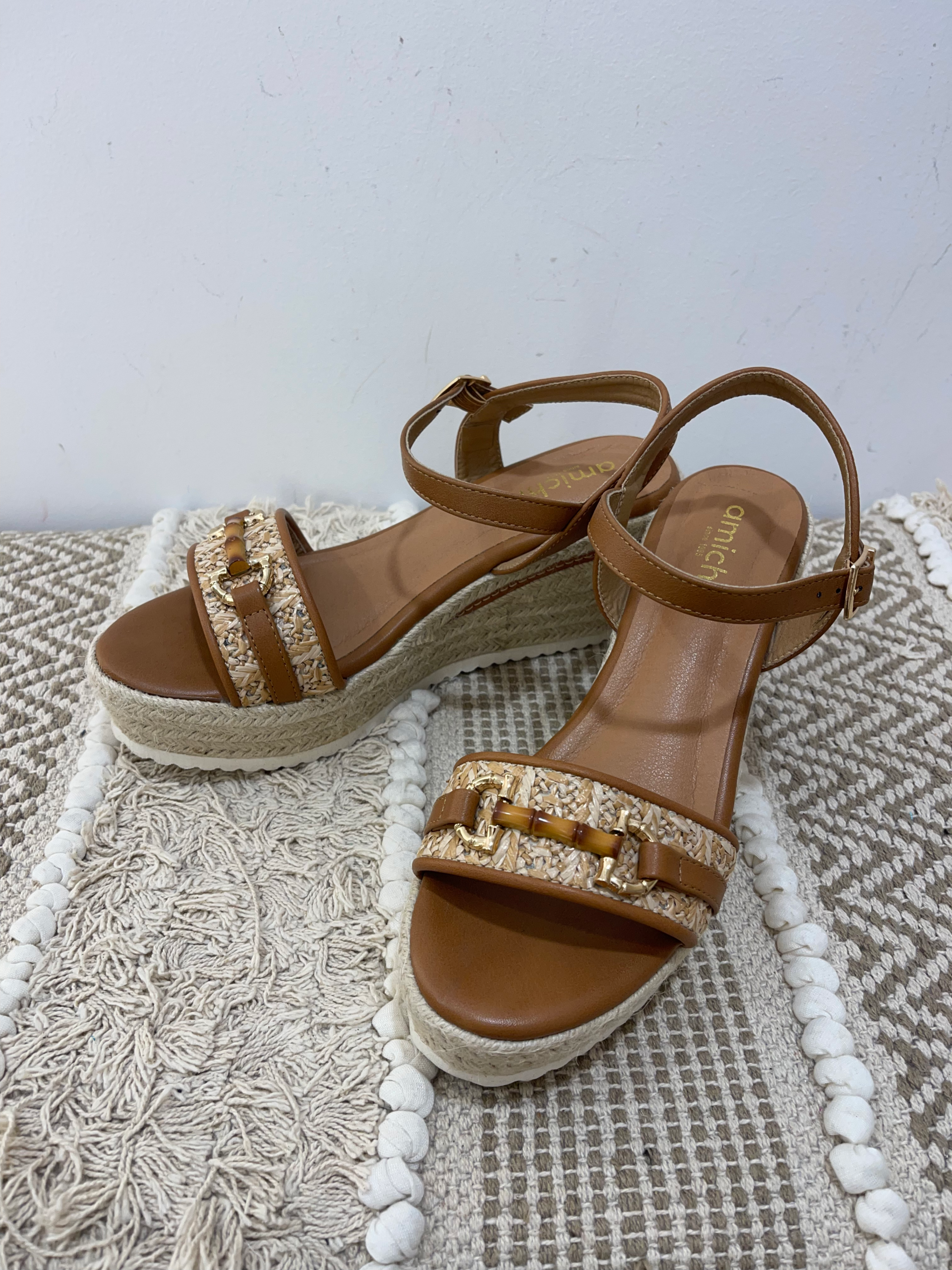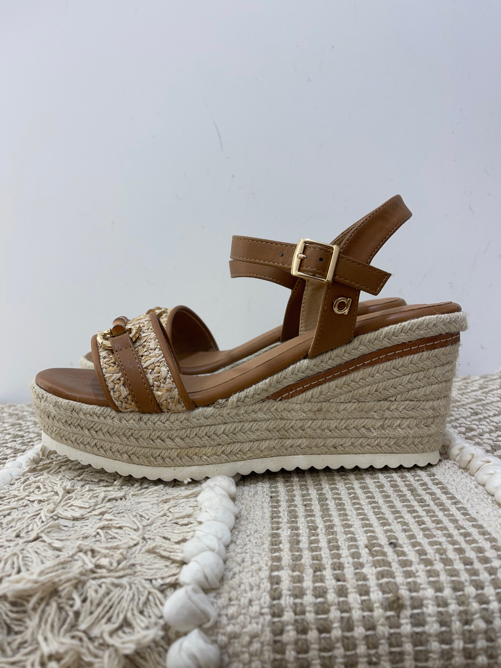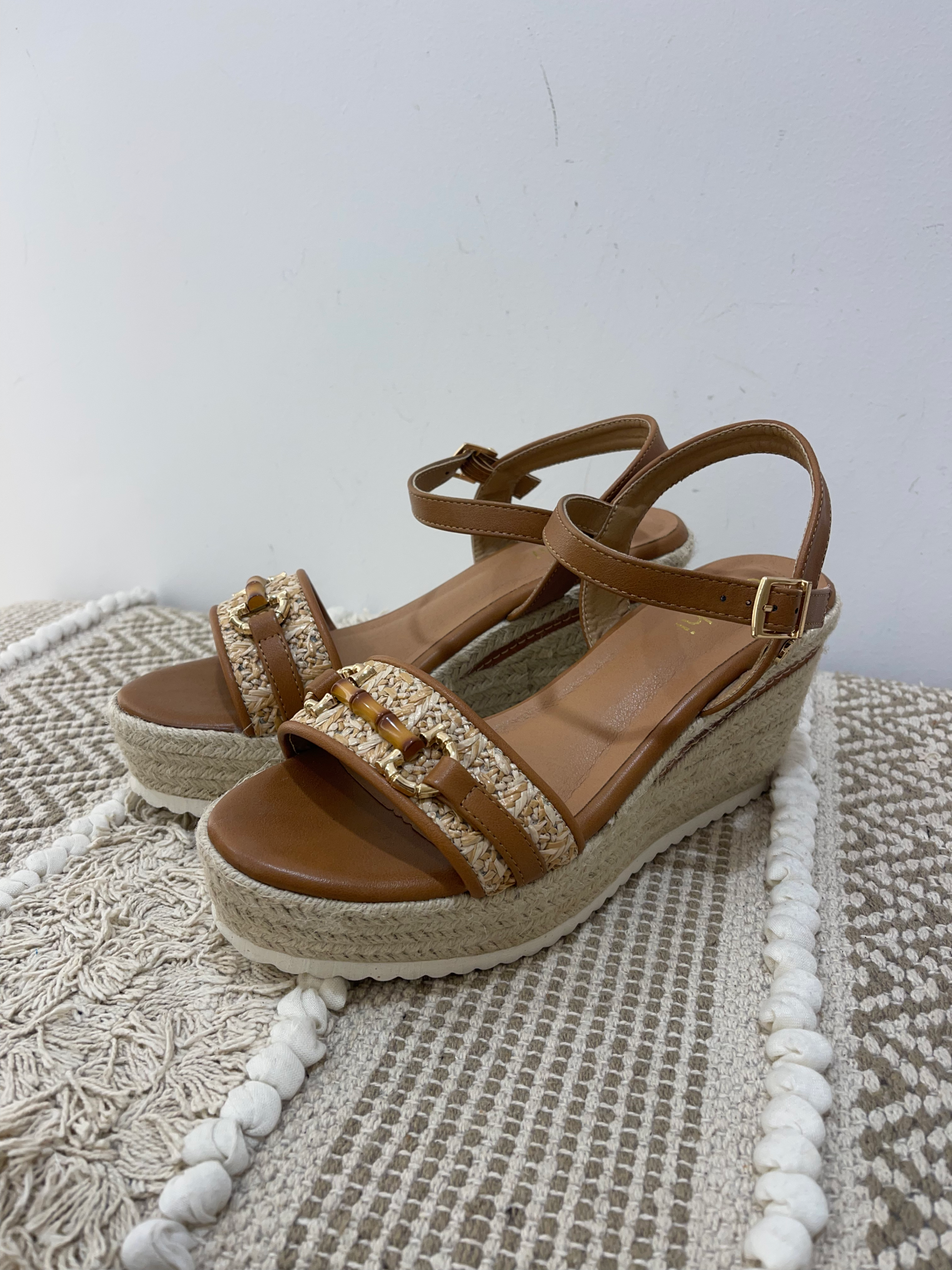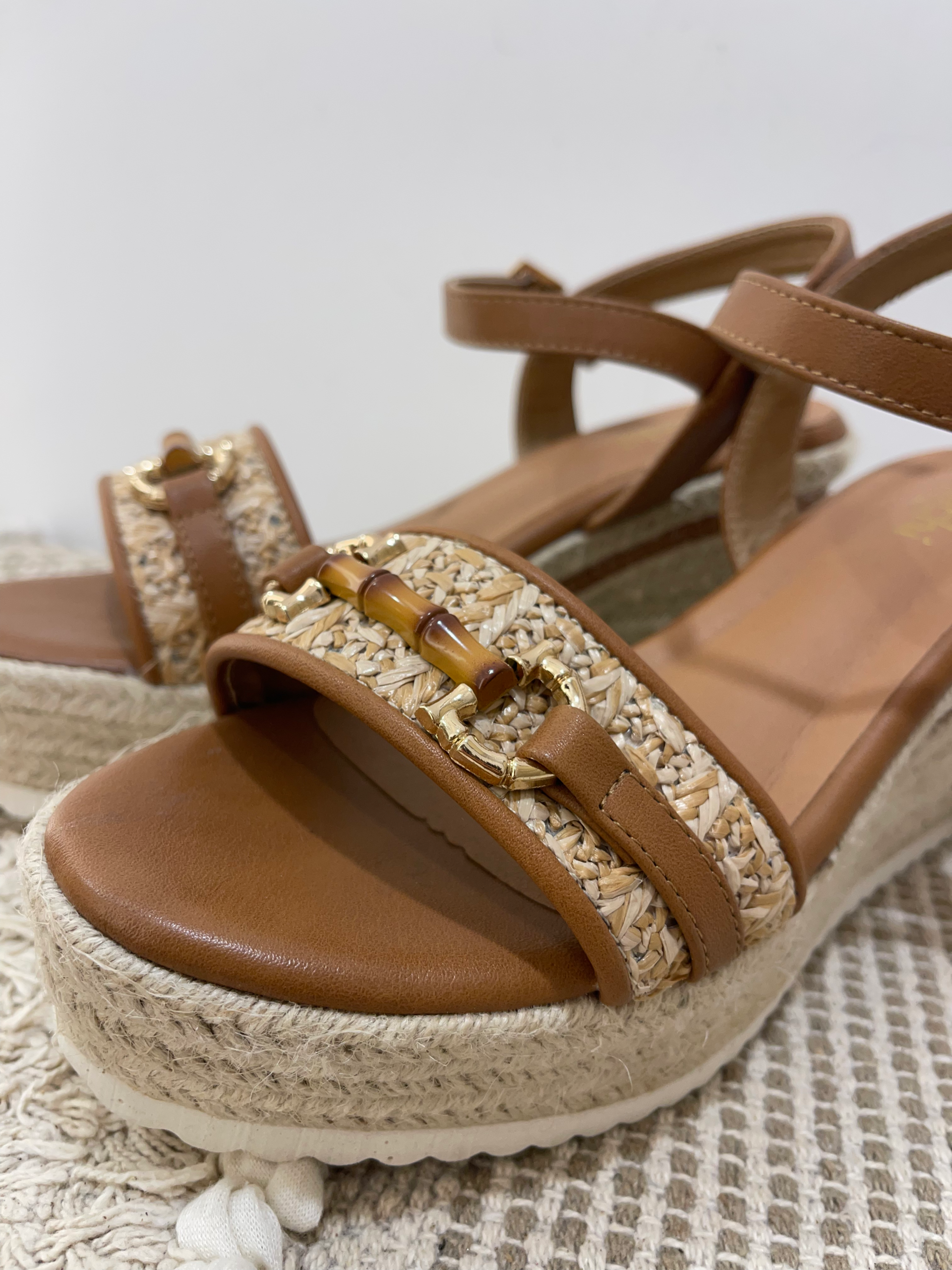Sandalia de cuña de mujer hechas de piel sintética de alta calidad para un ajuste cómodo y duradero. La plantilla acolchada garantiza comodidad durante todo el día, mientras que los detalles de madera y metal le dan un toque bohemio. El tacón de cuña de alpargata completa el look, brindándote estilo y estabilidad para todas tus salidas de temporada.