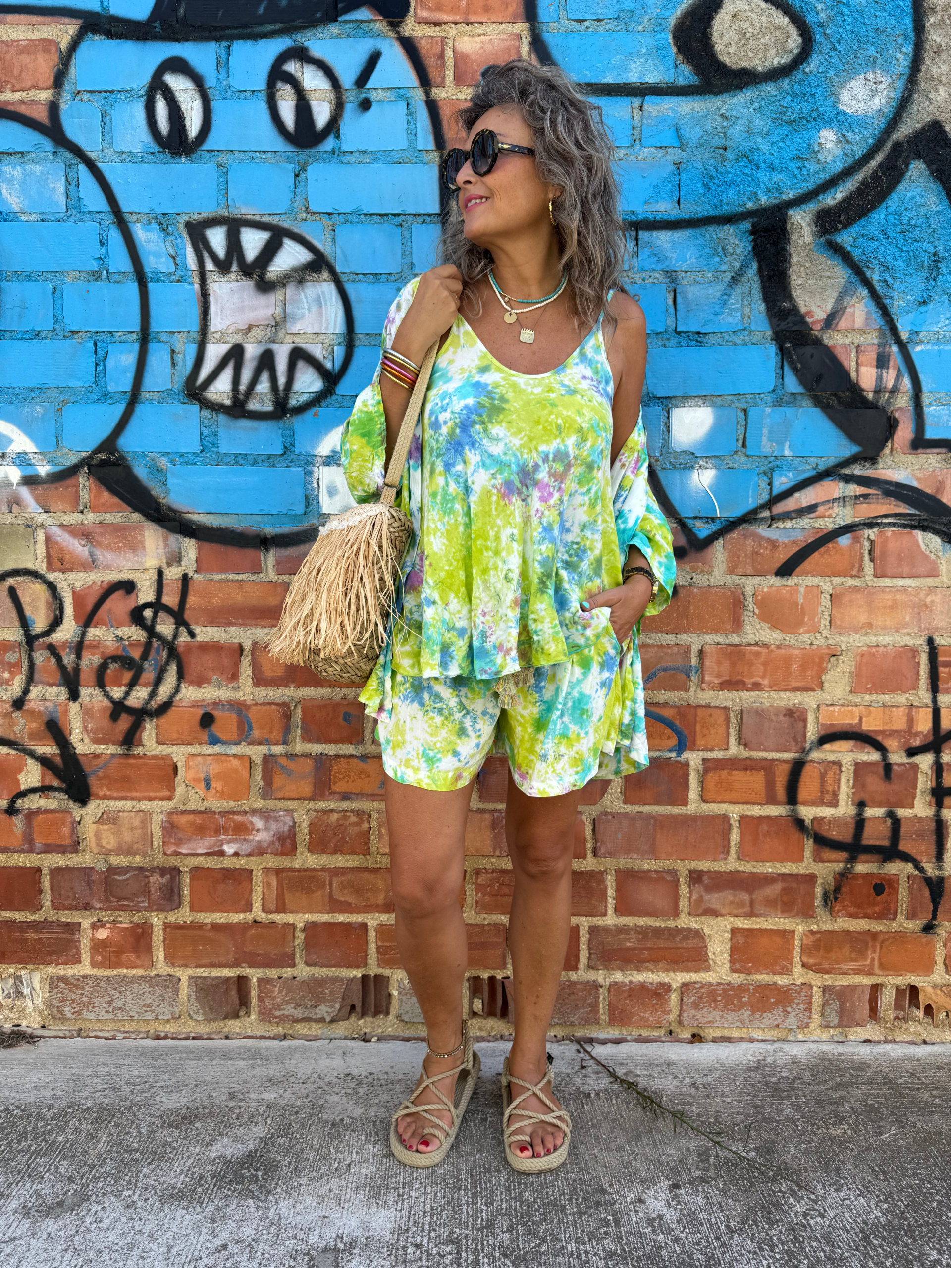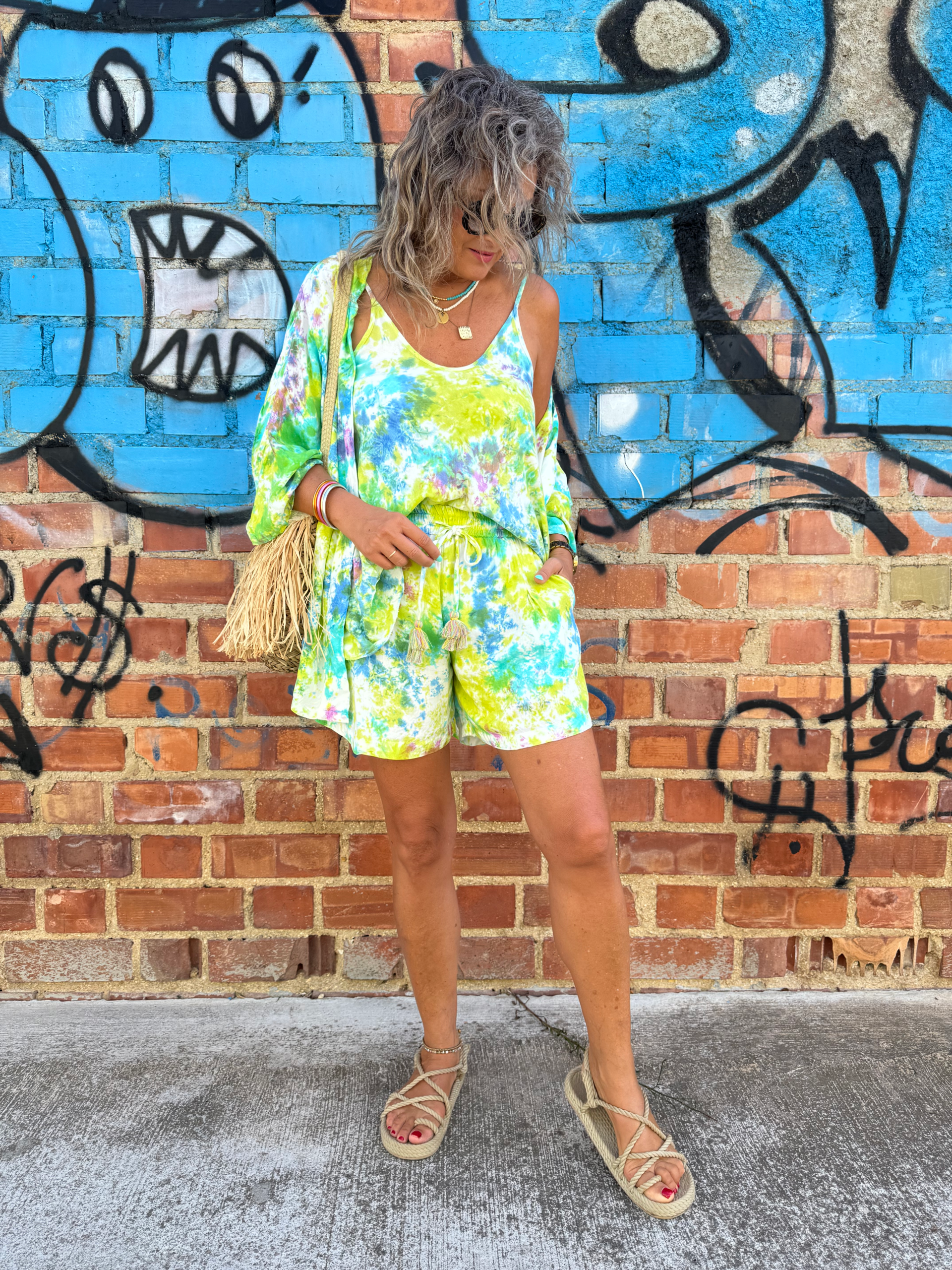 Pantalón estampado tie dye con bolsillos, elástico en la cintura y cordón para ajustar.