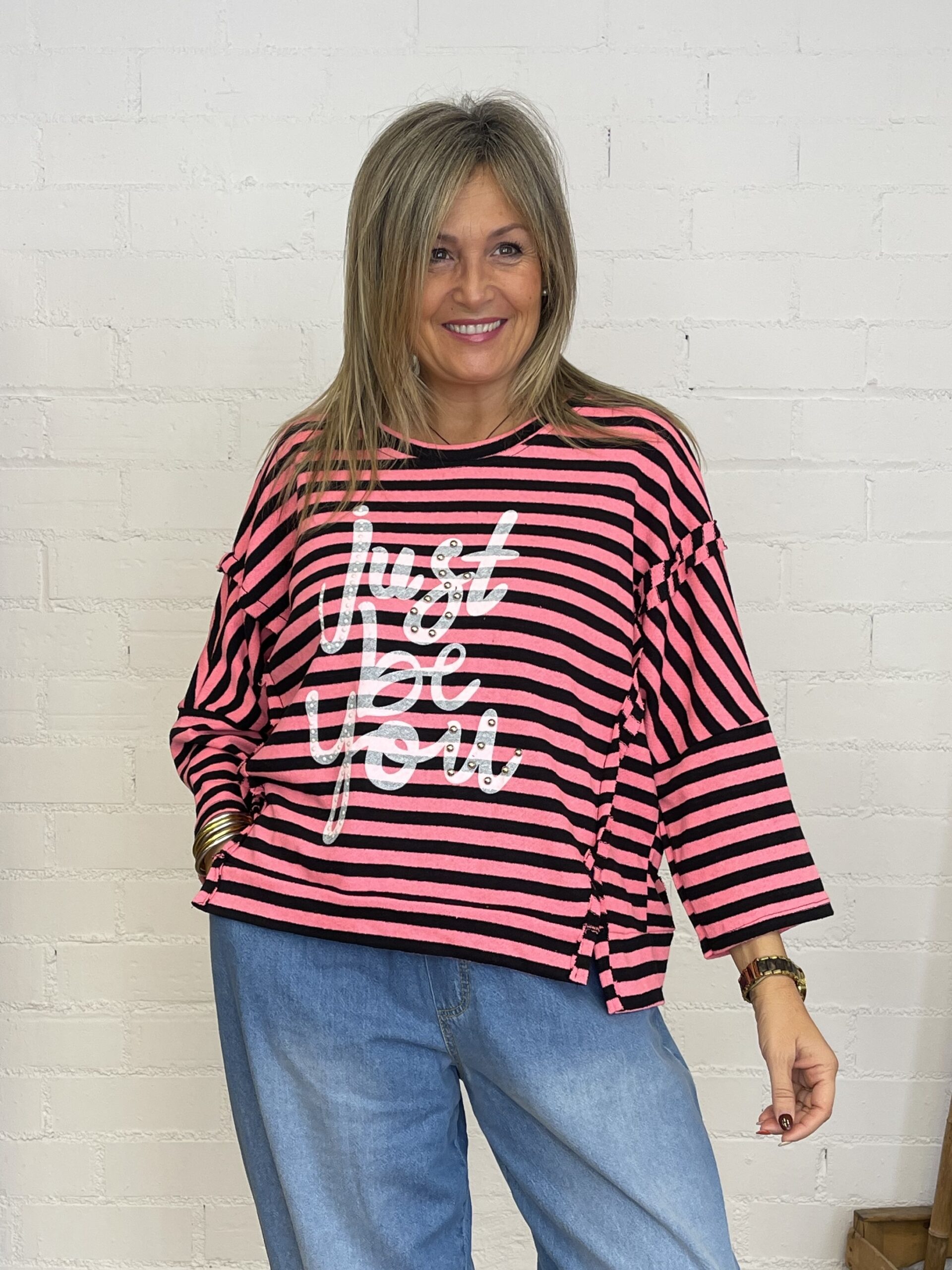 Eleva tus looks casuales con esta sudadera de corte oversize que combina estilo y comodidad en una sola prenda. Su diseño asimétrico y la manga caída aportan un aire desenfadado y moderno, mientras que las rayas y el estampado de letras con aplicaciones de tachuelas añaden un toque urbano lleno de personalidad.