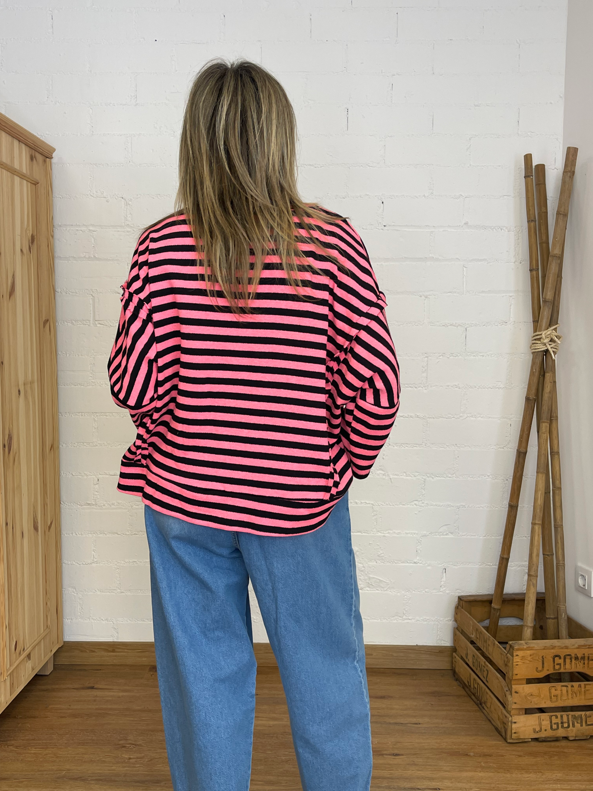 Las costuras vistas le dan un acabado más artesanal y actual, y su cuello redondo la convierte en una pieza versátil para cualquier temporada. Además, cuenta con aberturas en los laterales delanteros, que aportan movimiento y un detalle diferenciador que no pasa desapercibido.