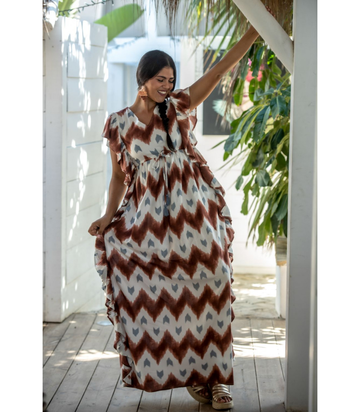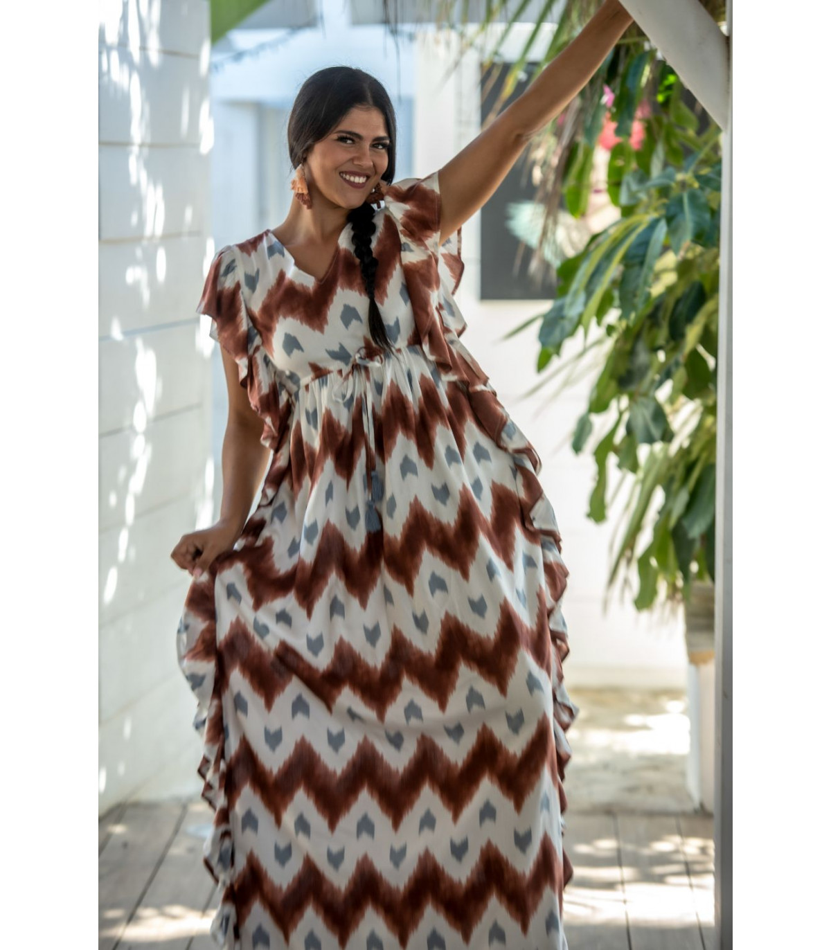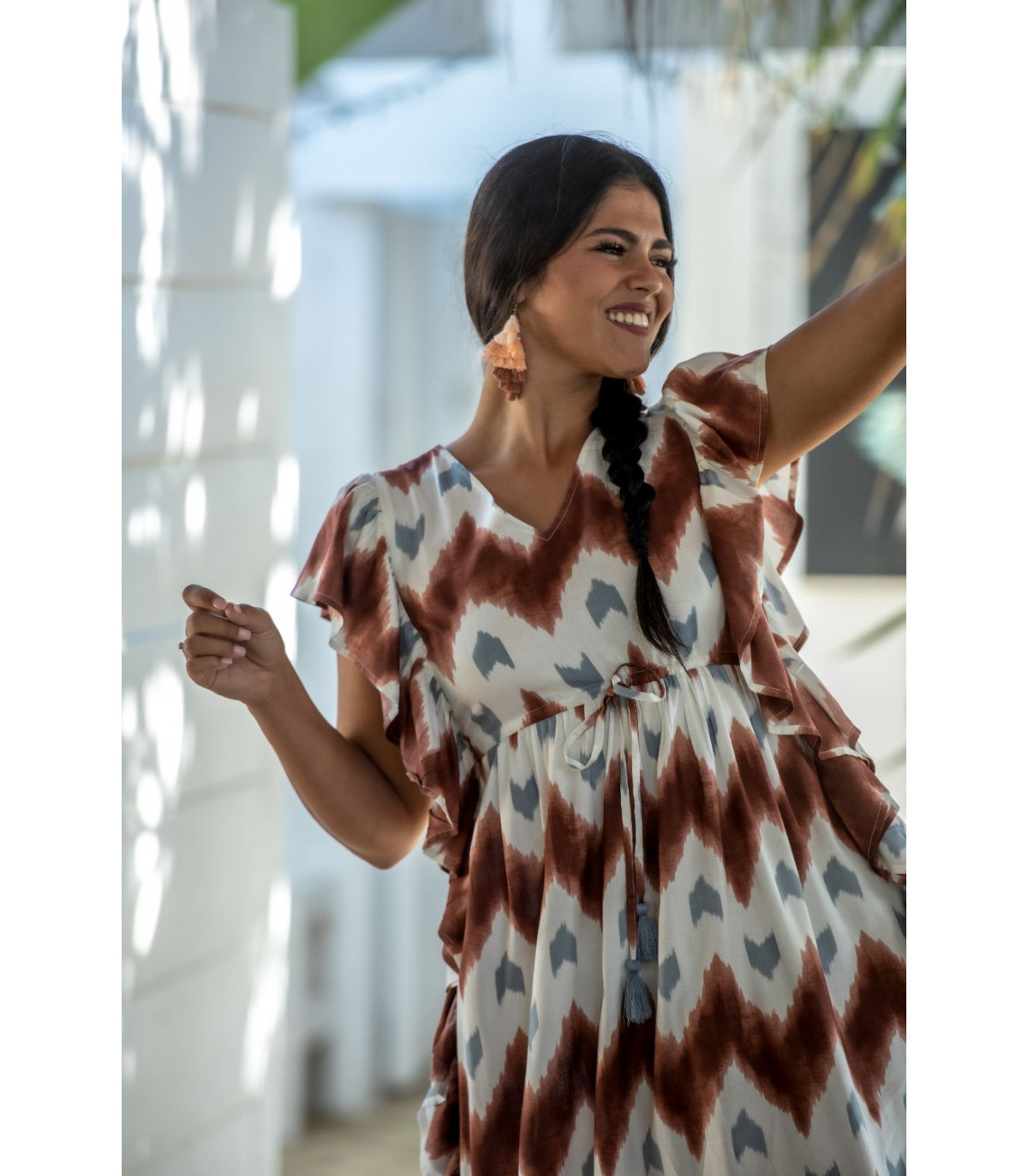 Vestido malta túnica estampado zigzag en tonos cazuela y gris sobre fondo beige con volantes laterales. CALIDAD: 100% VISCOSE