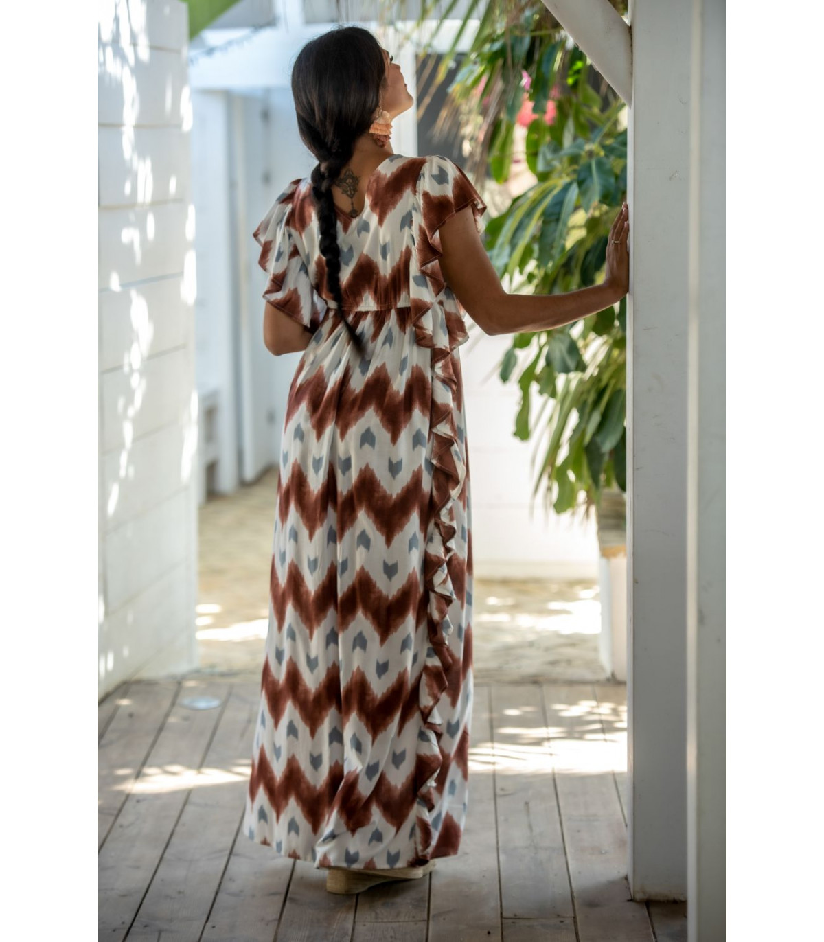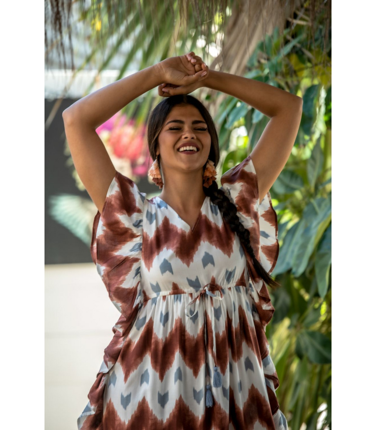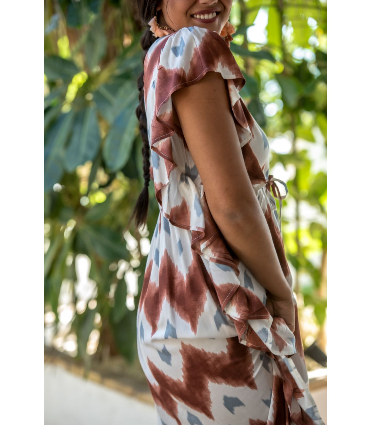 Vestido malta túnica estampado zigzag en tonos cazuela y gris sobre fondo beige con volantes laterales. CALIDAD: 100% VISCOSE